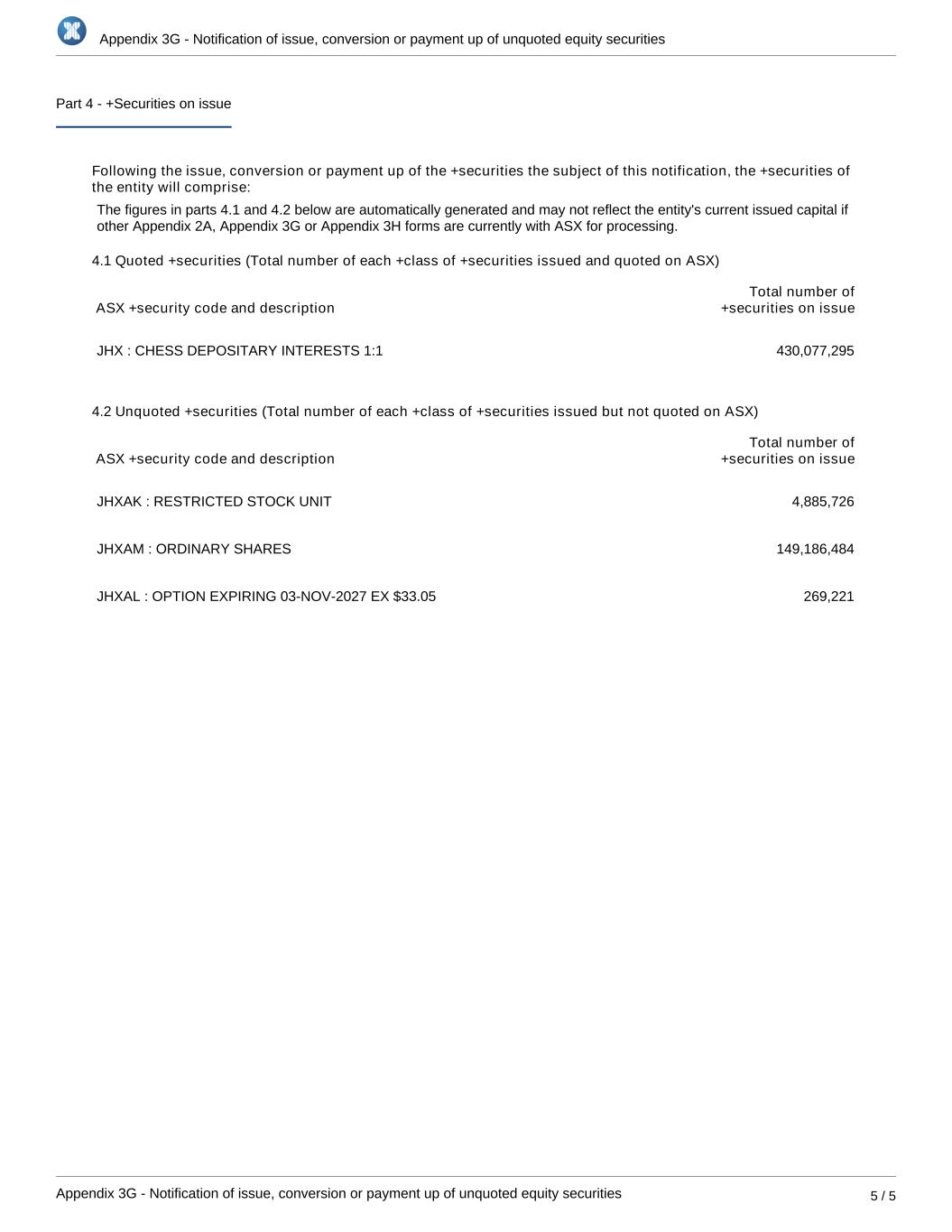 Appendix 3G - Notification of issue, conversion or payment up of unquoted equity securities Appendix 3G - Notification of issue, conversion or payment up of unquoted equity securities 5 / 5 Part 4 - +Securities on issue Following the issue, conversion or payment up of the +securities the subject of this notification, the +securities of the entity will comprise: The figures in parts 4.1 and 4.2 below are automatically generated and may not reflect the entity's current issued capital if other Appendix 2A, Appendix 3G or Appendix 3H forms are currently with ASX for processing. 4.1 Quoted +securities (Total number of each +class of +securities issued and quoted on ASX) ASX +security code and description Total number of +securities on issue JHX : CHESS DEPOSITARY INTERESTS 1:1 430,077,295 4.2 Unquoted +securities (Total number of each +class of +securities issued but not quoted on ASX) ASX +security code and description Total number of +securities on issue JHXAK : RESTRICTED STOCK UNIT 4,885,726 JHXAM : ORDINARY SHARES 149,186,484 JHXAL : OPTION EXPIRING 03-NOV-2027 EX $33.05 269,221