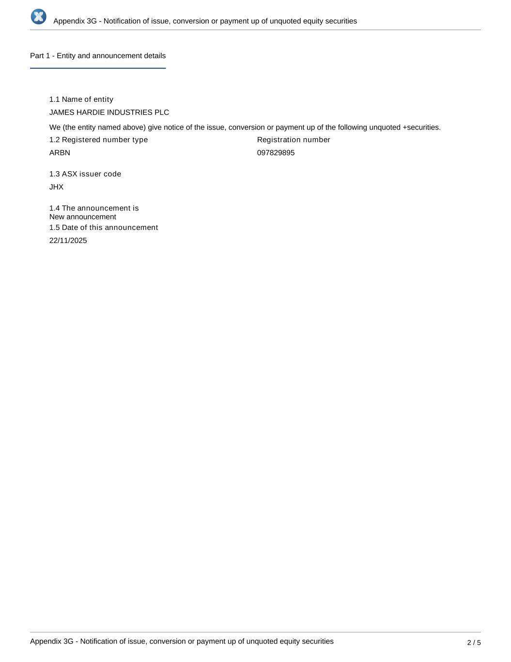 Appendix 3G - Notification of issue, conversion or payment up of unquoted equity securities Appendix 3G - Notification of issue, conversion or payment up of unquoted equity securities 2 / 5 Part 1 - Entity and announcement details 1.1 Name of entity JAMES HARDIE INDUSTRIES PLC We (the entity named above) give notice of the issue, conversion or payment up of the following unquoted +securities. 1.2 Registered number type ARBN Registration number 097829895 1.3 ASX issuer code JHX 1.4 The announcement is 1.5 Date of this announcement 22/11/2025 New announcement