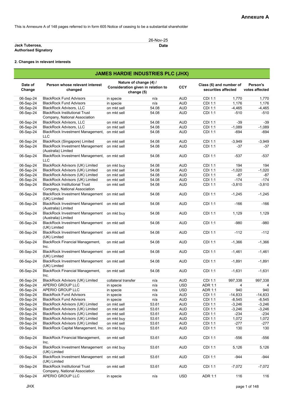 Annexure A This is Annexure A of 148 pages referred to in form 605 Notice of ceasing to be a substantial shareholder 26-Nov-25 Date 2. Changes in relevant interests 06-Sep-24 BlackRock Fund Advisors in specie n/a AUD CDI 1:1 1,770 1,770 06-Sep-24 BlackRock Fund Advisors in specie n/a AUD CDI 1:1 1,176 1,176 06-Sep-24 BlackRock Advisors, LLC on mkt sell 54.08 AUD CDI 1:1 -4,465 -4,465 06-Sep-24 BlackRock Institutional Trust Company, National Association on mkt sell 54.08 AUD CDI 1:1 -510 -510 06-Sep-24 BlackRock Advisors, LLC on mkt sell 54.08 AUD CDI 1:1 -39 -39 06-Sep-24 BlackRock Advisors, LLC on mkt sell 54.08 AUD CDI 1:1 -1,089 -1,089 06-Sep-24 BlackRock Investment Management, LLC on mkt sell 54.08 AUD CDI 1:1 -694 -694 06-Sep-24 BlackRock (Singapore) Limited on mkt sell 54.08 AUD CDI 1:1 -3,949 -3,949 06-Sep-24 BlackRock Investment Management (Australia) Limited on mkt sell 54.08 AUD CDI 1:1 -37 -37 06-Sep-24 BlackRock Investment Management, LLC on mkt sell 54.08 AUD CDI 1:1 -537 -537 06-Sep-24 BlackRock Advisors (UK) Limited on mkt buy 54.08 AUD CDI 1:1 194 194 06-Sep-24 BlackRock Advisors (UK) Limited on mkt sell 54.08 AUD CDI 1:1 -1,020 -1,020 06-Sep-24 BlackRock Advisors (UK) Limited on mkt sell 54.08 AUD CDI 1:1 -87 -87 06-Sep-24 BlackRock Advisors (UK) Limited on mkt sell 54.08 AUD CDI 1:1 -174 -174 06-Sep-24 BlackRock Institutional Trust Company, National Association on mkt sell 54.08 AUD CDI 1:1 -3,810 -3,810 06-Sep-24 BlackRock Investment Management (UK) Limited on mkt sell 54.08 AUD CDI 1:1 -1,245 -1,245 06-Sep-24 BlackRock Investment Management (Australia) Limited on mkt sell 54.08 AUD CDI 1:1 -166 -166 06-Sep-24 BlackRock Investment Management (Australia) Limited on mkt buy 54.08 AUD CDI 1:1 1,129 1,129 06-Sep-24 BlackRock Investment Management (UK) Limited on mkt sell 54.08 AUD CDI 1:1 -980 -980 06-Sep-24 BlackRock Investment Management (UK) Limited on mkt sell 54.08 AUD CDI 1:1 -112 -112 06-Sep-24 BlackRock Financial Management, Inc. on mkt sell 54.08 AUD CDI 1:1 -1,366 -1,366 06-Sep-24 BlackRock Investment Management (UK) Limited on mkt sell 54.08 AUD CDI 1:1 -1,461 -1,461 06-Sep-24 BlackRock Investment Management (UK) Limited on mkt sell 54.08 AUD CDI 1:1 -1,891 -1,891 06-Sep-24 BlackRock Financial Management, Inc. on mkt sell 54.08 AUD CDI 1:1 -1,631 -1,631 06-Sep-24 BlackRock Advisors (UK) Limited collateral transfer n/a AUD CDI 1:1 997,338 997,338 06-Sep-24 APERIO GROUP LLC in specie n/a USD ADR 1:1 4 4 06-Sep-24 APERIO GROUP LLC in specie n/a USD ADR 1:1 940 940 09-Sep-24 BlackRock Fund Advisors in specie n/a AUD CDI 1:1 -14,833 -14,833 09-Sep-24 BlackRock Fund Advisors in specie n/a AUD CDI 1:1 -8,545 -8,545 09-Sep-24 BlackRock Advisors (UK) Limited on mkt sell 53.61 AUD CDI 1:1 -3,246 -3,246 09-Sep-24 BlackRock Advisors (UK) Limited on mkt sell 53.61 AUD CDI 1:1 -3,246 -3,246 09-Sep-24 BlackRock Advisors (UK) Limited on mkt sell 53.61 AUD CDI 1:1 -234 -234 09-Sep-24 BlackRock Advisors (UK) Limited on mkt buy 53.61 AUD CDI 1:1 1,072 1,072 09-Sep-24 BlackRock Advisors (UK) Limited on mkt sell 53.61 AUD CDI 1:1 -277 -277 09-Sep-24 BlackRock Capital Management, Inc. on mkt buy 53.61 AUD CDI 1:1 130 130 09-Sep-24 BlackRock Financial Management, Inc. on mkt sell 53.61 AUD CDI 1:1 -556 -556 09-Sep-24 BlackRock Investment Management (UK) Limited on mkt buy 53.61 AUD CDI 1:1 5,126 5,126 09-Sep-24 BlackRock Investment Management (UK) Limited on mkt sell 53.61 AUD CDI 1:1 -944 -944 09-Sep-24 BlackRock Institutional Trust Company, National Association on mkt sell 53.61 AUD CDI 1:1 -7,072 -7,072 09-Sep-24 APERIO GROUP LLC in specie n/a USD ADR 1:1 116 116 Jack Tuberosa, Authorised Signatory JAMES HARDIE INDUSTRIES PLC (JHX) Date of Change Person whose relevant interest changed Nature of change (4) / Consideration given in relation to change (5) Class (6) and number of securities affected Person's votes affected CCY JHX page 1 of 148