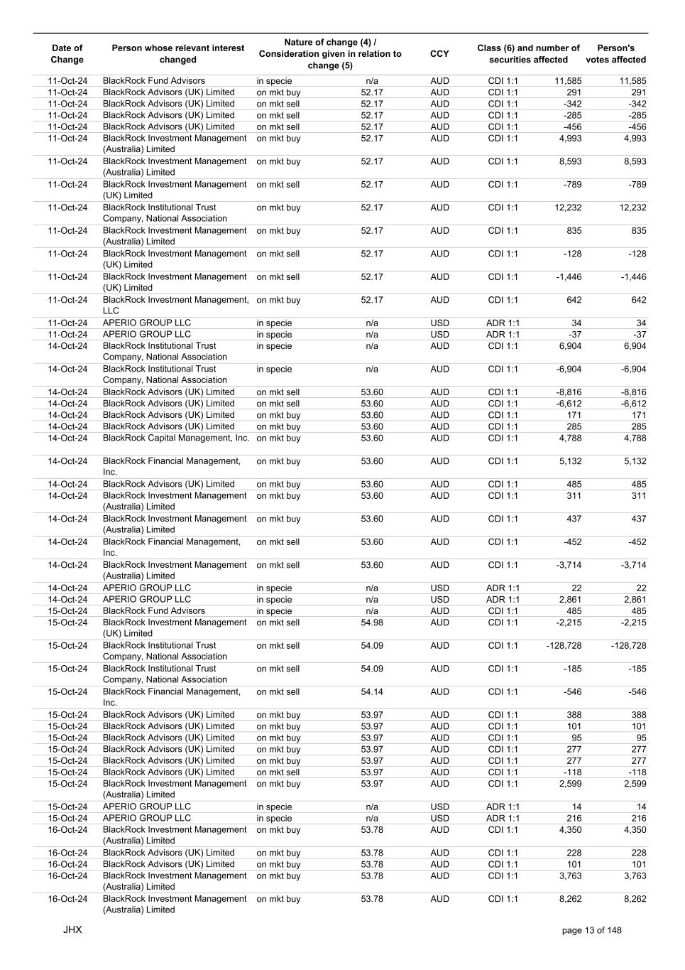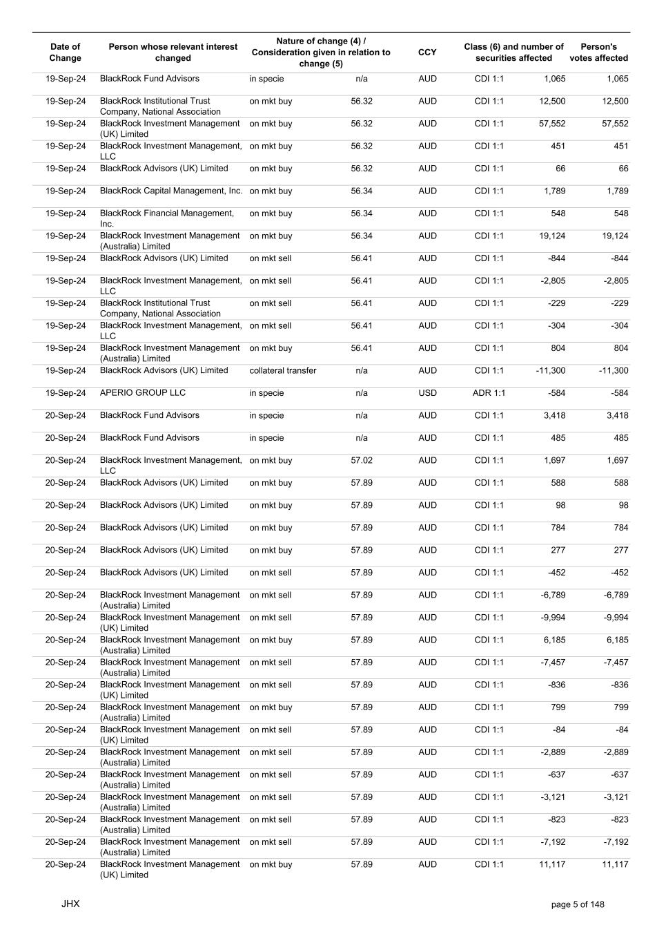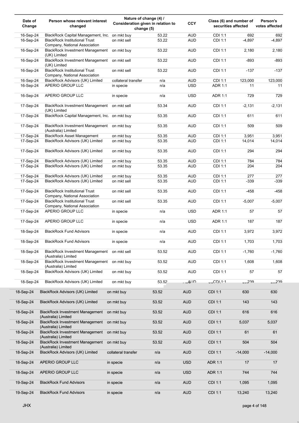 Date of Change Person whose relevant interest changed Nature of change (4) / Consideration given in relation to change (5) Class (6) and number of securities affected Person's votes affected CCY 12-Sep-24 BlackRock Advisors, LLC on mkt sell 53.31 AUD CDI 1:1 -34 -34 12-Sep-24 BlackRock Advisors, LLC on mkt sell 53.31 AUD CDI 1:1 -1,084 -1,084 12-Sep-24 BlackRock Investment Management, LLC on mkt sell 53.31 AUD CDI 1:1 -678 -678 12-Sep-24 BlackRock (Singapore) Limited on mkt sell 53.31 AUD CDI 1:1 -3,436 -3,436 12-Sep-24 BlackRock Investment Management (Australia) Limited on mkt sell 53.31 AUD CDI 1:1 -51 -51 12-Sep-24 BlackRock Investment Management, LLC on mkt sell 53.31 AUD CDI 1:1 -505 -505 12-Sep-24 BlackRock Investment Management (Australia) Limited on mkt buy 53.27 AUD CDI 1:1 4,400 4,400 12-Sep-24 BlackRock Advisors (UK) Limited on mkt buy 53.27 AUD CDI 1:1 291 291 12-Sep-24 BlackRock Advisors (UK) Limited on mkt buy 53.27 AUD CDI 1:1 388 388 12-Sep-24 BlackRock Advisors (UK) Limited on mkt buy 53.27 AUD CDI 1:1 485 485 12-Sep-24 BlackRock Advisors (UK) Limited on mkt buy 53.27 AUD CDI 1:1 1,067 1,067 12-Sep-24 BlackRock Advisors (UK) Limited on mkt sell 53.27 AUD CDI 1:1 -96 -96 12-Sep-24 BlackRock Advisors (UK) Limited on mkt sell 53.27 AUD CDI 1:1 -216 -216 12-Sep-24 BlackRock Fund Advisors in specie n/a AUD CDI 1:1 1,240 1,240 12-Sep-24 BlackRock Advisors (UK) Limited collateral transfer n/a AUD CDI 1:1 -916,306 -916,306 12-Sep-24 APERIO GROUP LLC in specie n/a USD ADR 1:1 29 29 12-Sep-24 APERIO GROUP LLC in specie n/a USD ADR 1:1 2,355 2,355 13-Sep-24 BlackRock Fund Advisors in specie n/a AUD CDI 1:1 220 220 13-Sep-24 BlackRock Investment Management (UK) Limited on mkt sell 53.55 AUD CDI 1:1 -4,337 -4,337 13-Sep-24 BlackRock Institutional Trust Company, National Association on mkt sell 53.21 AUD CDI 1:1 -1,775 -1,775 13-Sep-24 BlackRock Advisors (UK) Limited on mkt sell 53.21 AUD CDI 1:1 -558 -558 13-Sep-24 BlackRock Investment Management (Australia) Limited on mkt buy 53.21 AUD CDI 1:1 4,957 4,957 13-Sep-24 BlackRock Advisors, LLC on mkt sell 53.21 AUD CDI 1:1 -30 -30 13-Sep-24 BlackRock Investment Management (Australia) Limited on mkt buy 53.21 AUD CDI 1:1 4,358 4,358 13-Sep-24 BlackRock Investment Management (Australia) Limited on mkt buy 53.21 AUD CDI 1:1 313 313 13-Sep-24 BlackRock Financial Management, Inc. on mkt sell 53.21 AUD CDI 1:1 -1,366 -1,366 13-Sep-24 BlackRock Financial Management, Inc. on mkt sell 53.21 AUD CDI 1:1 -2,176 -2,176 13-Sep-24 BlackRock Investment Management, LLC on mkt sell 53.21 AUD CDI 1:1 -2,623 -2,623 13-Sep-24 BlackRock Institutional Trust Company, National Association on mkt sell 53.21 AUD CDI 1:1 -287 -287 13-Sep-24 BlackRock Investment Management, LLC on mkt sell 53.21 AUD CDI 1:1 -592 -592 13-Sep-24 BlackRock Financial Management, Inc. on mkt sell 53.21 AUD CDI 1:1 -2,422 -2,422 13-Sep-24 BlackRock Institutional Trust Company, National Association on mkt sell 53.21 AUD CDI 1:1 -423 -423 13-Sep-24 APERIO GROUP LLC in specie n/a USD ADR 1:1 21 21 13-Sep-24 APERIO GROUP LLC in specie n/a USD ADR 1:1 -1,793 -1,793 16-Sep-24 BlackRock Fund Advisors in specie n/a AUD CDI 1:1 1,917 1,917 16-Sep-24 BlackRock Advisors (UK) Limited on mkt buy 53.22 AUD CDI 1:1 1,079 1,079 16-Sep-24 BlackRock Advisors (UK) Limited on mkt sell 53.22 AUD CDI 1:1 -1,079 -1,079 16-Sep-24 BlackRock Advisors (UK) Limited on mkt sell 53.22 AUD CDI 1:1 -1,079 -1,079 16-Sep-24 BlackRock Advisors (UK) Limited on mkt buy 53.22 AUD CDI 1:1 194 194 JHX page 3 of 148