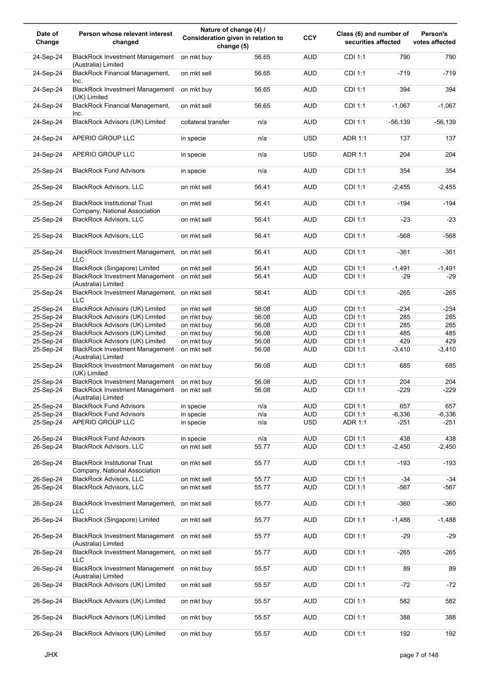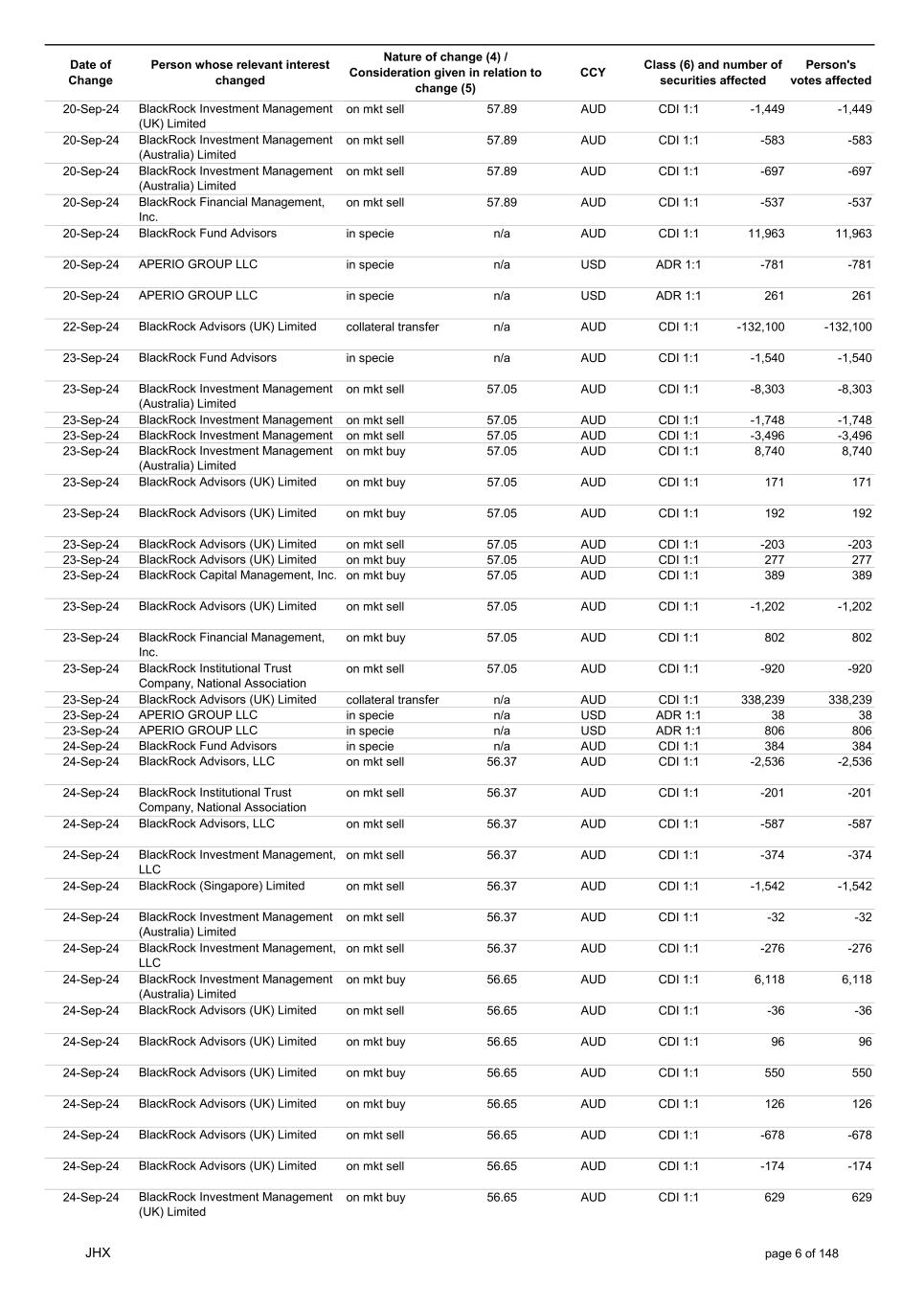 Date of Change Person whose relevant interest changed Nature of change (4) / Consideration given in relation to change (5) Class (6) and number of securities affected Person's votes affected CCY 20-Sep-24 BlackRock Investment Management (UK) Limited on mkt sell 57.89 AUD CDI 1:1 -1,449 -1,449 20-Sep-24 BlackRock Investment Management (Australia) Limited on mkt sell 57.89 AUD CDI 1:1 -583 -583 20-Sep-24 BlackRock Investment Management (Australia) Limited on mkt sell 57.89 AUD CDI 1:1 -697 -697 20-Sep-24 BlackRock Financial Management, Inc. on mkt sell 57.89 AUD CDI 1:1 -537 -537 20-Sep-24 BlackRock Fund Advisors in specie n/a AUD CDI 1:1 11,963 11,963 20-Sep-24 APERIO GROUP LLC in specie n/a USD ADR 1:1 -781 -781 20-Sep-24 APERIO GROUP LLC in specie n/a USD ADR 1:1 261 261 22-Sep-24 BlackRock Advisors (UK) Limited collateral transfer n/a AUD CDI 1:1 -132,100 -132,100 23-Sep-24 BlackRock Fund Advisors in specie n/a AUD CDI 1:1 -1,540 -1,540 23-Sep-24 BlackRock Investment Management (Australia) Limited on mkt sell 57.05 AUD CDI 1:1 -8,303 -8,303 23-Sep-24 BlackRock Investment Management on mkt sell 57.05 AUD CDI 1:1 -1,748 -1,748 23-Sep-24 BlackRock Investment Management on mkt sell 57.05 AUD CDI 1:1 -3,496 -3,496 23-Sep-24 BlackRock Investment Management (Australia) Limited on mkt buy 57.05 AUD CDI 1:1 8,740 8,740 23-Sep-24 BlackRock Advisors (UK) Limited on mkt buy 57.05 AUD CDI 1:1 171 171 23-Sep-24 BlackRock Advisors (UK) Limited on mkt buy 57.05 AUD CDI 1:1 192 192 23-Sep-24 BlackRock Advisors (UK) Limited on mkt sell 57.05 AUD CDI 1:1 -203 -203 23-Sep-24 BlackRock Advisors (UK) Limited on mkt buy 57.05 AUD CDI 1:1 277 277 23-Sep-24 BlackRock Capital Management, Inc. on mkt buy 57.05 AUD CDI 1:1 389 389 23-Sep-24 BlackRock Advisors (UK) Limited on mkt sell 57.05 AUD CDI 1:1 -1,202 -1,202 23-Sep-24 BlackRock Financial Management, Inc. on mkt buy 57.05 AUD CDI 1:1 802 802 23-Sep-24 BlackRock Institutional Trust Company, National Association on mkt sell 57.05 AUD CDI 1:1 -920 -920 23-Sep-24 BlackRock Advisors (UK) Limited collateral transfer n/a AUD CDI 1:1 338,239 338,239 23-Sep-24 APERIO GROUP LLC in specie n/a USD ADR 1:1 38 38 23-Sep-24 APERIO GROUP LLC in specie n/a USD ADR 1:1 806 806 24-Sep-24 BlackRock Fund Advisors in specie n/a AUD CDI 1:1 384 384 24-Sep-24 BlackRock Advisors, LLC on mkt sell 56.37 AUD CDI 1:1 -2,536 -2,536 24-Sep-24 BlackRock Institutional Trust Company, National Association on mkt sell 56.37 AUD CDI 1:1 -201 -201 24-Sep-24 BlackRock Advisors, LLC on mkt sell 56.37 AUD CDI 1:1 -587 -587 24-Sep-24 BlackRock Investment Management, LLC on mkt sell 56.37 AUD CDI 1:1 -374 -374 24-Sep-24 BlackRock (Singapore) Limited on mkt sell 56.37 AUD CDI 1:1 -1,542 -1,542 24-Sep-24 BlackRock Investment Management (Australia) Limited on mkt sell 56.37 AUD CDI 1:1 -32 -32 24-Sep-24 BlackRock Investment Management, LLC on mkt sell 56.37 AUD CDI 1:1 -276 -276 24-Sep-24 BlackRock Investment Management (Australia) Limited on mkt buy 56.65 AUD CDI 1:1 6,118 6,118 24-Sep-24 BlackRock Advisors (UK) Limited on mkt sell 56.65 AUD CDI 1:1 -36 -36 24-Sep-24 BlackRock Advisors (UK) Limited on mkt buy 56.65 AUD CDI 1:1 96 96 24-Sep-24 BlackRock Advisors (UK) Limited on mkt buy 56.65 AUD CDI 1:1 550 550 24-Sep-24 BlackRock Advisors (UK) Limited on mkt buy 56.65 AUD CDI 1:1 126 126 24-Sep-24 BlackRock Advisors (UK) Limited on mkt sell 56.65 AUD CDI 1:1 -678 -678 24-Sep-24 BlackRock Advisors (UK) Limited on mkt sell 56.65 AUD CDI 1:1 -174 -174 24-Sep-24 BlackRock Investment Management (UK) Limited on mkt buy 56.65 AUD CDI 1:1 629 629 JHX page 6 of 148