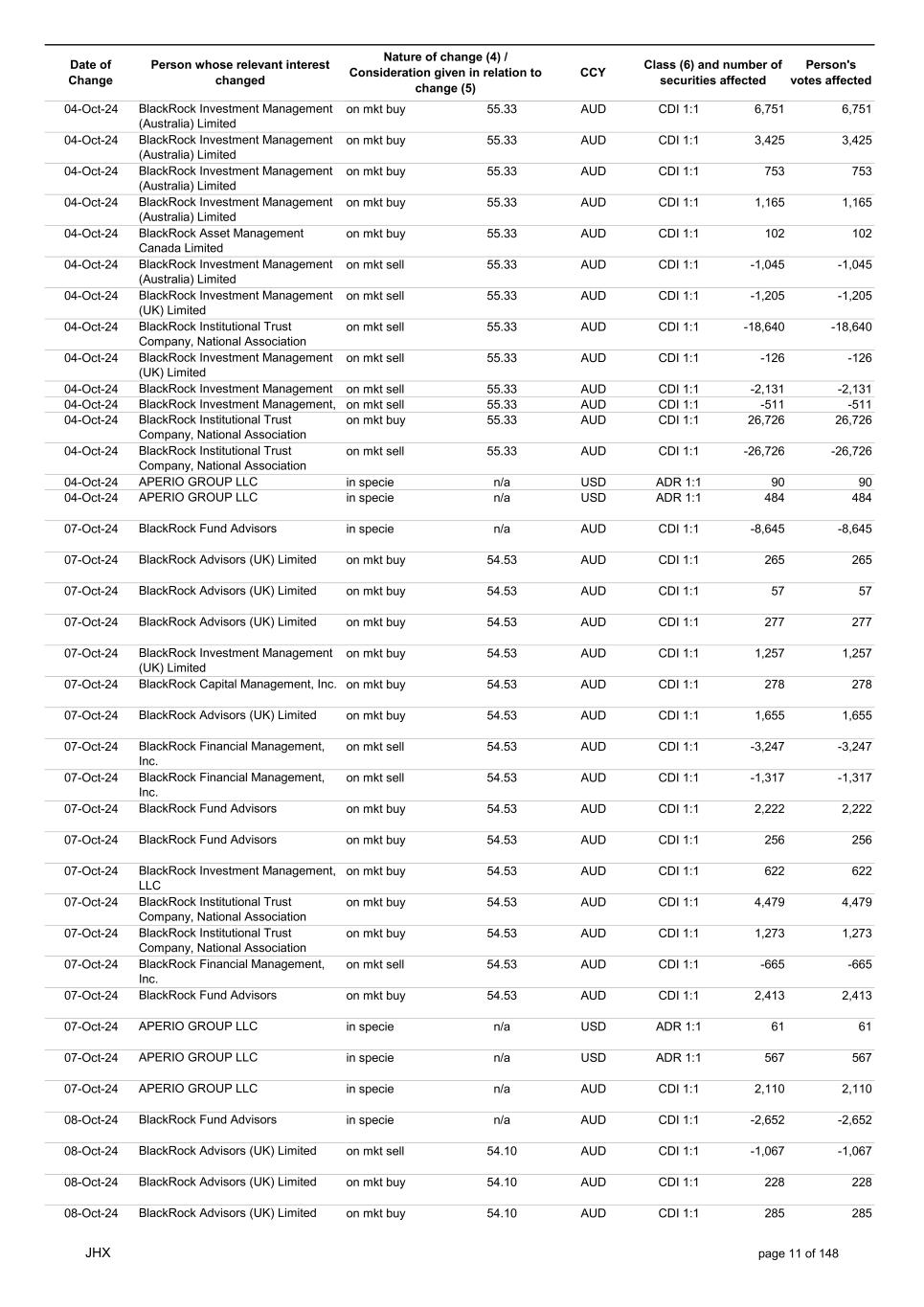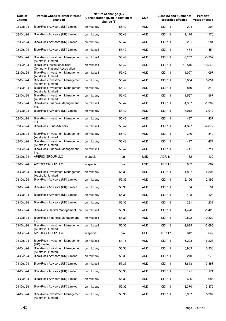 Date of Change Person whose relevant interest changed Nature of change (4) / Consideration given in relation to change (5) Class (6) and number of securities affected Person's votes affected CCY 30-Sep-24 BlackRock Advisors (UK) Limited on mkt sell 57.43 AUD CDI 1:1 -38,899 -38,899 30-Sep-24 BlackRock Fund Advisors on mkt sell 57.43 AUD CDI 1:1 -115,654 -115,654 30-Sep-24 BlackRock Investment Management (UK) Limited on mkt sell 57.43 AUD CDI 1:1 -16,164 -16,164 30-Sep-24 BlackRock Investment Management (Australia) Limited on mkt buy 57.43 AUD CDI 1:1 4,370 4,370 30-Sep-24 BlackRock Advisors (UK) Limited on mkt sell 57.43 AUD CDI 1:1 -3,228 -3,228 30-Sep-24 BlackRock Advisors (UK) Limited on mkt buy 57.43 AUD CDI 1:1 192 192 30-Sep-24 BlackRock Advisors (UK) Limited on mkt sell 57.43 AUD CDI 1:1 -441 -441 30-Sep-24 BlackRock Investment Management (UK) Limited on mkt buy 57.43 AUD CDI 1:1 658 658 30-Sep-24 BlackRock Investment Management (UK) Limited on mkt buy 57.43 AUD CDI 1:1 214 214 30-Sep-24 BlackRock Investment Management (Australia) Limited on mkt sell 57.43 AUD CDI 1:1 -295 -295 30-Sep-24 BlackRock Financial Management, Inc. on mkt sell 57.43 AUD CDI 1:1 -1,416 -1,416 30-Sep-24 BlackRock Fund Advisors on mkt buy 57.43 AUD CDI 1:1 2,157 2,157 30-Sep-24 BlackRock Fund Advisors on mkt buy 57.43 AUD CDI 1:1 1,658 1,658 30-Sep-24 BlackRock Institutional Trust Company, National Association on mkt buy 57.43 AUD CDI 1:1 4,731 4,731 30-Sep-24 BlackRock Institutional Trust Company, National Association on mkt sell 57.43 AUD CDI 1:1 -540 -540 30-Sep-24 BlackRock Fund Advisors on mkt sell 57.43 AUD CDI 1:1 -5,419 -5,419 30-Sep-24 BlackRock Institutional Trust Company, National Association on mkt buy 57.43 AUD CDI 1:1 1,228 1,228 30-Sep-24 APERIO GROUP LLC in specie n/a USD ADR 1:1 42 42 30-Sep-24 APERIO GROUP LLC in specie n/a USD ADR 1:1 3,449 3,449 01-Oct-24 BlackRock Fund Advisors in specie n/a AUD CDI 1:1 35 35 01-Oct-24 BlackRock Advisors (UK) Limited on mkt buy 56.42 AUD CDI 1:1 2,186 2,186 01-Oct-24 BlackRock Advisors (UK) Limited on mkt buy 56.42 AUD CDI 1:1 228 228 01-Oct-24 BlackRock Investment Management (Australia) Limited on mkt buy 56.42 AUD CDI 1:1 725 725 01-Oct-24 BlackRock Investment Management (Australia) Limited on mkt buy 56.42 AUD CDI 1:1 882 882 01-Oct-24 BlackRock Investment Management (Australia) Limited on mkt buy 56.42 AUD CDI 1:1 1,239 1,239 01-Oct-24 BlackRock Institutional Trust Company, National Association on mkt buy 56.42 AUD CDI 1:1 3,397 3,397 01-Oct-24 BlackRock Fund Advisors on mkt buy 56.42 AUD CDI 1:1 1,834 1,834 01-Oct-24 BlackRock Institutional Trust Company, National Association on mkt sell 56.42 AUD CDI 1:1 -4,722 -4,722 01-Oct-24 BlackRock Institutional Trust Company, National Association on mkt sell 56.42 AUD CDI 1:1 -1,280 -1,280 01-Oct-24 APERIO GROUP LLC in specie n/a USD ADR 1:1 123 123 02-Oct-24 BlackRock Fund Advisors in specie n/a AUD CDI 1:1 1,290 1,290 02-Oct-24 BlackRock Investment Management (UK) Limited on mkt sell 55.91 AUD CDI 1:1 -1,888 -1,888 02-Oct-24 BlackRock Advisors (UK) Limited on mkt buy 55.42 AUD CDI 1:1 1,096 1,096 02-Oct-24 BlackRock Advisors (UK) Limited on mkt buy 55.42 AUD CDI 1:1 1,096 1,096 02-Oct-24 BlackRock Advisors (UK) Limited on mkt buy 55.42 AUD CDI 1:1 1,096 1,096 02-Oct-24 BlackRock Advisors (UK) Limited on mkt buy 55.42 AUD CDI 1:1 2,192 2,192 JHX page 9 of 148