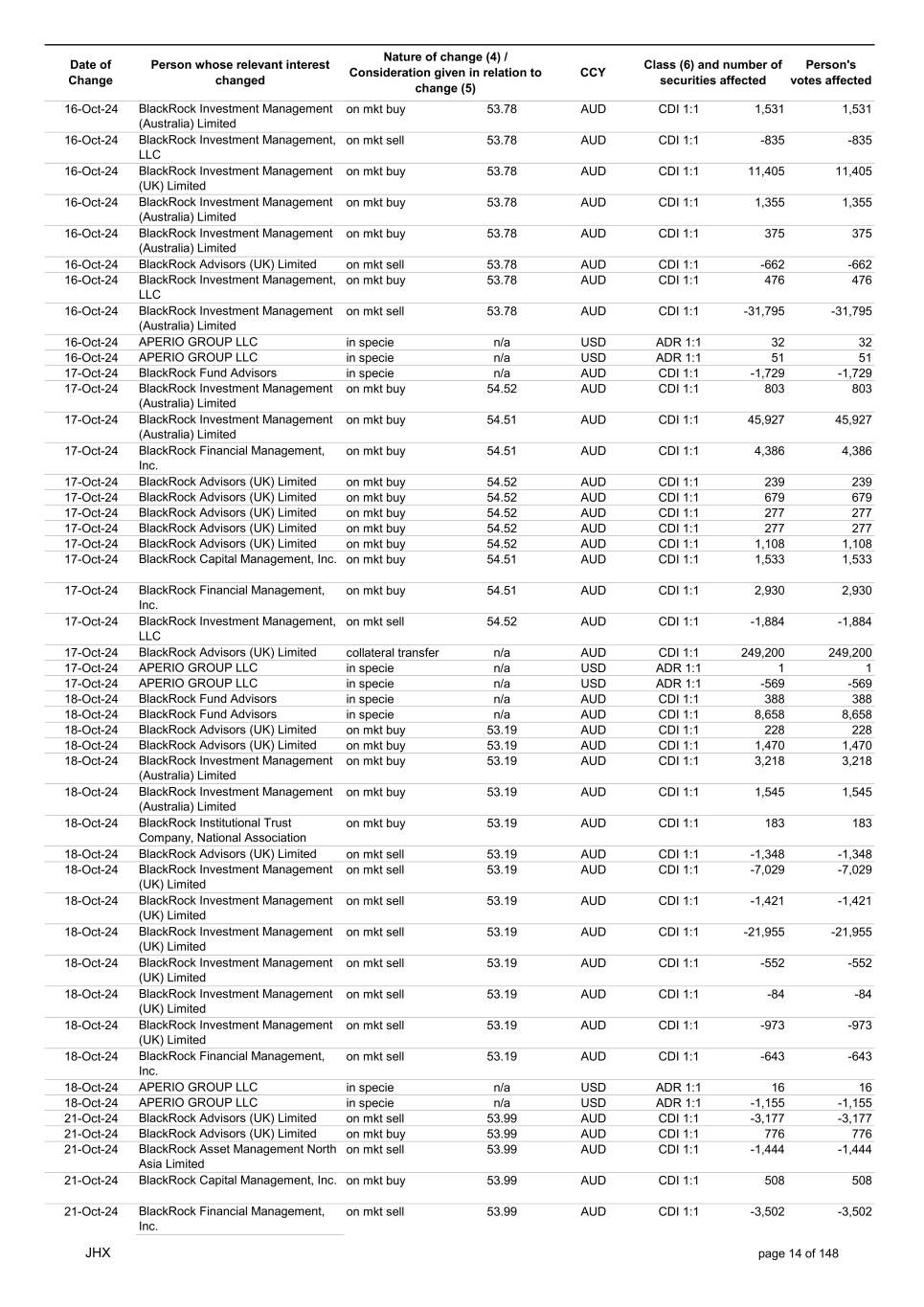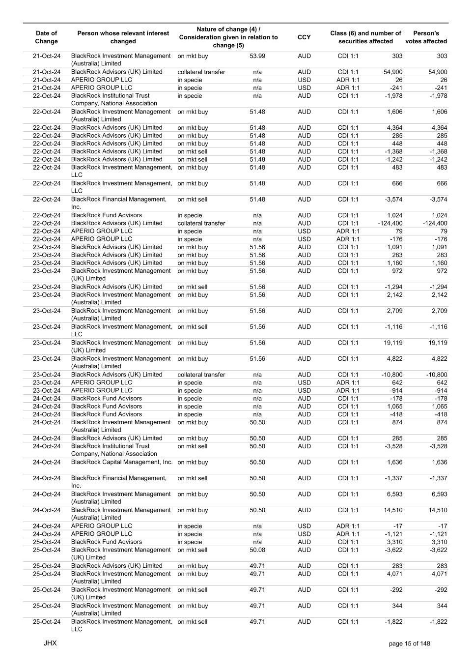 Date of Change Person whose relevant interest changed Nature of change (4) / Consideration given in relation to change (5) Class (6) and number of securities affected Person's votes affected CCY 21-Oct-24 BlackRock Investment Management (Australia) Limited on mkt buy 53.99 AUD CDI 1:1 303 303 21-Oct-24 BlackRock Advisors (UK) Limited collateral transfer n/a AUD CDI 1:1 54,900 54,900 21-Oct-24 APERIO GROUP LLC in specie n/a USD ADR 1:1 26 26 21-Oct-24 APERIO GROUP LLC in specie n/a USD ADR 1:1 -241 -241 22-Oct-24 BlackRock Institutional Trust Company, National Association in specie n/a AUD CDI 1:1 -1,978 -1,978 22-Oct-24 BlackRock Investment Management (Australia) Limited on mkt buy 51.48 AUD CDI 1:1 1,606 1,606 22-Oct-24 BlackRock Advisors (UK) Limited on mkt buy 51.48 AUD CDI 1:1 4,364 4,364 22-Oct-24 BlackRock Advisors (UK) Limited on mkt buy 51.48 AUD CDI 1:1 285 285 22-Oct-24 BlackRock Advisors (UK) Limited on mkt buy 51.48 AUD CDI 1:1 448 448 22-Oct-24 BlackRock Advisors (UK) Limited on mkt sell 51.48 AUD CDI 1:1 -1,368 -1,368 22-Oct-24 BlackRock Advisors (UK) Limited on mkt sell 51.48 AUD CDI 1:1 -1,242 -1,242 22-Oct-24 BlackRock Investment Management, LLC on mkt buy 51.48 AUD CDI 1:1 483 483 22-Oct-24 BlackRock Investment Management, LLC on mkt buy 51.48 AUD CDI 1:1 666 666 22-Oct-24 BlackRock Financial Management, Inc. on mkt sell 51.48 AUD CDI 1:1 -3,574 -3,574 22-Oct-24 BlackRock Fund Advisors in specie n/a AUD CDI 1:1 1,024 1,024 22-Oct-24 BlackRock Advisors (UK) Limited collateral transfer n/a AUD CDI 1:1 -124,400 -124,400 22-Oct-24 APERIO GROUP LLC in specie n/a USD ADR 1:1 79 79 22-Oct-24 APERIO GROUP LLC in specie n/a USD ADR 1:1 -176 -176 23-Oct-24 BlackRock Advisors (UK) Limited on mkt buy 51.56 AUD CDI 1:1 1,091 1,091 23-Oct-24 BlackRock Advisors (UK) Limited on mkt buy 51.56 AUD CDI 1:1 283 283 23-Oct-24 BlackRock Advisors (UK) Limited on mkt buy 51.56 AUD CDI 1:1 1,160 1,160 23-Oct-24 BlackRock Investment Management (UK) Limited on mkt buy 51.56 AUD CDI 1:1 972 972 23-Oct-24 BlackRock Advisors (UK) Limited on mkt sell 51.56 AUD CDI 1:1 -1,294 -1,294 23-Oct-24 BlackRock Investment Management (Australia) Limited on mkt buy 51.56 AUD CDI 1:1 2,142 2,142 23-Oct-24 BlackRock Investment Management (Australia) Limited on mkt buy 51.56 AUD CDI 1:1 2,709 2,709 23-Oct-24 BlackRock Investment Management, LLC on mkt sell 51.56 AUD CDI 1:1 -1,116 -1,116 23-Oct-24 BlackRock Investment Management (UK) Limited on mkt buy 51.56 AUD CDI 1:1 19,119 19,119 23-Oct-24 BlackRock Investment Management (Australia) Limited on mkt buy 51.56 AUD CDI 1:1 4,822 4,822 23-Oct-24 BlackRock Advisors (UK) Limited collateral transfer n/a AUD CDI 1:1 -10,800 -10,800 23-Oct-24 APERIO GROUP LLC in specie n/a USD ADR 1:1 642 642 23-Oct-24 APERIO GROUP LLC in specie n/a USD ADR 1:1 -914 -914 24-Oct-24 BlackRock Fund Advisors in specie n/a AUD CDI 1:1 -178 -178 24-Oct-24 BlackRock Fund Advisors in specie n/a AUD CDI 1:1 1,065 1,065 24-Oct-24 BlackRock Fund Advisors in specie n/a AUD CDI 1:1 -418 -418 24-Oct-24 BlackRock Investment Management (Australia) Limited on mkt buy 50.50 AUD CDI 1:1 874 874 24-Oct-24 BlackRock Advisors (UK) Limited on mkt buy 50.50 AUD CDI 1:1 285 285 24-Oct-24 BlackRock Institutional Trust Company, National Association on mkt sell 50.50 AUD CDI 1:1 -3,528 -3,528 24-Oct-24 BlackRock Capital Management, Inc. on mkt buy 50.50 AUD CDI 1:1 1,636 1,636 24-Oct-24 BlackRock Financial Management, Inc. on mkt sell 50.50 AUD CDI 1:1 -1,337 -1,337 24-Oct-24 BlackRock Investment Management (Australia) Limited on mkt buy 50.50 AUD CDI 1:1 6,593 6,593 24-Oct-24 BlackRock Investment Management (Australia) Limited on mkt buy 50.50 AUD CDI 1:1 14,510 14,510 24-Oct-24 APERIO GROUP LLC in specie n/a USD ADR 1:1 -17 -17 24-Oct-24 APERIO GROUP LLC in specie n/a USD ADR 1:1 -1,121 -1,121 25-Oct-24 BlackRock Fund Advisors in specie n/a AUD CDI 1:1 3,310 3,310 25-Oct-24 BlackRock Investment Management (UK) Limited on mkt sell 50.08 AUD CDI 1:1 -3,622 -3,622 25-Oct-24 BlackRock Advisors (UK) Limited on mkt buy 49.71 AUD CDI 1:1 283 283 25-Oct-24 BlackRock Investment Management (Australia) Limited on mkt buy 49.71 AUD CDI 1:1 4,071 4,071 25-Oct-24 BlackRock Investment Management (UK) Limited on mkt sell 49.71 AUD CDI 1:1 -292 -292 25-Oct-24 BlackRock Investment Management (Australia) Limited on mkt buy 49.71 AUD CDI 1:1 344 344 25-Oct-24 BlackRock Investment Management, LLC on mkt sell 49.71 AUD CDI 1:1 -1,822 -1,822 JHX page 15 of 148