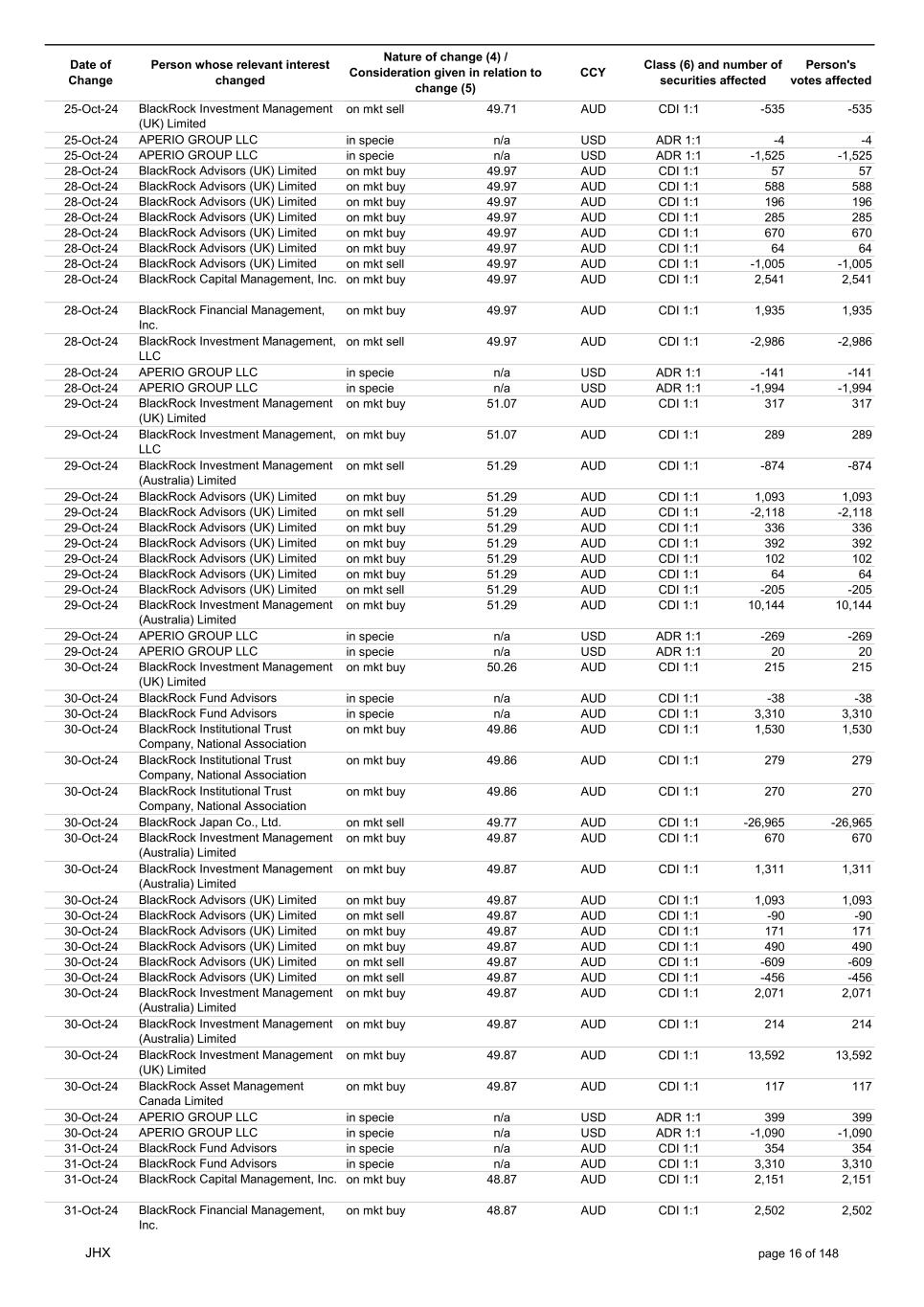 Date of Change Person whose relevant interest changed Nature of change (4) / Consideration given in relation to change (5) Class (6) and number of securities affected Person's votes affected CCY 25-Oct-24 BlackRock Investment Management (UK) Limited on mkt sell 49.71 AUD CDI 1:1 -535 -535 25-Oct-24 APERIO GROUP LLC in specie n/a USD ADR 1:1 -4 -4 25-Oct-24 APERIO GROUP LLC in specie n/a USD ADR 1:1 -1,525 -1,525 28-Oct-24 BlackRock Advisors (UK) Limited on mkt buy 49.97 AUD CDI 1:1 57 57 28-Oct-24 BlackRock Advisors (UK) Limited on mkt buy 49.97 AUD CDI 1:1 588 588 28-Oct-24 BlackRock Advisors (UK) Limited on mkt buy 49.97 AUD CDI 1:1 196 196 28-Oct-24 BlackRock Advisors (UK) Limited on mkt buy 49.97 AUD CDI 1:1 285 285 28-Oct-24 BlackRock Advisors (UK) Limited on mkt buy 49.97 AUD CDI 1:1 670 670 28-Oct-24 BlackRock Advisors (UK) Limited on mkt buy 49.97 AUD CDI 1:1 64 64 28-Oct-24 BlackRock Advisors (UK) Limited on mkt sell 49.97 AUD CDI 1:1 -1,005 -1,005 28-Oct-24 BlackRock Capital Management, Inc. on mkt buy 49.97 AUD CDI 1:1 2,541 2,541 28-Oct-24 BlackRock Financial Management, Inc. on mkt buy 49.97 AUD CDI 1:1 1,935 1,935 28-Oct-24 BlackRock Investment Management, LLC on mkt sell 49.97 AUD CDI 1:1 -2,986 -2,986 28-Oct-24 APERIO GROUP LLC in specie n/a USD ADR 1:1 -141 -141 28-Oct-24 APERIO GROUP LLC in specie n/a USD ADR 1:1 -1,994 -1,994 29-Oct-24 BlackRock Investment Management (UK) Limited on mkt buy 51.07 AUD CDI 1:1 317 317 29-Oct-24 BlackRock Investment Management, LLC on mkt buy 51.07 AUD CDI 1:1 289 289 29-Oct-24 BlackRock Investment Management (Australia) Limited on mkt sell 51.29 AUD CDI 1:1 -874 -874 29-Oct-24 BlackRock Advisors (UK) Limited on mkt buy 51.29 AUD CDI 1:1 1,093 1,093 29-Oct-24 BlackRock Advisors (UK) Limited on mkt sell 51.29 AUD CDI 1:1 -2,118 -2,118 29-Oct-24 BlackRock Advisors (UK) Limited on mkt buy 51.29 AUD CDI 1:1 336 336 29-Oct-24 BlackRock Advisors (UK) Limited on mkt buy 51.29 AUD CDI 1:1 392 392 29-Oct-24 BlackRock Advisors (UK) Limited on mkt buy 51.29 AUD CDI 1:1 102 102 29-Oct-24 BlackRock Advisors (UK) Limited on mkt buy 51.29 AUD CDI 1:1 64 64 29-Oct-24 BlackRock Advisors (UK) Limited on mkt sell 51.29 AUD CDI 1:1 -205 -205 29-Oct-24 BlackRock Investment Management (Australia) Limited on mkt buy 51.29 AUD CDI 1:1 10,144 10,144 29-Oct-24 APERIO GROUP LLC in specie n/a USD ADR 1:1 -269 -269 29-Oct-24 APERIO GROUP LLC in specie n/a USD ADR 1:1 20 20 30-Oct-24 BlackRock Investment Management (UK) Limited on mkt buy 50.26 AUD CDI 1:1 215 215 30-Oct-24 BlackRock Fund Advisors in specie n/a AUD CDI 1:1 -38 -38 30-Oct-24 BlackRock Fund Advisors in specie n/a AUD CDI 1:1 3,310 3,310 30-Oct-24 BlackRock Institutional Trust Company, National Association on mkt buy 49.86 AUD CDI 1:1 1,530 1,530 30-Oct-24 BlackRock Institutional Trust Company, National Association on mkt buy 49.86 AUD CDI 1:1 279 279 30-Oct-24 BlackRock Institutional Trust Company, National Association on mkt buy 49.86 AUD CDI 1:1 270 270 30-Oct-24 BlackRock Japan Co., Ltd. on mkt sell 49.77 AUD CDI 1:1 -26,965 -26,965 30-Oct-24 BlackRock Investment Management (Australia) Limited on mkt buy 49.87 AUD CDI 1:1 670 670 30-Oct-24 BlackRock Investment Management (Australia) Limited on mkt buy 49.87 AUD CDI 1:1 1,311 1,311 30-Oct-24 BlackRock Advisors (UK) Limited on mkt buy 49.87 AUD CDI 1:1 1,093 1,093 30-Oct-24 BlackRock Advisors (UK) Limited on mkt sell 49.87 AUD CDI 1:1 -90 -90 30-Oct-24 BlackRock Advisors (UK) Limited on mkt buy 49.87 AUD CDI 1:1 171 171 30-Oct-24 BlackRock Advisors (UK) Limited on mkt buy 49.87 AUD CDI 1:1 490 490 30-Oct-24 BlackRock Advisors (UK) Limited on mkt sell 49.87 AUD CDI 1:1 -609 -609 30-Oct-24 BlackRock Advisors (UK) Limited on mkt sell 49.87 AUD CDI 1:1 -456 -456 30-Oct-24 BlackRock Investment Management (Australia) Limited on mkt buy 49.87 AUD CDI 1:1 2,071 2,071 30-Oct-24 BlackRock Investment Management (Australia) Limited on mkt buy 49.87 AUD CDI 1:1 214 214 30-Oct-24 BlackRock Investment Management (UK) Limited on mkt buy 49.87 AUD CDI 1:1 13,592 13,592 30-Oct-24 BlackRock Asset Management Canada Limited on mkt buy 49.87 AUD CDI 1:1 117 117 30-Oct-24 APERIO GROUP LLC in specie n/a USD ADR 1:1 399 399 30-Oct-24 APERIO GROUP LLC in specie n/a USD ADR 1:1 -1,090 -1,090 31-Oct-24 BlackRock Fund Advisors in specie n/a AUD CDI 1:1 354 354 31-Oct-24 BlackRock Fund Advisors in specie n/a AUD CDI 1:1 3,310 3,310 31-Oct-24 BlackRock Capital Management, Inc. on mkt buy 48.87 AUD CDI 1:1 2,151 2,151 31-Oct-24 BlackRock Financial Management, Inc. on mkt buy 48.87 AUD CDI 1:1 2,502 2,502 JHX page 16 of 148