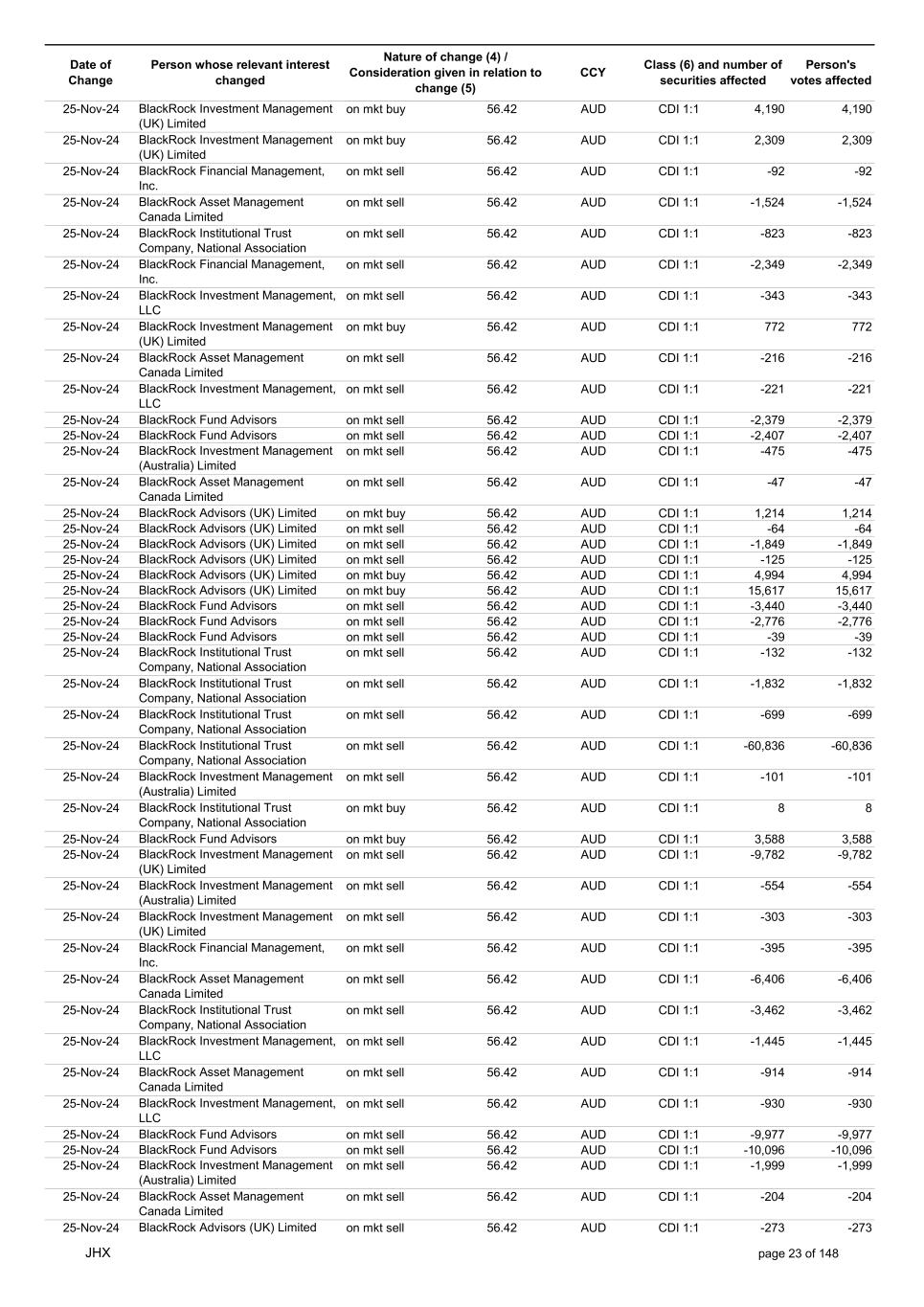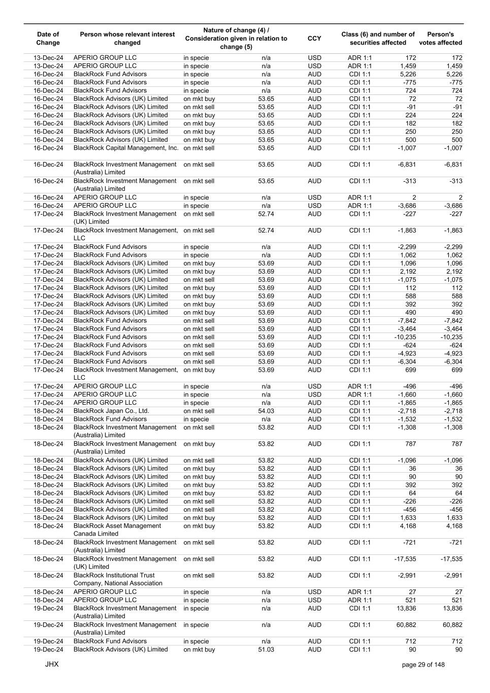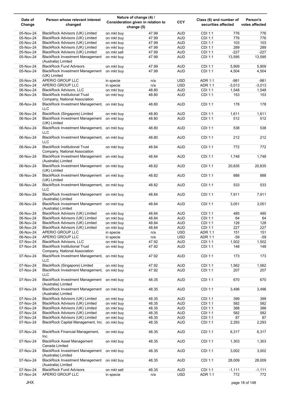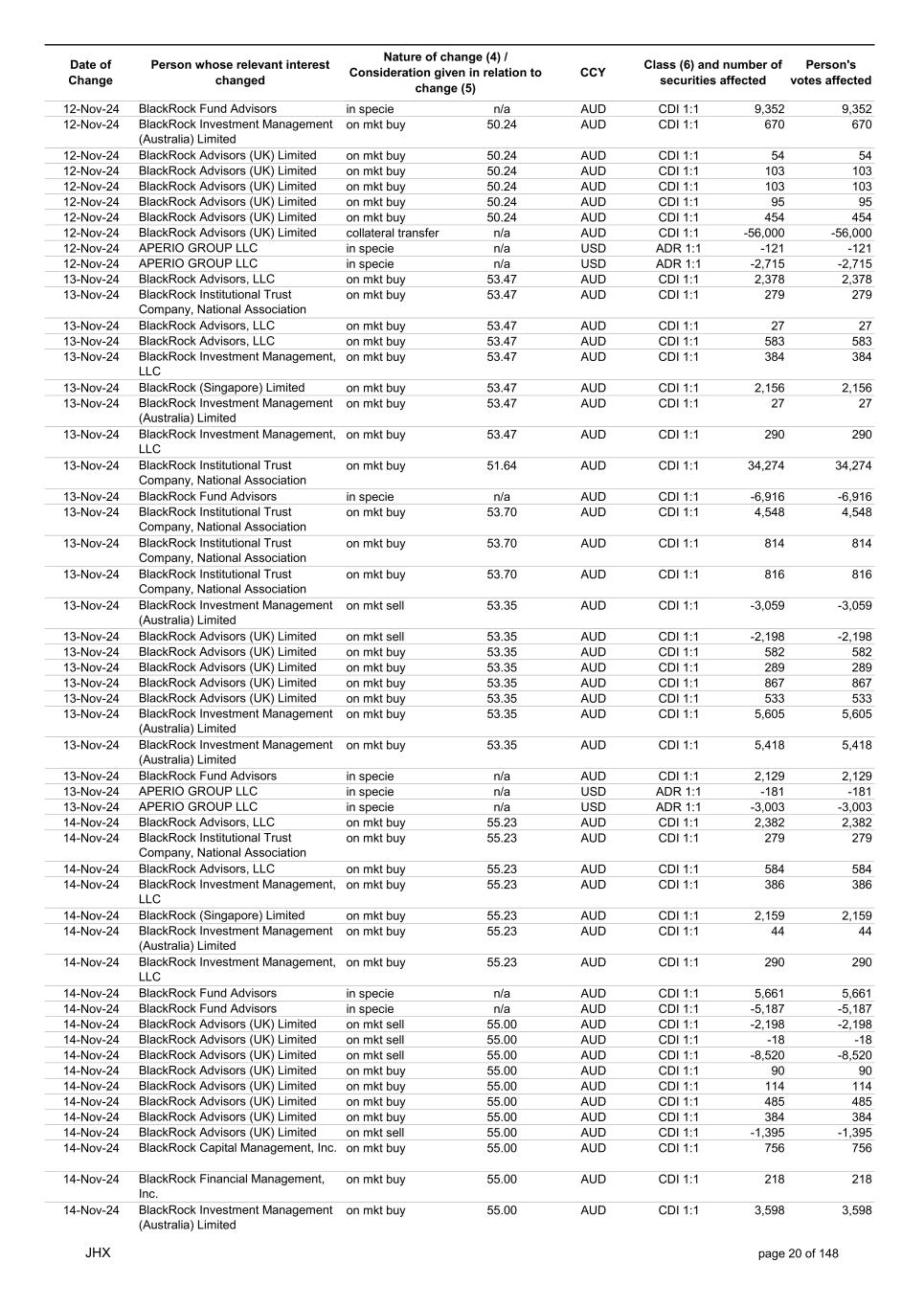 Date of Change Person whose relevant interest changed Nature of change (4) / Consideration given in relation to change (5) Class (6) and number of securities affected Person's votes affected CCY 25-Nov-24 BlackRock Advisors (UK) Limited on mkt sell 56.42 AUD CDI 1:1 -7,775 -7,775 25-Nov-24 BlackRock Advisors (UK) Limited on mkt sell 56.42 AUD CDI 1:1 -527 -527 25-Nov-24 BlackRock Fund Advisors on mkt sell 56.42 AUD CDI 1:1 -14,432 -14,432 25-Nov-24 BlackRock Fund Advisors on mkt sell 56.42 AUD CDI 1:1 -11,647 -11,647 25-Nov-24 BlackRock Fund Advisors on mkt sell 56.42 AUD CDI 1:1 -171 -171 25-Nov-24 BlackRock Institutional Trust Company, National Association on mkt sell 56.42 AUD CDI 1:1 -558 -558 25-Nov-24 BlackRock Institutional Trust Company, National Association on mkt sell 56.42 AUD CDI 1:1 -7,703 -7,703 25-Nov-24 BlackRock Institutional Trust Company, National Association on mkt sell 56.42 AUD CDI 1:1 -2,944 -2,944 25-Nov-24 BlackRock Investment Management (Australia) Limited on mkt sell 56.42 AUD CDI 1:1 -425 -425 25-Nov-24 BlackRock Investment Management (Australia) Limited on mkt buy 56.42 AUD CDI 1:1 4,370 4,370 25-Nov-24 BlackRock Fund Advisors in specie n/a AUD CDI 1:1 976 976 25-Nov-24 APERIO GROUP LLC in specie n/a USD ADR 1:1 29 29 25-Nov-24 APERIO GROUP LLC in specie n/a USD ADR 1:1 1,768 1,768 26-Nov-24 BlackRock Investment Management (UK) Limited on mkt sell 57.82 AUD CDI 1:1 -11 -11 26-Nov-24 BlackRock Investment Management, LLC on mkt sell 57.82 AUD CDI 1:1 -10 -10 26-Nov-24 BlackRock Fund Advisors in specie n/a AUD CDI 1:1 4,270 4,270 26-Nov-24 BlackRock Advisors (UK) Limited on mkt buy 57.60 AUD CDI 1:1 3,279 3,279 26-Nov-24 BlackRock Advisors (UK) Limited on mkt buy 57.60 AUD CDI 1:1 582 582 26-Nov-24 BlackRock Advisors (UK) Limited on mkt buy 57.60 AUD CDI 1:1 1,164 1,164 26-Nov-24 BlackRock Advisors (UK) Limited on mkt buy 57.60 AUD CDI 1:1 485 485 26-Nov-24 BlackRock Advisors (UK) Limited on mkt buy 57.60 AUD CDI 1:1 103 103 26-Nov-24 BlackRock Advisors (UK) Limited on mkt buy 57.60 AUD CDI 1:1 64 64 26-Nov-24 BlackRock Investment Management, LLC on mkt buy 57.60 AUD CDI 1:1 1,152 1,152 26-Nov-24 BlackRock Institutional Trust Company, National Association on mkt sell 57.60 AUD CDI 1:1 -28,235 -28,235 26-Nov-24 BlackRock Fund Advisors in specie n/a AUD CDI 1:1 288 288 26-Nov-24 APERIO GROUP LLC in specie n/a USD ADR 1:1 109 109 26-Nov-24 APERIO GROUP LLC in specie n/a USD ADR 1:1 281 281 27-Nov-24 BlackRock Institutional Trust Company, National Association on mkt sell 56.40 AUD CDI 1:1 -1,092 -1,092 27-Nov-24 BlackRock Institutional Trust Company, National Association on mkt sell 56.40 AUD CDI 1:1 -197 -197 27-Nov-24 BlackRock Institutional Trust Company, National Association on mkt sell 56.40 AUD CDI 1:1 -191 -191 27-Nov-24 BlackRock Advisors (UK) Limited on mkt buy 56.40 AUD CDI 1:1 776 776 27-Nov-24 BlackRock Investment Management (UK) Limited on mkt buy 56.40 AUD CDI 1:1 706 706 27-Nov-24 BlackRock Investment Management (Australia) Limited on mkt sell 56.40 AUD CDI 1:1 -9,553 -9,553 27-Nov-24 BlackRock Investment Management (Australia) Limited on mkt sell 56.40 AUD CDI 1:1 -12,424 -12,424 27-Nov-24 BlackRock Investment Management (Australia) Limited on mkt sell 56.40 AUD CDI 1:1 -1,079 -1,079 27-Nov-24 BlackRock Investment Management (UK) Limited on mkt sell 56.40 AUD CDI 1:1 -10,741 -10,741 27-Nov-24 BlackRock Investment Management, LLC on mkt sell 56.40 AUD CDI 1:1 -1,492 -1,492 27-Nov-24 APERIO GROUP LLC in specie n/a USD ADR 1:1 79,245 79,245 27-Nov-24 APERIO GROUP LLC in specie n/a USD ADR 1:1 787,171 787,171 27-Nov-24 APERIO GROUP LLC in specie n/a AUD CDI 1:1 -17,743 -17,743 27-Nov-24 APERIO GROUP LLC in specie n/a AUD CDI 1:1 251,968 251,968 28-Nov-24 BlackRock Investment Management (Australia) Limited on mkt buy 56.72 AUD CDI 1:1 3,496 3,496 28-Nov-24 BlackRock Investment Management (Australia) Limited on mkt buy 56.72 AUD CDI 1:1 437 437 28-Nov-24 BlackRock Advisors (UK) Limited on mkt sell 56.72 AUD CDI 1:1 -1,240 -1,240 28-Nov-24 BlackRock Capital Management, Inc. on mkt sell 56.72 AUD CDI 1:1 -1,557 -1,557 28-Nov-24 BlackRock Financial Management, Inc. on mkt sell 56.72 AUD CDI 1:1 -1,711 -1,711 28-Nov-24 BlackRock Investment Management (Australia) Limited on mkt sell 56.72 AUD CDI 1:1 -2,231 -2,231 28-Nov-24 BlackRock Investment Management (Australia) Limited on mkt sell 56.72 AUD CDI 1:1 -11,420 -11,420 JHX page 24 of 148