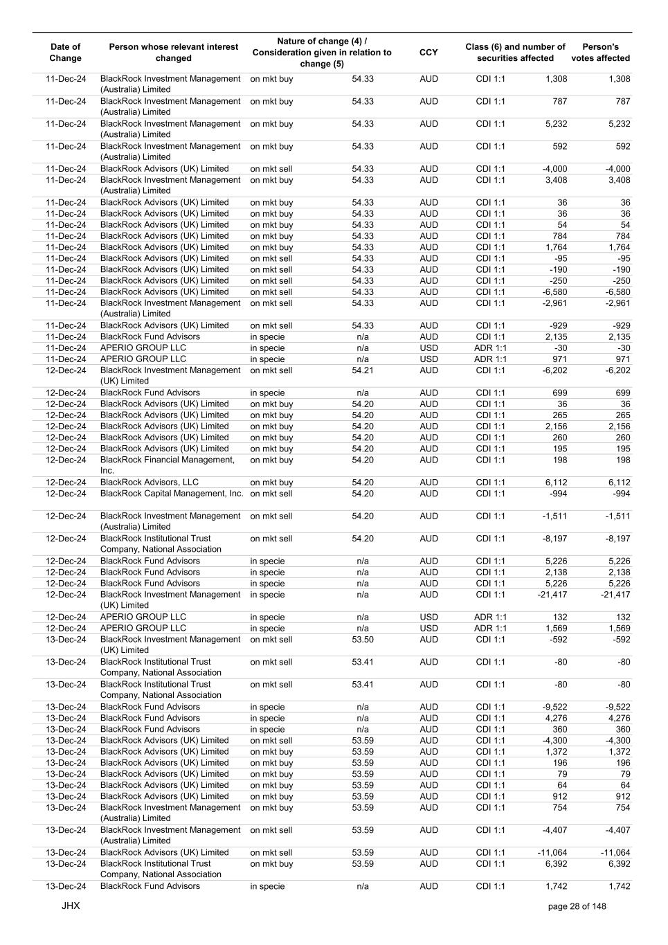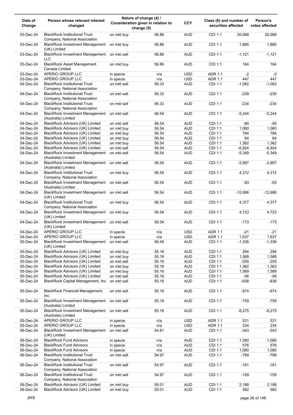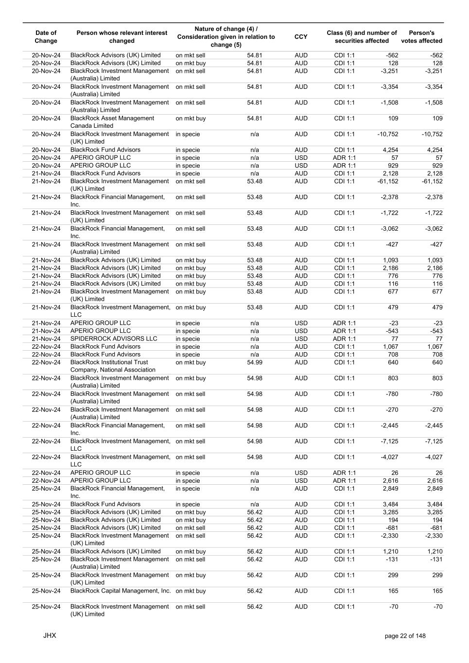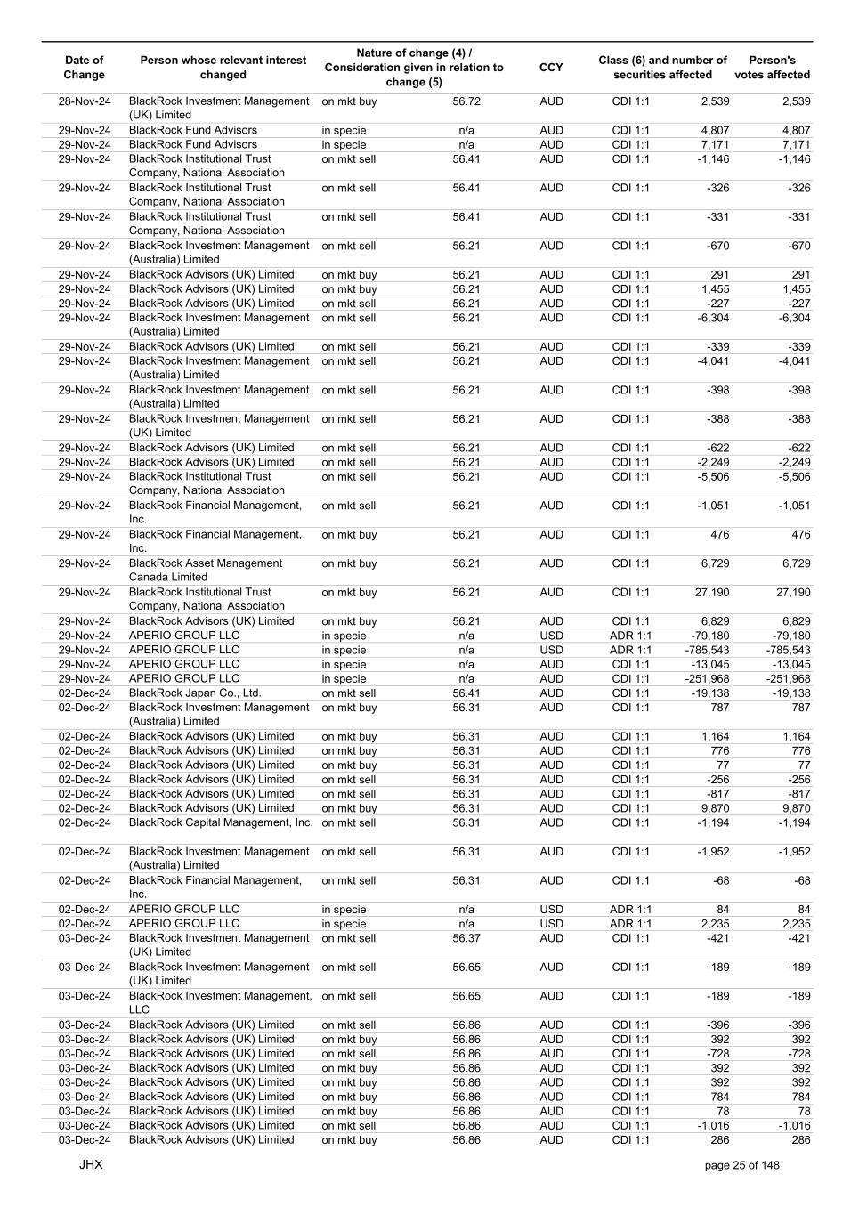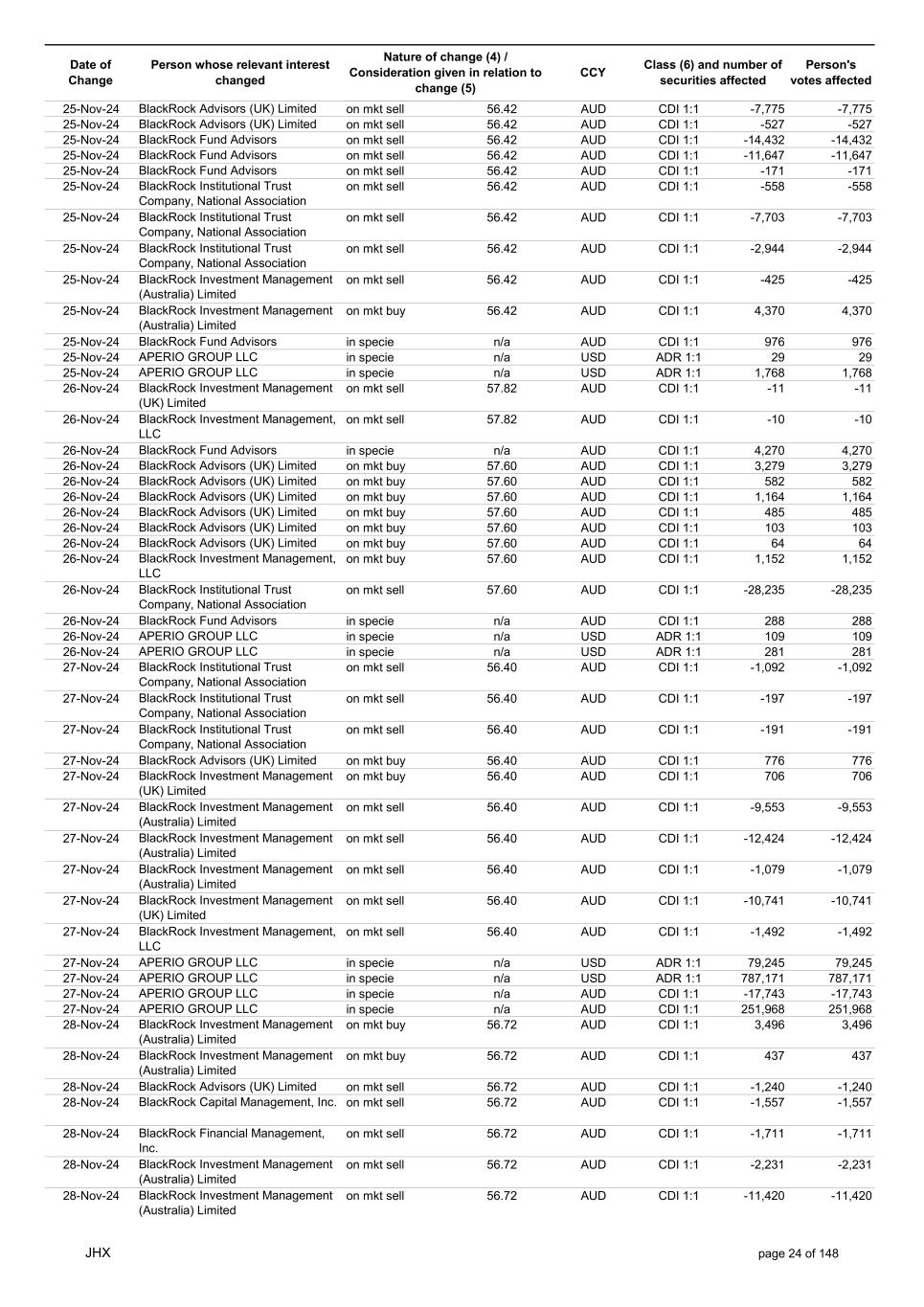 Date of Change Person whose relevant interest changed Nature of change (4) / Consideration given in relation to change (5) Class (6) and number of securities affected Person's votes affected CCY 25-Nov-24 BlackRock Advisors (UK) Limited on mkt sell 56.42 AUD CDI 1:1 -7,775 -7,775 25-Nov-24 BlackRock Advisors (UK) Limited on mkt sell 56.42 AUD CDI 1:1 -527 -527 25-Nov-24 BlackRock Fund Advisors on mkt sell 56.42 AUD CDI 1:1 -14,432 -14,432 25-Nov-24 BlackRock Fund Advisors on mkt sell 56.42 AUD CDI 1:1 -11,647 -11,647 25-Nov-24 BlackRock Fund Advisors on mkt sell 56.42 AUD CDI 1:1 -171 -171 25-Nov-24 BlackRock Institutional Trust Company, National Association on mkt sell 56.42 AUD CDI 1:1 -558 -558 25-Nov-24 BlackRock Institutional Trust Company, National Association on mkt sell 56.42 AUD CDI 1:1 -7,703 -7,703 25-Nov-24 BlackRock Institutional Trust Company, National Association on mkt sell 56.42 AUD CDI 1:1 -2,944 -2,944 25-Nov-24 BlackRock Investment Management (Australia) Limited on mkt sell 56.42 AUD CDI 1:1 -425 -425 25-Nov-24 BlackRock Investment Management (Australia) Limited on mkt buy 56.42 AUD CDI 1:1 4,370 4,370 25-Nov-24 BlackRock Fund Advisors in specie n/a AUD CDI 1:1 976 976 25-Nov-24 APERIO GROUP LLC in specie n/a USD ADR 1:1 29 29 25-Nov-24 APERIO GROUP LLC in specie n/a USD ADR 1:1 1,768 1,768 26-Nov-24 BlackRock Investment Management (UK) Limited on mkt sell 57.82 AUD CDI 1:1 -11 -11 26-Nov-24 BlackRock Investment Management, LLC on mkt sell 57.82 AUD CDI 1:1 -10 -10 26-Nov-24 BlackRock Fund Advisors in specie n/a AUD CDI 1:1 4,270 4,270 26-Nov-24 BlackRock Advisors (UK) Limited on mkt buy 57.60 AUD CDI 1:1 3,279 3,279 26-Nov-24 BlackRock Advisors (UK) Limited on mkt buy 57.60 AUD CDI 1:1 582 582 26-Nov-24 BlackRock Advisors (UK) Limited on mkt buy 57.60 AUD CDI 1:1 1,164 1,164 26-Nov-24 BlackRock Advisors (UK) Limited on mkt buy 57.60 AUD CDI 1:1 485 485 26-Nov-24 BlackRock Advisors (UK) Limited on mkt buy 57.60 AUD CDI 1:1 103 103 26-Nov-24 BlackRock Advisors (UK) Limited on mkt buy 57.60 AUD CDI 1:1 64 64 26-Nov-24 BlackRock Investment Management, LLC on mkt buy 57.60 AUD CDI 1:1 1,152 1,152 26-Nov-24 BlackRock Institutional Trust Company, National Association on mkt sell 57.60 AUD CDI 1:1 -28,235 -28,235 26-Nov-24 BlackRock Fund Advisors in specie n/a AUD CDI 1:1 288 288 26-Nov-24 APERIO GROUP LLC in specie n/a USD ADR 1:1 109 109 26-Nov-24 APERIO GROUP LLC in specie n/a USD ADR 1:1 281 281 27-Nov-24 BlackRock Institutional Trust Company, National Association on mkt sell 56.40 AUD CDI 1:1 -1,092 -1,092 27-Nov-24 BlackRock Institutional Trust Company, National Association on mkt sell 56.40 AUD CDI 1:1 -197 -197 27-Nov-24 BlackRock Institutional Trust Company, National Association on mkt sell 56.40 AUD CDI 1:1 -191 -191 27-Nov-24 BlackRock Advisors (UK) Limited on mkt buy 56.40 AUD CDI 1:1 776 776 27-Nov-24 BlackRock Investment Management (UK) Limited on mkt buy 56.40 AUD CDI 1:1 706 706 27-Nov-24 BlackRock Investment Management (Australia) Limited on mkt sell 56.40 AUD CDI 1:1 -9,553 -9,553 27-Nov-24 BlackRock Investment Management (Australia) Limited on mkt sell 56.40 AUD CDI 1:1 -12,424 -12,424 27-Nov-24 BlackRock Investment Management (Australia) Limited on mkt sell 56.40 AUD CDI 1:1 -1,079 -1,079 27-Nov-24 BlackRock Investment Management (UK) Limited on mkt sell 56.40 AUD CDI 1:1 -10,741 -10,741 27-Nov-24 BlackRock Investment Management, LLC on mkt sell 56.40 AUD CDI 1:1 -1,492 -1,492 27-Nov-24 APERIO GROUP LLC in specie n/a USD ADR 1:1 79,245 79,245 27-Nov-24 APERIO GROUP LLC in specie n/a USD ADR 1:1 787,171 787,171 27-Nov-24 APERIO GROUP LLC in specie n/a AUD CDI 1:1 -17,743 -17,743 27-Nov-24 APERIO GROUP LLC in specie n/a AUD CDI 1:1 251,968 251,968 28-Nov-24 BlackRock Investment Management (Australia) Limited on mkt buy 56.72 AUD CDI 1:1 3,496 3,496 28-Nov-24 BlackRock Investment Management (Australia) Limited on mkt buy 56.72 AUD CDI 1:1 437 437 28-Nov-24 BlackRock Advisors (UK) Limited on mkt sell 56.72 AUD CDI 1:1 -1,240 -1,240 28-Nov-24 BlackRock Capital Management, Inc. on mkt sell 56.72 AUD CDI 1:1 -1,557 -1,557 28-Nov-24 BlackRock Financial Management, Inc. on mkt sell 56.72 AUD CDI 1:1 -1,711 -1,711 28-Nov-24 BlackRock Investment Management (Australia) Limited on mkt sell 56.72 AUD CDI 1:1 -2,231 -2,231 28-Nov-24 BlackRock Investment Management (Australia) Limited on mkt sell 56.72 AUD CDI 1:1 -11,420 -11,420 JHX page 24 of 148