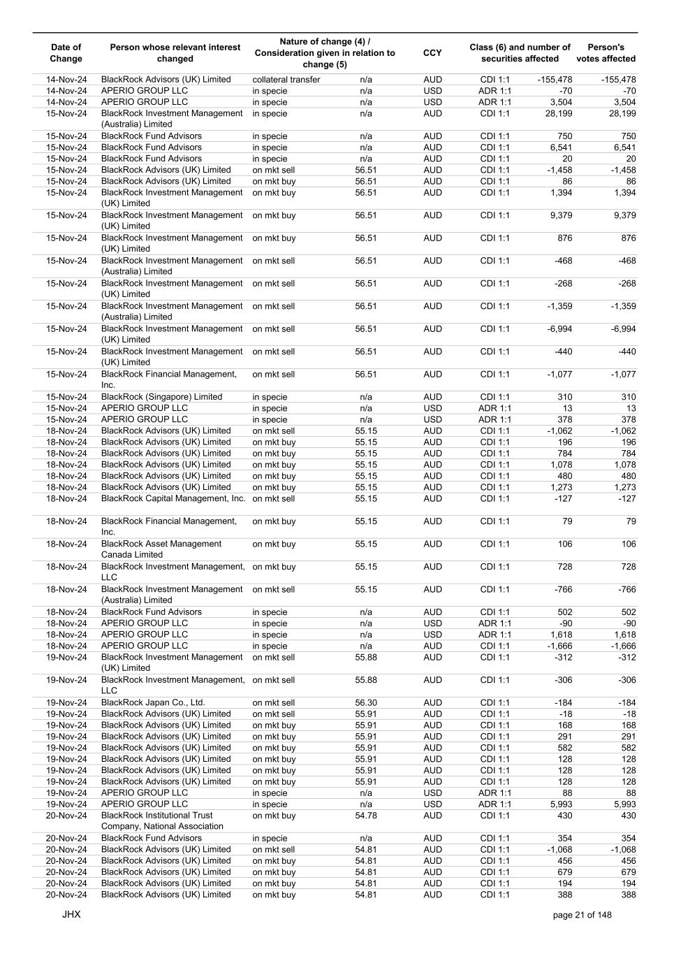 Date of Change Person whose relevant interest changed Nature of change (4) / Consideration given in relation to change (5) Class (6) and number of securities affected Person's votes affected CCY 14-Nov-24 BlackRock Advisors (UK) Limited collateral transfer n/a AUD CDI 1:1 -155,478 -155,478 14-Nov-24 APERIO GROUP LLC in specie n/a USD ADR 1:1 -70 -70 14-Nov-24 APERIO GROUP LLC in specie n/a USD ADR 1:1 3,504 3,504 15-Nov-24 BlackRock Investment Management (Australia) Limited in specie n/a AUD CDI 1:1 28,199 28,199 15-Nov-24 BlackRock Fund Advisors in specie n/a AUD CDI 1:1 750 750 15-Nov-24 BlackRock Fund Advisors in specie n/a AUD CDI 1:1 6,541 6,541 15-Nov-24 BlackRock Fund Advisors in specie n/a AUD CDI 1:1 20 20 15-Nov-24 BlackRock Advisors (UK) Limited on mkt sell 56.51 AUD CDI 1:1 -1,458 -1,458 15-Nov-24 BlackRock Advisors (UK) Limited on mkt buy 56.51 AUD CDI 1:1 86 86 15-Nov-24 BlackRock Investment Management (UK) Limited on mkt buy 56.51 AUD CDI 1:1 1,394 1,394 15-Nov-24 BlackRock Investment Management (UK) Limited on mkt buy 56.51 AUD CDI 1:1 9,379 9,379 15-Nov-24 BlackRock Investment Management (UK) Limited on mkt buy 56.51 AUD CDI 1:1 876 876 15-Nov-24 BlackRock Investment Management (Australia) Limited on mkt sell 56.51 AUD CDI 1:1 -468 -468 15-Nov-24 BlackRock Investment Management (UK) Limited on mkt sell 56.51 AUD CDI 1:1 -268 -268 15-Nov-24 BlackRock Investment Management (Australia) Limited on mkt sell 56.51 AUD CDI 1:1 -1,359 -1,359 15-Nov-24 BlackRock Investment Management (UK) Limited on mkt sell 56.51 AUD CDI 1:1 -6,994 -6,994 15-Nov-24 BlackRock Investment Management (UK) Limited on mkt sell 56.51 AUD CDI 1:1 -440 -440 15-Nov-24 BlackRock Financial Management, Inc. on mkt sell 56.51 AUD CDI 1:1 -1,077 -1,077 15-Nov-24 BlackRock (Singapore) Limited in specie n/a AUD CDI 1:1 310 310 15-Nov-24 APERIO GROUP LLC in specie n/a USD ADR 1:1 13 13 15-Nov-24 APERIO GROUP LLC in specie n/a USD ADR 1:1 378 378 18-Nov-24 BlackRock Advisors (UK) Limited on mkt sell 55.15 AUD CDI 1:1 -1,062 -1,062 18-Nov-24 BlackRock Advisors (UK) Limited on mkt buy 55.15 AUD CDI 1:1 196 196 18-Nov-24 BlackRock Advisors (UK) Limited on mkt buy 55.15 AUD CDI 1:1 784 784 18-Nov-24 BlackRock Advisors (UK) Limited on mkt buy 55.15 AUD CDI 1:1 1,078 1,078 18-Nov-24 BlackRock Advisors (UK) Limited on mkt buy 55.15 AUD CDI 1:1 480 480 18-Nov-24 BlackRock Advisors (UK) Limited on mkt buy 55.15 AUD CDI 1:1 1,273 1,273 18-Nov-24 BlackRock Capital Management, Inc. on mkt sell 55.15 AUD CDI 1:1 -127 -127 18-Nov-24 BlackRock Financial Management, Inc. on mkt buy 55.15 AUD CDI 1:1 79 79 18-Nov-24 BlackRock Asset Management Canada Limited on mkt buy 55.15 AUD CDI 1:1 106 106 18-Nov-24 BlackRock Investment Management, LLC on mkt buy 55.15 AUD CDI 1:1 728 728 18-Nov-24 BlackRock Investment Management (Australia) Limited on mkt sell 55.15 AUD CDI 1:1 -766 -766 18-Nov-24 BlackRock Fund Advisors in specie n/a AUD CDI 1:1 502 502 18-Nov-24 APERIO GROUP LLC in specie n/a USD ADR 1:1 -90 -90 18-Nov-24 APERIO GROUP LLC in specie n/a USD ADR 1:1 1,618 1,618 18-Nov-24 APERIO GROUP LLC in specie n/a AUD CDI 1:1 -1,666 -1,666 19-Nov-24 BlackRock Investment Management (UK) Limited on mkt sell 55.88 AUD CDI 1:1 -312 -312 19-Nov-24 BlackRock Investment Management, LLC on mkt sell 55.88 AUD CDI 1:1 -306 -306 19-Nov-24 BlackRock Japan Co., Ltd. on mkt sell 56.30 AUD CDI 1:1 -184 -184 19-Nov-24 BlackRock Advisors (UK) Limited on mkt sell 55.91 AUD CDI 1:1 -18 -18 19-Nov-24 BlackRock Advisors (UK) Limited on mkt buy 55.91 AUD CDI 1:1 168 168 19-Nov-24 BlackRock Advisors (UK) Limited on mkt buy 55.91 AUD CDI 1:1 291 291 19-Nov-24 BlackRock Advisors (UK) Limited on mkt buy 55.91 AUD CDI 1:1 582 582 19-Nov-24 BlackRock Advisors (UK) Limited on mkt buy 55.91 AUD CDI 1:1 128 128 19-Nov-24 BlackRock Advisors (UK) Limited on mkt buy 55.91 AUD CDI 1:1 128 128 19-Nov-24 BlackRock Advisors (UK) Limited on mkt buy 55.91 AUD CDI 1:1 128 128 19-Nov-24 APERIO GROUP LLC in specie n/a USD ADR 1:1 88 88 19-Nov-24 APERIO GROUP LLC in specie n/a USD ADR 1:1 5,993 5,993 20-Nov-24 BlackRock Institutional Trust Company, National Association on mkt buy 54.78 AUD CDI 1:1 430 430 20-Nov-24 BlackRock Fund Advisors in specie n/a AUD CDI 1:1 354 354 20-Nov-24 BlackRock Advisors (UK) Limited on mkt sell 54.81 AUD CDI 1:1 -1,068 -1,068 20-Nov-24 BlackRock Advisors (UK) Limited on mkt buy 54.81 AUD CDI 1:1 456 456 20-Nov-24 BlackRock Advisors (UK) Limited on mkt buy 54.81 AUD CDI 1:1 679 679 20-Nov-24 BlackRock Advisors (UK) Limited on mkt buy 54.81 AUD CDI 1:1 194 194 20-Nov-24 BlackRock Advisors (UK) Limited on mkt buy 54.81 AUD CDI 1:1 388 388 JHX page 21 of 148