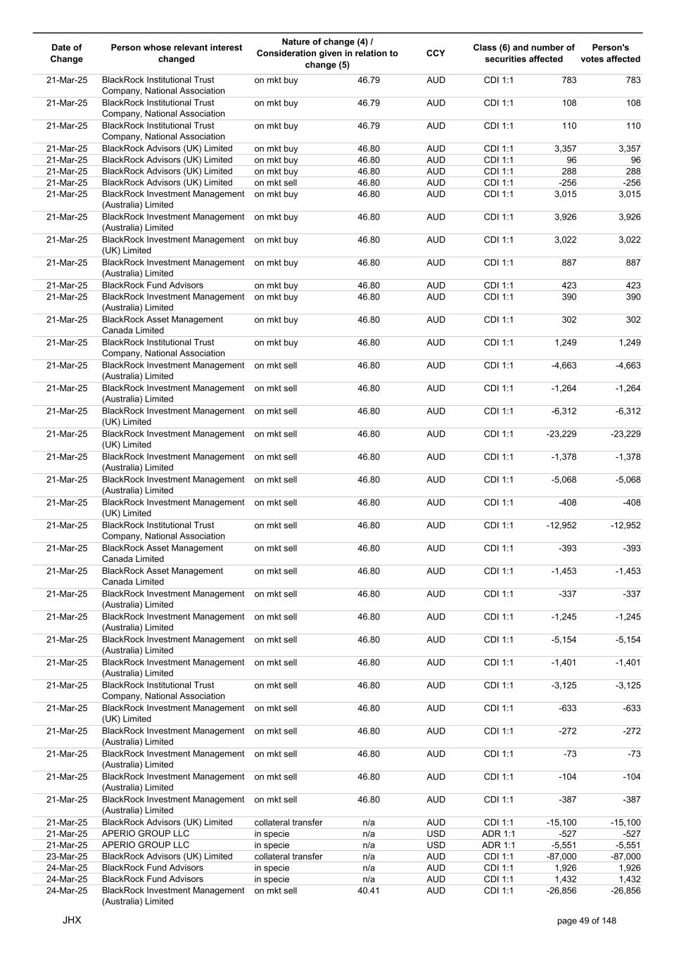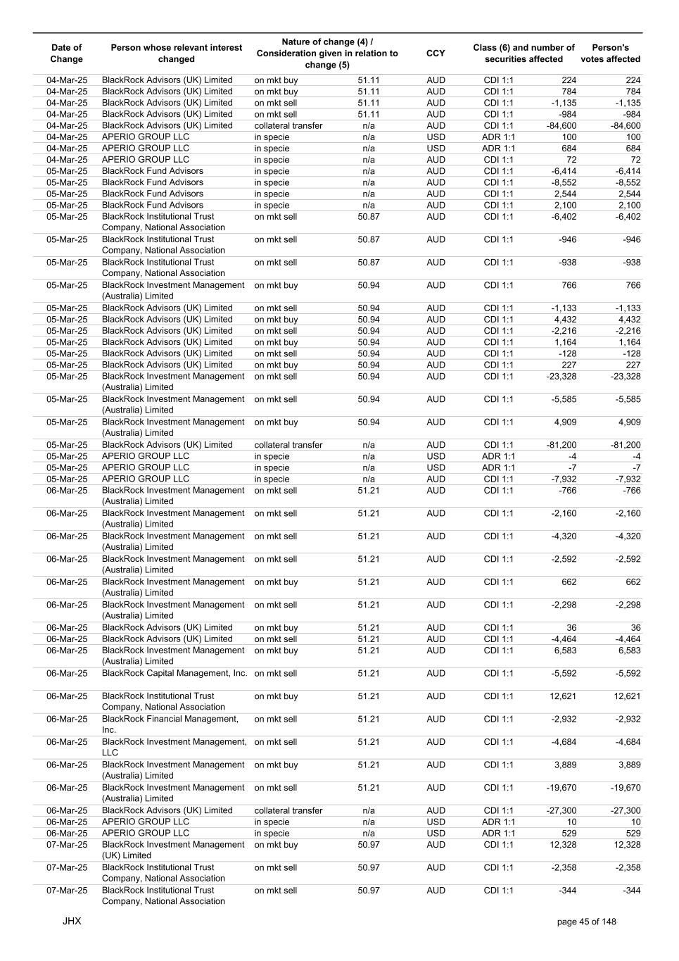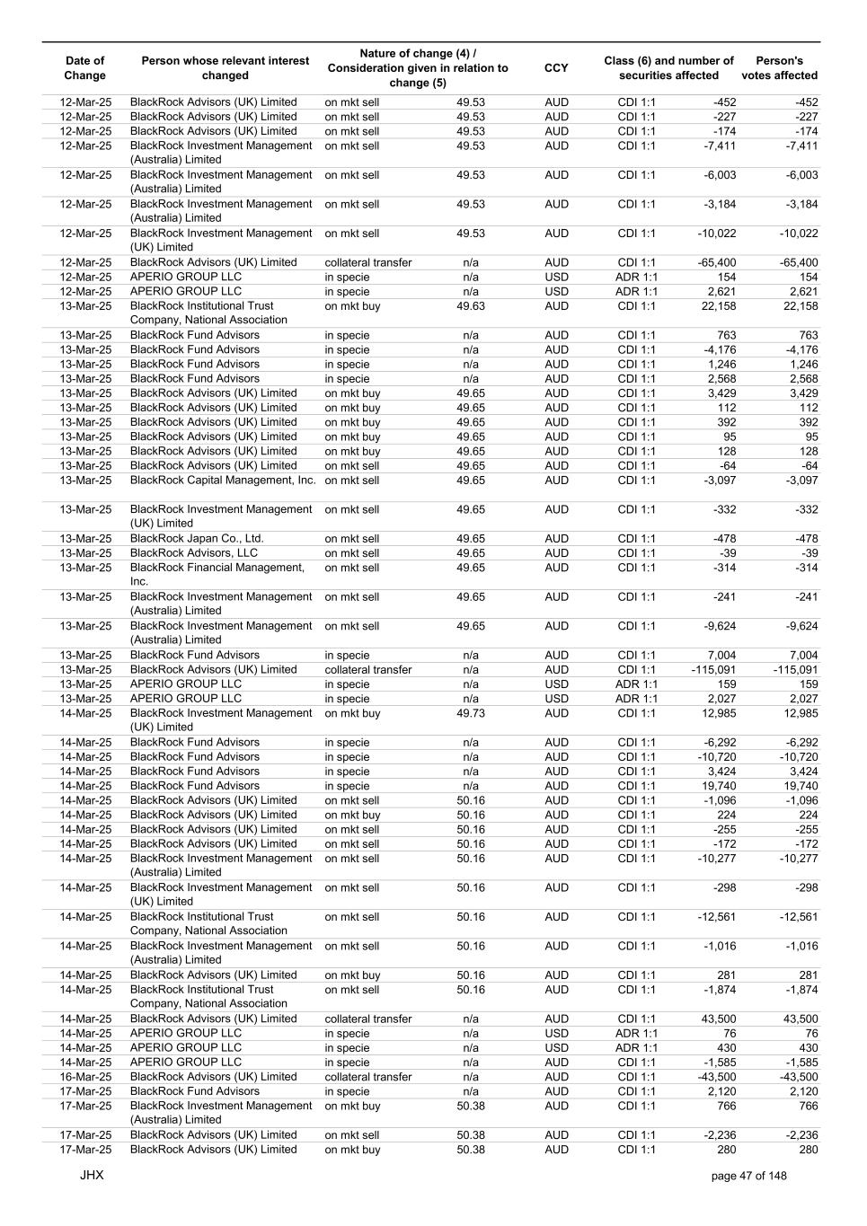 Date of Change Person whose relevant interest changed Nature of change (4) / Consideration given in relation to change (5) Class (6) and number of securities affected Person's votes affected CCY 12-Mar-25 BlackRock Advisors (UK) Limited on mkt sell 49.53 AUD CDI 1:1 -452 -452 12-Mar-25 BlackRock Advisors (UK) Limited on mkt sell 49.53 AUD CDI 1:1 -227 -227 12-Mar-25 BlackRock Advisors (UK) Limited on mkt sell 49.53 AUD CDI 1:1 -174 -174 12-Mar-25 BlackRock Investment Management (Australia) Limited on mkt sell 49.53 AUD CDI 1:1 -7,411 -7,411 12-Mar-25 BlackRock Investment Management (Australia) Limited on mkt sell 49.53 AUD CDI 1:1 -6,003 -6,003 12-Mar-25 BlackRock Investment Management (Australia) Limited on mkt sell 49.53 AUD CDI 1:1 -3,184 -3,184 12-Mar-25 BlackRock Investment Management (UK) Limited on mkt sell 49.53 AUD CDI 1:1 -10,022 -10,022 12-Mar-25 BlackRock Advisors (UK) Limited collateral transfer n/a AUD CDI 1:1 -65,400 -65,400 12-Mar-25 APERIO GROUP LLC in specie n/a USD ADR 1:1 154 154 12-Mar-25 APERIO GROUP LLC in specie n/a USD ADR 1:1 2,621 2,621 13-Mar-25 BlackRock Institutional Trust Company, National Association on mkt buy 49.63 AUD CDI 1:1 22,158 22,158 13-Mar-25 BlackRock Fund Advisors in specie n/a AUD CDI 1:1 763 763 13-Mar-25 BlackRock Fund Advisors in specie n/a AUD CDI 1:1 -4,176 -4,176 13-Mar-25 BlackRock Fund Advisors in specie n/a AUD CDI 1:1 1,246 1,246 13-Mar-25 BlackRock Fund Advisors in specie n/a AUD CDI 1:1 2,568 2,568 13-Mar-25 BlackRock Advisors (UK) Limited on mkt buy 49.65 AUD CDI 1:1 3,429 3,429 13-Mar-25 BlackRock Advisors (UK) Limited on mkt buy 49.65 AUD CDI 1:1 112 112 13-Mar-25 BlackRock Advisors (UK) Limited on mkt buy 49.65 AUD CDI 1:1 392 392 13-Mar-25 BlackRock Advisors (UK) Limited on mkt buy 49.65 AUD CDI 1:1 95 95 13-Mar-25 BlackRock Advisors (UK) Limited on mkt buy 49.65 AUD CDI 1:1 128 128 13-Mar-25 BlackRock Advisors (UK) Limited on mkt sell 49.65 AUD CDI 1:1 -64 -64 13-Mar-25 BlackRock Capital Management, Inc. on mkt sell 49.65 AUD CDI 1:1 -3,097 -3,097 13-Mar-25 BlackRock Investment Management (UK) Limited on mkt sell 49.65 AUD CDI 1:1 -332 -332 13-Mar-25 BlackRock Japan Co., Ltd. on mkt sell 49.65 AUD CDI 1:1 -478 -478 13-Mar-25 BlackRock Advisors, LLC on mkt sell 49.65 AUD CDI 1:1 -39 -39 13-Mar-25 BlackRock Financial Management, Inc. on mkt sell 49.65 AUD CDI 1:1 -314 -314 13-Mar-25 BlackRock Investment Management (Australia) Limited on mkt sell 49.65 AUD CDI 1:1 -241 -241 13-Mar-25 BlackRock Investment Management (Australia) Limited on mkt sell 49.65 AUD CDI 1:1 -9,624 -9,624 13-Mar-25 BlackRock Fund Advisors in specie n/a AUD CDI 1:1 7,004 7,004 13-Mar-25 BlackRock Advisors (UK) Limited collateral transfer n/a AUD CDI 1:1 -115,091 -115,091 13-Mar-25 APERIO GROUP LLC in specie n/a USD ADR 1:1 159 159 13-Mar-25 APERIO GROUP LLC in specie n/a USD ADR 1:1 2,027 2,027 14-Mar-25 BlackRock Investment Management (UK) Limited on mkt buy 49.73 AUD CDI 1:1 12,985 12,985 14-Mar-25 BlackRock Fund Advisors in specie n/a AUD CDI 1:1 -6,292 -6,292 14-Mar-25 BlackRock Fund Advisors in specie n/a AUD CDI 1:1 -10,720 -10,720 14-Mar-25 BlackRock Fund Advisors in specie n/a AUD CDI 1:1 3,424 3,424 14-Mar-25 BlackRock Fund Advisors in specie n/a AUD CDI 1:1 19,740 19,740 14-Mar-25 BlackRock Advisors (UK) Limited on mkt sell 50.16 AUD CDI 1:1 -1,096 -1,096 14-Mar-25 BlackRock Advisors (UK) Limited on mkt buy 50.16 AUD CDI 1:1 224 224 14-Mar-25 BlackRock Advisors (UK) Limited on mkt sell 50.16 AUD CDI 1:1 -255 -255 14-Mar-25 BlackRock Advisors (UK) Limited on mkt sell 50.16 AUD CDI 1:1 -172 -172 14-Mar-25 BlackRock Investment Management (Australia) Limited on mkt sell 50.16 AUD CDI 1:1 -10,277 -10,277 14-Mar-25 BlackRock Investment Management (UK) Limited on mkt sell 50.16 AUD CDI 1:1 -298 -298 14-Mar-25 BlackRock Institutional Trust Company, National Association on mkt sell 50.16 AUD CDI 1:1 -12,561 -12,561 14-Mar-25 BlackRock Investment Management (Australia) Limited on mkt sell 50.16 AUD CDI 1:1 -1,016 -1,016 14-Mar-25 BlackRock Advisors (UK) Limited on mkt buy 50.16 AUD CDI 1:1 281 281 14-Mar-25 BlackRock Institutional Trust Company, National Association on mkt sell 50.16 AUD CDI 1:1 -1,874 -1,874 14-Mar-25 BlackRock Advisors (UK) Limited collateral transfer n/a AUD CDI 1:1 43,500 43,500 14-Mar-25 APERIO GROUP LLC in specie n/a USD ADR 1:1 76 76 14-Mar-25 APERIO GROUP LLC in specie n/a USD ADR 1:1 430 430 14-Mar-25 APERIO GROUP LLC in specie n/a AUD CDI 1:1 -1,585 -1,585 16-Mar-25 BlackRock Advisors (UK) Limited collateral transfer n/a AUD CDI 1:1 -43,500 -43,500 17-Mar-25 BlackRock Fund Advisors in specie n/a AUD CDI 1:1 2,120 2,120 17-Mar-25 BlackRock Investment Management (Australia) Limited on mkt buy 50.38 AUD CDI 1:1 766 766 17-Mar-25 BlackRock Advisors (UK) Limited on mkt sell 50.38 AUD CDI 1:1 -2,236 -2,236 17-Mar-25 BlackRock Advisors (UK) Limited on mkt buy 50.38 AUD CDI 1:1 280 280 JHX page 47 of 148