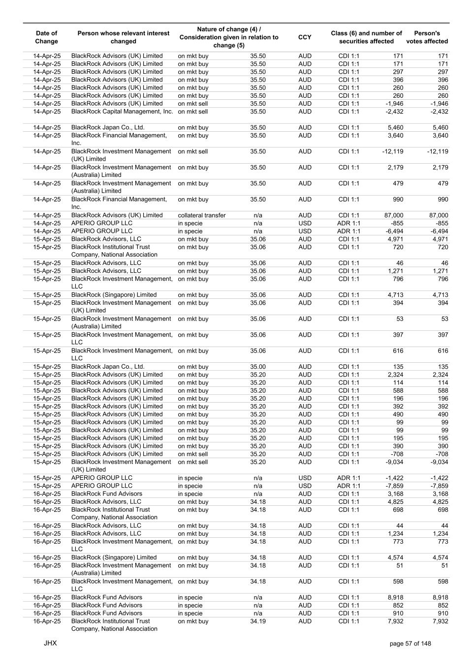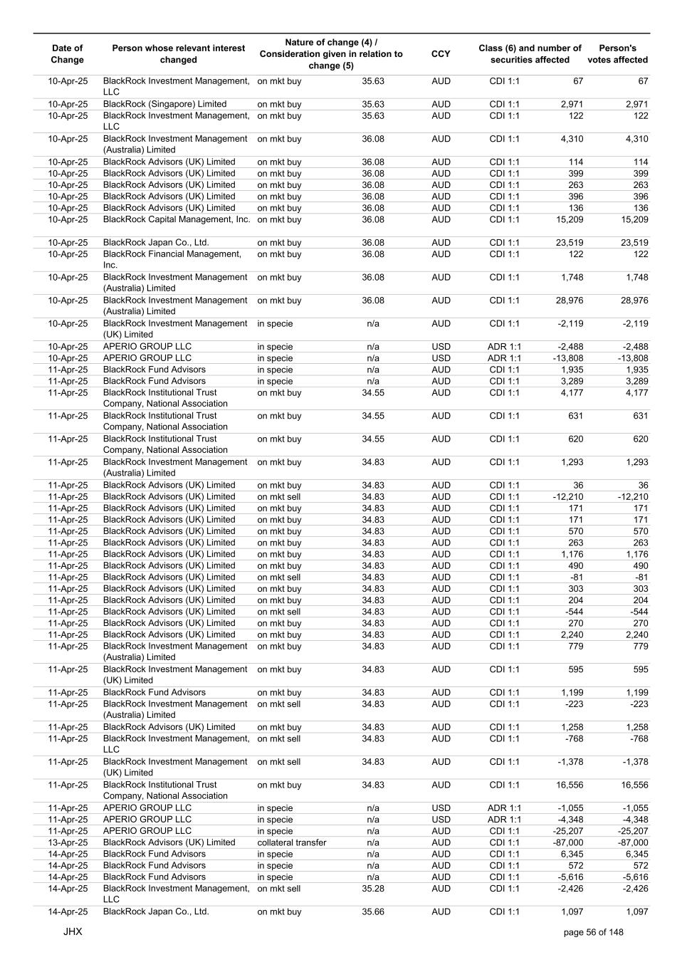 Date of Change Person whose relevant interest changed Nature of change (4) / Consideration given in relation to change (5) Class (6) and number of securities affected Person's votes affected CCY 24-Apr-25 BlackRock Advisors (UK) Limited on mkt buy 36.38 AUD CDI 1:1 464 464 24-Apr-25 BlackRock Investment Management (UK) Limited on mkt sell 36.38 AUD CDI 1:1 -30,375 -30,375 24-Apr-25 BlackRock Japan Co., Ltd. on mkt buy 36.38 AUD CDI 1:1 21,662 21,662 24-Apr-25 BlackRock Investment Management (Australia) Limited on mkt buy 36.38 AUD CDI 1:1 415 415 24-Apr-25 BlackRock Investment Management (Australia) Limited on mkt buy 36.38 AUD CDI 1:1 4,776 4,776 24-Apr-25 BlackRock Investment Management (Australia) Limited on mkt buy 36.38 AUD CDI 1:1 616 616 24-Apr-25 BlackRock Investment Management (UK) Limited on mkt sell 36.38 AUD CDI 1:1 -10,707 -10,707 24-Apr-25 BlackRock Capital Management, Inc. on mkt buy 36.38 AUD CDI 1:1 138 138 24-Apr-25 BlackRock Financial Management, Inc. on mkt buy 36.38 AUD CDI 1:1 4,282 4,282 24-Apr-25 BlackRock Investment Management, LLC on mkt buy 36.38 AUD CDI 1:1 2,828 2,828 24-Apr-25 BlackRock Fund Advisors in specie n/a AUD CDI 1:1 -14,160 -14,160 24-Apr-25 APERIO GROUP LLC in specie n/a USD ADR 1:1 189 189 24-Apr-25 APERIO GROUP LLC in specie n/a USD ADR 1:1 638 638 25-Apr-25 BlackRock Fund Advisors in specie n/a AUD CDI 1:1 -771 -771 25-Apr-25 APERIO GROUP LLC in specie n/a USD ADR 1:1 -366 -366 25-Apr-25 APERIO GROUP LLC in specie n/a USD ADR 1:1 -2,551 -2,551 27-Apr-25 BlackRock Advisors (UK) Limited collateral transfer n/a AUD CDI 1:1 -87,000 -87,000 27-Apr-25 BlackRock Investment Management, LLC in specie n/a AUD CDI 1:1 -562 -562 27-Apr-25 BlackRock Investment Management, LLC in specie n/a AUD CDI 1:1 -7,796 -7,796 28-Apr-25 BlackRock Fund Advisors in specie n/a AUD CDI 1:1 2,170 2,170 28-Apr-25 BlackRock Investment Management (Australia) Limited in specie n/a AUD CDI 1:1 -32,170 -32,170 28-Apr-25 BlackRock Investment Management (Australia) Limited in specie n/a AUD CDI 1:1 -146,228 -146,228 28-Apr-25 BlackRock Investment Management (UK) Limited on mkt buy 37.65 AUD CDI 1:1 8,055 8,055 28-Apr-25 BlackRock Investment Management (UK) Limited on mkt buy 36.94 AUD CDI 1:1 14,368 14,368 28-Apr-25 BlackRock Advisors (UK) Limited on mkt buy 36.83 AUD CDI 1:1 263 263 28-Apr-25 BlackRock Advisors (UK) Limited on mkt buy 36.83 AUD CDI 1:1 100 100 28-Apr-25 BlackRock Advisors (UK) Limited on mkt buy 36.83 AUD CDI 1:1 400 400 28-Apr-25 BlackRock Advisors (UK) Limited on mkt buy 36.83 AUD CDI 1:1 500 500 28-Apr-25 BlackRock Advisors (UK) Limited on mkt buy 36.83 AUD CDI 1:1 99 99 28-Apr-25 BlackRock Advisors (UK) Limited on mkt buy 36.83 AUD CDI 1:1 99 99 28-Apr-25 BlackRock Advisors (UK) Limited on mkt sell 36.83 AUD CDI 1:1 -66 -66 28-Apr-25 BlackRock Advisors (UK) Limited on mkt buy 36.83 AUD CDI 1:1 90 90 28-Apr-25 BlackRock Advisors (UK) Limited on mkt buy 36.83 AUD CDI 1:1 270 270 28-Apr-25 BlackRock Fund Advisors on mkt buy 36.83 AUD CDI 1:1 8,110 8,110 28-Apr-25 BlackRock Institutional Trust Company, National Association on mkt sell 36.83 AUD CDI 1:1 -1,265 -1,265 28-Apr-25 BlackRock Investment Management (Australia) Limited on mkt buy 36.83 AUD CDI 1:1 440 440 28-Apr-25 BlackRock Institutional Trust Company, National Association on mkt buy 36.83 AUD CDI 1:1 18,011 18,011 28-Apr-25 BlackRock Fund Advisors in specie n/a AUD CDI 1:1 56,502 56,502 28-Apr-25 BlackRock Advisors (UK) Limited collateral transfer n/a AUD CDI 1:1 87,000 87,000 28-Apr-25 APERIO GROUP LLC in specie n/a USD ADR 1:1 364 364 28-Apr-25 APERIO GROUP LLC in specie n/a USD ADR 1:1 2,636 2,636 29-Apr-25 BlackRock Fund Advisors in specie n/a AUD CDI 1:1 4,940 4,940 29-Apr-25 BlackRock Fund Advisors in specie n/a AUD CDI 1:1 291 291 29-Apr-25 BlackRock Fund Advisors in specie n/a AUD CDI 1:1 848 848 29-Apr-25 BlackRock Advisors, LLC on mkt buy 36.60 AUD CDI 1:1 6,064 6,064 29-Apr-25 BlackRock Institutional Trust Company, National Association on mkt buy 36.60 AUD CDI 1:1 882 882 29-Apr-25 BlackRock Advisors, LLC on mkt buy 36.60 AUD CDI 1:1 57 57 29-Apr-25 BlackRock Advisors, LLC on mkt buy 36.60 AUD CDI 1:1 1,503 1,503 29-Apr-25 BlackRock Investment Management, LLC on mkt buy 36.60 AUD CDI 1:1 977 977 29-Apr-25 BlackRock (Singapore) Limited on mkt buy 36.60 AUD CDI 1:1 6,067 6,067 29-Apr-25 BlackRock Investment Management (Australia) Limited on mkt buy 36.60 AUD CDI 1:1 67 67 29-Apr-25 BlackRock Investment Management, LLC on mkt buy 36.60 AUD CDI 1:1 723 723 JHX page 60 of 148