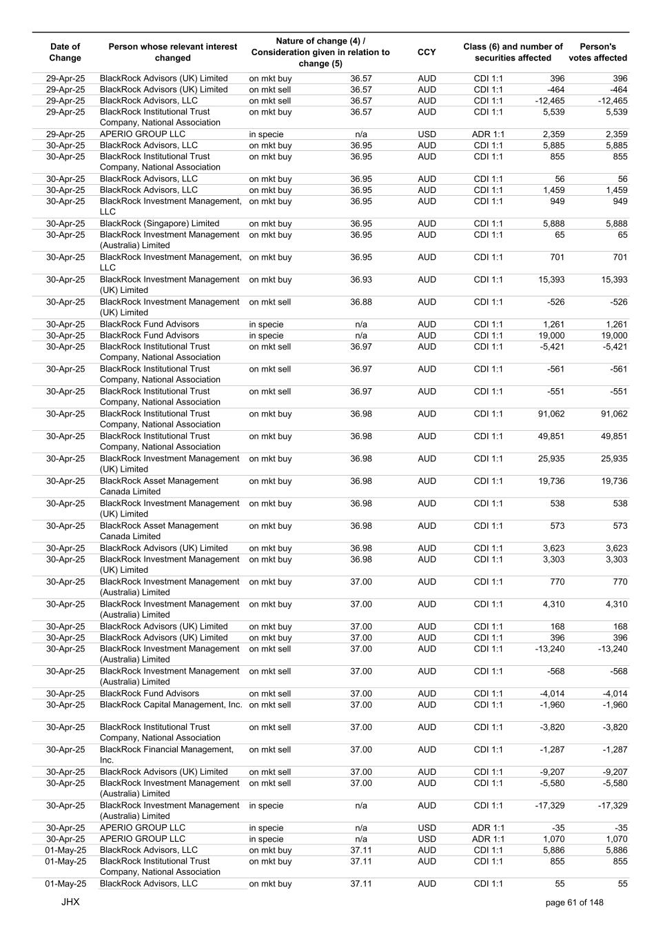 Date of Change Person whose relevant interest changed Nature of change (4) / Consideration given in relation to change (5) Class (6) and number of securities affected Person's votes affected CCY 29-Apr-25 BlackRock Advisors (UK) Limited on mkt buy 36.57 AUD CDI 1:1 396 396 29-Apr-25 BlackRock Advisors (UK) Limited on mkt sell 36.57 AUD CDI 1:1 -464 -464 29-Apr-25 BlackRock Advisors, LLC on mkt sell 36.57 AUD CDI 1:1 -12,465 -12,465 29-Apr-25 BlackRock Institutional Trust Company, National Association on mkt buy 36.57 AUD CDI 1:1 5,539 5,539 29-Apr-25 APERIO GROUP LLC in specie n/a USD ADR 1:1 2,359 2,359 30-Apr-25 BlackRock Advisors, LLC on mkt buy 36.95 AUD CDI 1:1 5,885 5,885 30-Apr-25 BlackRock Institutional Trust Company, National Association on mkt buy 36.95 AUD CDI 1:1 855 855 30-Apr-25 BlackRock Advisors, LLC on mkt buy 36.95 AUD CDI 1:1 56 56 30-Apr-25 BlackRock Advisors, LLC on mkt buy 36.95 AUD CDI 1:1 1,459 1,459 30-Apr-25 BlackRock Investment Management, LLC on mkt buy 36.95 AUD CDI 1:1 949 949 30-Apr-25 BlackRock (Singapore) Limited on mkt buy 36.95 AUD CDI 1:1 5,888 5,888 30-Apr-25 BlackRock Investment Management (Australia) Limited on mkt buy 36.95 AUD CDI 1:1 65 65 30-Apr-25 BlackRock Investment Management, LLC on mkt buy 36.95 AUD CDI 1:1 701 701 30-Apr-25 BlackRock Investment Management (UK) Limited on mkt buy 36.93 AUD CDI 1:1 15,393 15,393 30-Apr-25 BlackRock Investment Management (UK) Limited on mkt sell 36.88 AUD CDI 1:1 -526 -526 30-Apr-25 BlackRock Fund Advisors in specie n/a AUD CDI 1:1 1,261 1,261 30-Apr-25 BlackRock Fund Advisors in specie n/a AUD CDI 1:1 19,000 19,000 30-Apr-25 BlackRock Institutional Trust Company, National Association on mkt sell 36.97 AUD CDI 1:1 -5,421 -5,421 30-Apr-25 BlackRock Institutional Trust Company, National Association on mkt sell 36.97 AUD CDI 1:1 -561 -561 30-Apr-25 BlackRock Institutional Trust Company, National Association on mkt sell 36.97 AUD CDI 1:1 -551 -551 30-Apr-25 BlackRock Institutional Trust Company, National Association on mkt buy 36.98 AUD CDI 1:1 91,062 91,062 30-Apr-25 BlackRock Institutional Trust Company, National Association on mkt buy 36.98 AUD CDI 1:1 49,851 49,851 30-Apr-25 BlackRock Investment Management (UK) Limited on mkt buy 36.98 AUD CDI 1:1 25,935 25,935 30-Apr-25 BlackRock Asset Management Canada Limited on mkt buy 36.98 AUD CDI 1:1 19,736 19,736 30-Apr-25 BlackRock Investment Management (UK) Limited on mkt buy 36.98 AUD CDI 1:1 538 538 30-Apr-25 BlackRock Asset Management Canada Limited on mkt buy 36.98 AUD CDI 1:1 573 573 30-Apr-25 BlackRock Advisors (UK) Limited on mkt buy 36.98 AUD CDI 1:1 3,623 3,623 30-Apr-25 BlackRock Investment Management (UK) Limited on mkt buy 36.98 AUD CDI 1:1 3,303 3,303 30-Apr-25 BlackRock Investment Management (Australia) Limited on mkt buy 37.00 AUD CDI 1:1 770 770 30-Apr-25 BlackRock Investment Management (Australia) Limited on mkt buy 37.00 AUD CDI 1:1 4,310 4,310 30-Apr-25 BlackRock Advisors (UK) Limited on mkt buy 37.00 AUD CDI 1:1 168 168 30-Apr-25 BlackRock Advisors (UK) Limited on mkt buy 37.00 AUD CDI 1:1 396 396 30-Apr-25 BlackRock Investment Management (Australia) Limited on mkt sell 37.00 AUD CDI 1:1 -13,240 -13,240 30-Apr-25 BlackRock Investment Management (Australia) Limited on mkt sell 37.00 AUD CDI 1:1 -568 -568 30-Apr-25 BlackRock Fund Advisors on mkt sell 37.00 AUD CDI 1:1 -4,014 -4,014 30-Apr-25 BlackRock Capital Management, Inc. on mkt sell 37.00 AUD CDI 1:1 -1,960 -1,960 30-Apr-25 BlackRock Institutional Trust Company, National Association on mkt sell 37.00 AUD CDI 1:1 -3,820 -3,820 30-Apr-25 BlackRock Financial Management, Inc. on mkt sell 37.00 AUD CDI 1:1 -1,287 -1,287 30-Apr-25 BlackRock Advisors (UK) Limited on mkt sell 37.00 AUD CDI 1:1 -9,207 -9,207 30-Apr-25 BlackRock Investment Management (Australia) Limited on mkt sell 37.00 AUD CDI 1:1 -5,580 -5,580 30-Apr-25 BlackRock Investment Management (Australia) Limited in specie n/a AUD CDI 1:1 -17,329 -17,329 30-Apr-25 APERIO GROUP LLC in specie n/a USD ADR 1:1 -35 -35 30-Apr-25 APERIO GROUP LLC in specie n/a USD ADR 1:1 1,070 1,070 01-May-25 BlackRock Advisors, LLC on mkt buy 37.11 AUD CDI 1:1 5,886 5,886 01-May-25 BlackRock Institutional Trust Company, National Association on mkt buy 37.11 AUD CDI 1:1 855 855 01-May-25 BlackRock Advisors, LLC on mkt buy 37.11 AUD CDI 1:1 55 55 JHX page 61 of 148