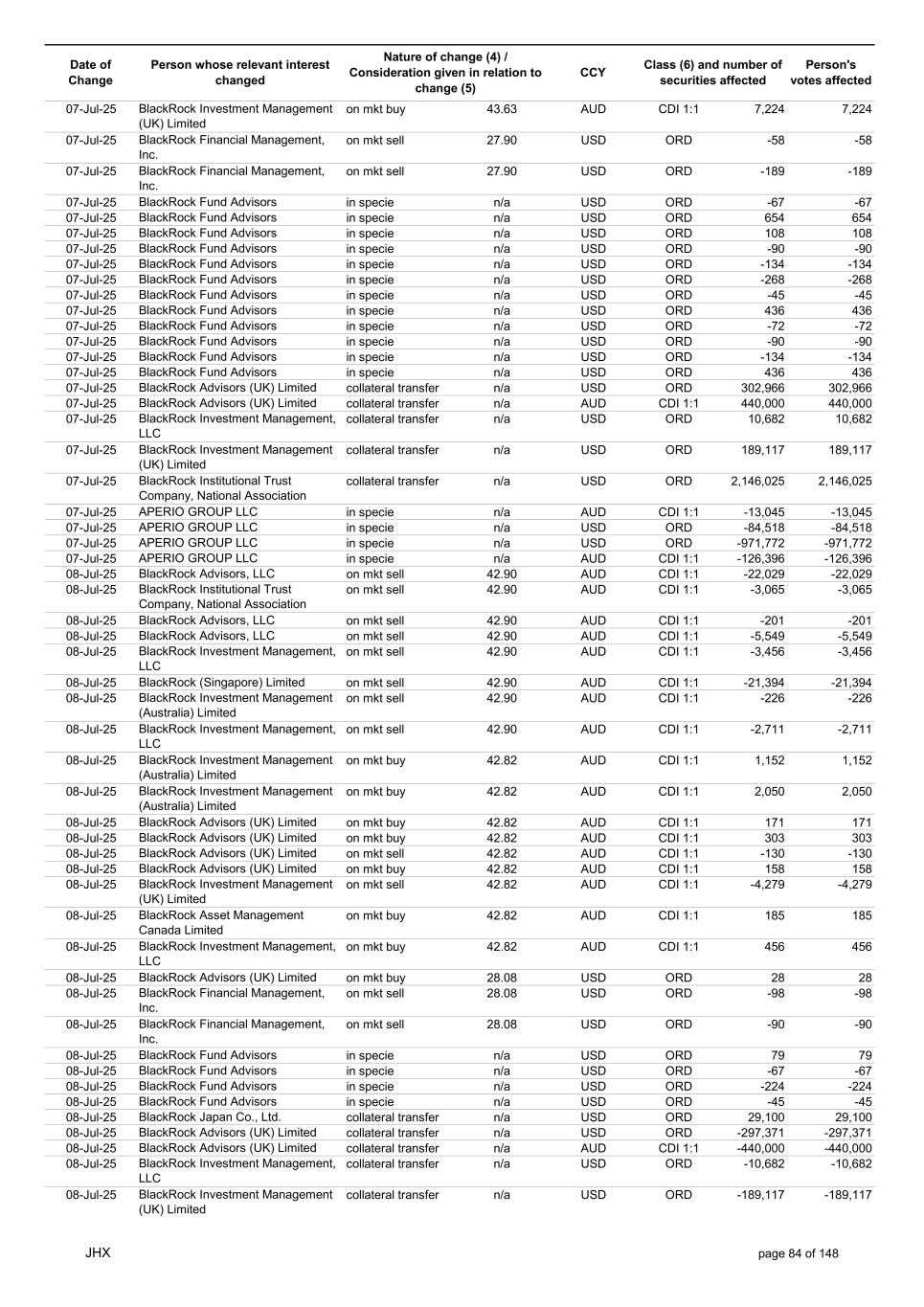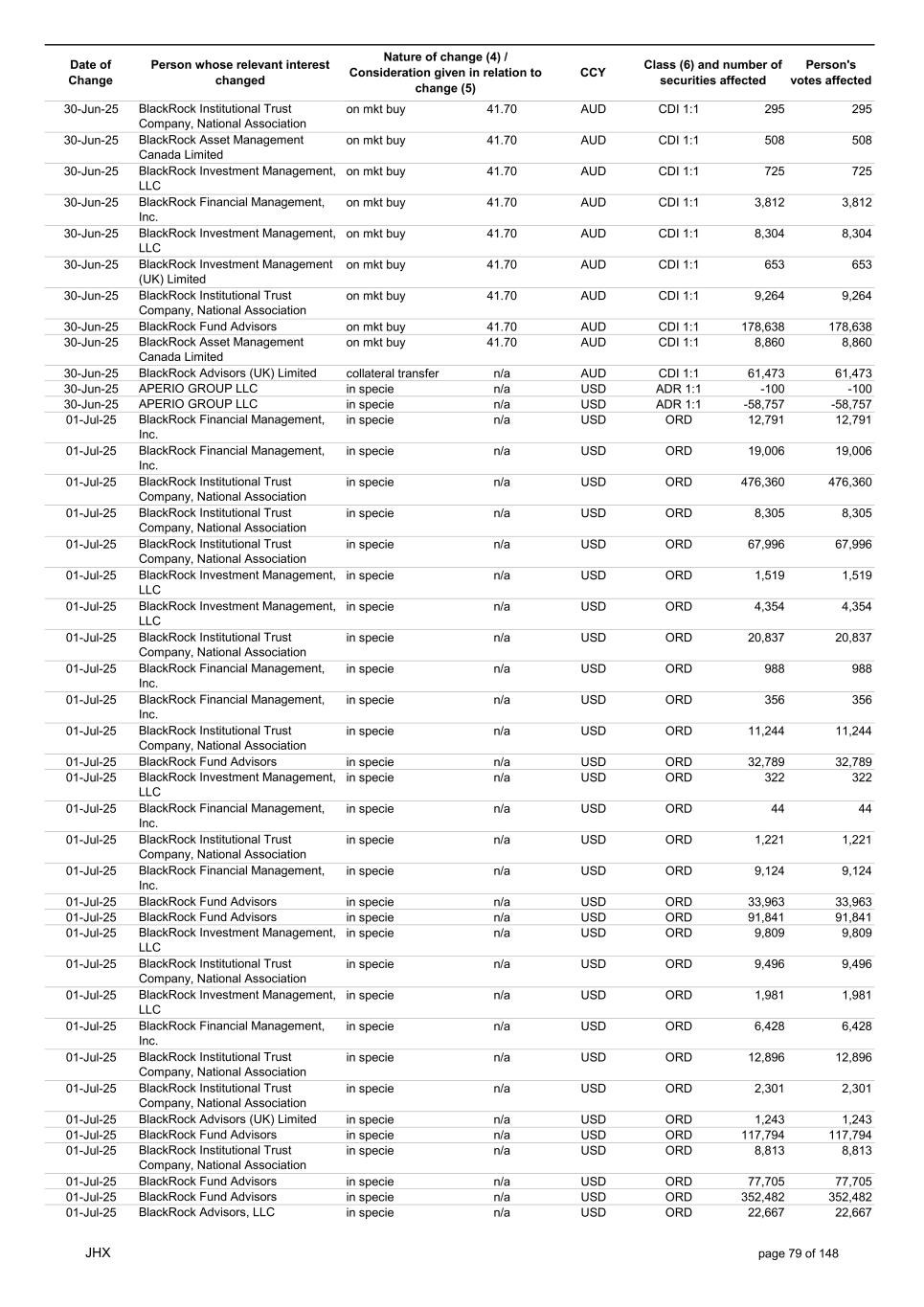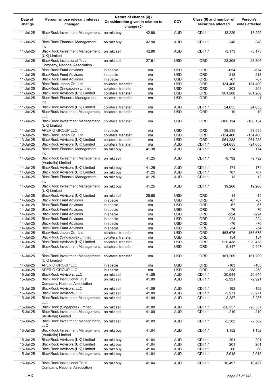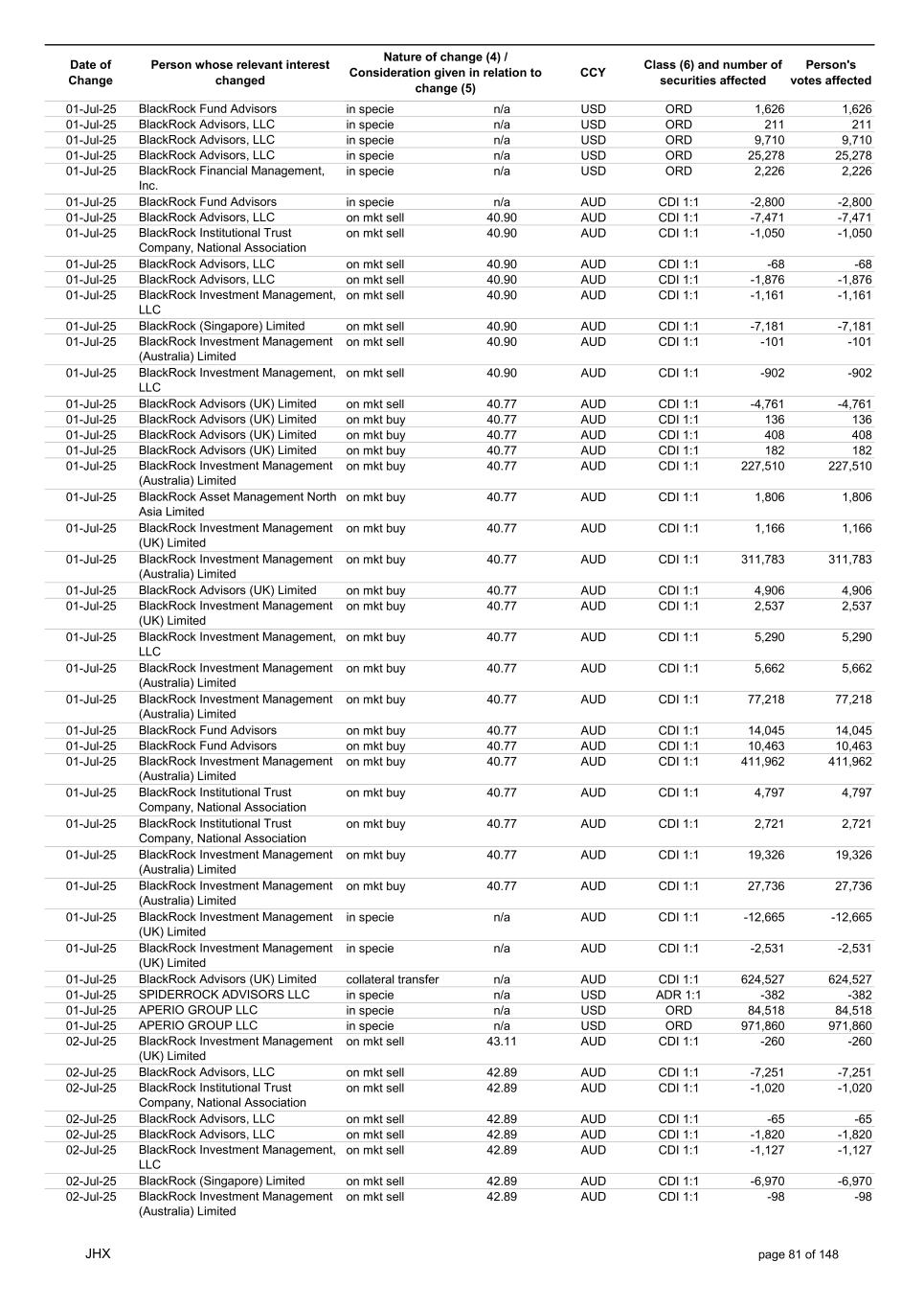 Date of Change Person whose relevant interest changed Nature of change (4) / Consideration given in relation to change (5) Class (6) and number of securities affected Person's votes affected CCY 01-Jul-25 BlackRock Fund Advisors in specie n/a USD ORD 1,626 1,626 01-Jul-25 BlackRock Advisors, LLC in specie n/a USD ORD 211 211 01-Jul-25 BlackRock Advisors, LLC in specie n/a USD ORD 9,710 9,710 01-Jul-25 BlackRock Advisors, LLC in specie n/a USD ORD 25,278 25,278 01-Jul-25 BlackRock Financial Management, Inc. in specie n/a USD ORD 2,226 2,226 01-Jul-25 BlackRock Fund Advisors in specie n/a AUD CDI 1:1 -2,800 -2,800 01-Jul-25 BlackRock Advisors, LLC on mkt sell 40.90 AUD CDI 1:1 -7,471 -7,471 01-Jul-25 BlackRock Institutional Trust Company, National Association on mkt sell 40.90 AUD CDI 1:1 -1,050 -1,050 01-Jul-25 BlackRock Advisors, LLC on mkt sell 40.90 AUD CDI 1:1 -68 -68 01-Jul-25 BlackRock Advisors, LLC on mkt sell 40.90 AUD CDI 1:1 -1,876 -1,876 01-Jul-25 BlackRock Investment Management, LLC on mkt sell 40.90 AUD CDI 1:1 -1,161 -1,161 01-Jul-25 BlackRock (Singapore) Limited on mkt sell 40.90 AUD CDI 1:1 -7,181 -7,181 01-Jul-25 BlackRock Investment Management (Australia) Limited on mkt sell 40.90 AUD CDI 1:1 -101 -101 01-Jul-25 BlackRock Investment Management, LLC on mkt sell 40.90 AUD CDI 1:1 -902 -902 01-Jul-25 BlackRock Advisors (UK) Limited on mkt sell 40.77 AUD CDI 1:1 -4,761 -4,761 01-Jul-25 BlackRock Advisors (UK) Limited on mkt buy 40.77 AUD CDI 1:1 136 136 01-Jul-25 BlackRock Advisors (UK) Limited on mkt buy 40.77 AUD CDI 1:1 408 408 01-Jul-25 BlackRock Advisors (UK) Limited on mkt buy 40.77 AUD CDI 1:1 182 182 01-Jul-25 BlackRock Investment Management (Australia) Limited on mkt buy 40.77 AUD CDI 1:1 227,510 227,510 01-Jul-25 BlackRock Asset Management North Asia Limited on mkt buy 40.77 AUD CDI 1:1 1,806 1,806 01-Jul-25 BlackRock Investment Management (UK) Limited on mkt buy 40.77 AUD CDI 1:1 1,166 1,166 01-Jul-25 BlackRock Investment Management (Australia) Limited on mkt buy 40.77 AUD CDI 1:1 311,783 311,783 01-Jul-25 BlackRock Advisors (UK) Limited on mkt buy 40.77 AUD CDI 1:1 4,906 4,906 01-Jul-25 BlackRock Investment Management (UK) Limited on mkt buy 40.77 AUD CDI 1:1 2,537 2,537 01-Jul-25 BlackRock Investment Management, LLC on mkt buy 40.77 AUD CDI 1:1 5,290 5,290 01-Jul-25 BlackRock Investment Management (Australia) Limited on mkt buy 40.77 AUD CDI 1:1 5,662 5,662 01-Jul-25 BlackRock Investment Management (Australia) Limited on mkt buy 40.77 AUD CDI 1:1 77,218 77,218 01-Jul-25 BlackRock Fund Advisors on mkt buy 40.77 AUD CDI 1:1 14,045 14,045 01-Jul-25 BlackRock Fund Advisors on mkt buy 40.77 AUD CDI 1:1 10,463 10,463 01-Jul-25 BlackRock Investment Management (Australia) Limited on mkt buy 40.77 AUD CDI 1:1 411,962 411,962 01-Jul-25 BlackRock Institutional Trust Company, National Association on mkt buy 40.77 AUD CDI 1:1 4,797 4,797 01-Jul-25 BlackRock Institutional Trust Company, National Association on mkt buy 40.77 AUD CDI 1:1 2,721 2,721 01-Jul-25 BlackRock Investment Management (Australia) Limited on mkt buy 40.77 AUD CDI 1:1 19,326 19,326 01-Jul-25 BlackRock Investment Management (Australia) Limited on mkt buy 40.77 AUD CDI 1:1 27,736 27,736 01-Jul-25 BlackRock Investment Management (UK) Limited in specie n/a AUD CDI 1:1 -12,665 -12,665 01-Jul-25 BlackRock Investment Management (UK) Limited in specie n/a AUD CDI 1:1 -2,531 -2,531 01-Jul-25 BlackRock Advisors (UK) Limited collateral transfer n/a AUD CDI 1:1 624,527 624,527 01-Jul-25 SPIDERROCK ADVISORS LLC in specie n/a USD ADR 1:1 -382 -382 01-Jul-25 APERIO GROUP LLC in specie n/a USD ORD 84,518 84,518 01-Jul-25 APERIO GROUP LLC in specie n/a USD ORD 971,860 971,860 02-Jul-25 BlackRock Investment Management (UK) Limited on mkt sell 43.11 AUD CDI 1:1 -260 -260 02-Jul-25 BlackRock Advisors, LLC on mkt sell 42.89 AUD CDI 1:1 -7,251 -7,251 02-Jul-25 BlackRock Institutional Trust Company, National Association on mkt sell 42.89 AUD CDI 1:1 -1,020 -1,020 02-Jul-25 BlackRock Advisors, LLC on mkt sell 42.89 AUD CDI 1:1 -65 -65 02-Jul-25 BlackRock Advisors, LLC on mkt sell 42.89 AUD CDI 1:1 -1,820 -1,820 02-Jul-25 BlackRock Investment Management, LLC on mkt sell 42.89 AUD CDI 1:1 -1,127 -1,127 02-Jul-25 BlackRock (Singapore) Limited on mkt sell 42.89 AUD CDI 1:1 -6,970 -6,970 02-Jul-25 BlackRock Investment Management (Australia) Limited on mkt sell 42.89 AUD CDI 1:1 -98 -98 JHX page 81 of 148