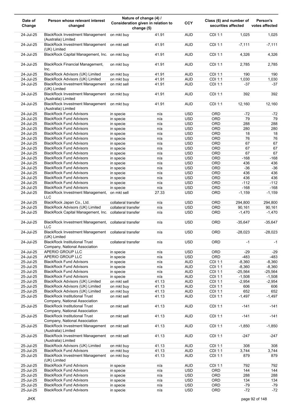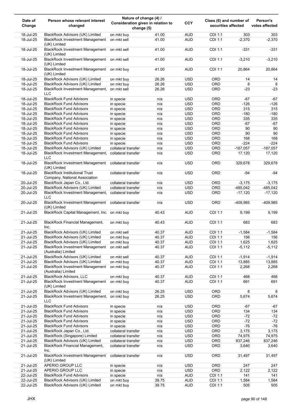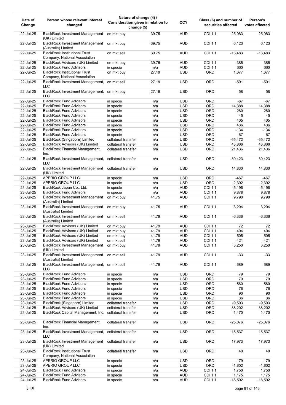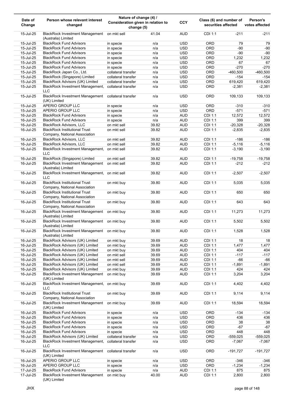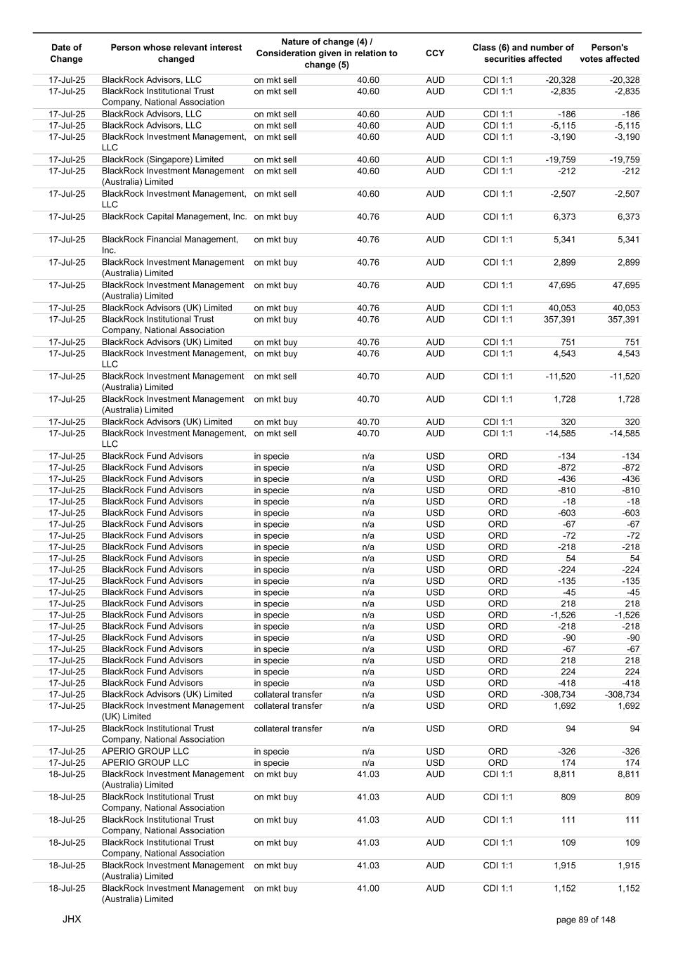 Date of Change Person whose relevant interest changed Nature of change (4) / Consideration given in relation to change (5) Class (6) and number of securities affected Person's votes affected CCY 17-Jul-25 BlackRock Advisors, LLC on mkt sell 40.60 AUD CDI 1:1 -20,328 -20,328 17-Jul-25 BlackRock Institutional Trust Company, National Association on mkt sell 40.60 AUD CDI 1:1 -2,835 -2,835 17-Jul-25 BlackRock Advisors, LLC on mkt sell 40.60 AUD CDI 1:1 -186 -186 17-Jul-25 BlackRock Advisors, LLC on mkt sell 40.60 AUD CDI 1:1 -5,115 -5,115 17-Jul-25 BlackRock Investment Management, LLC on mkt sell 40.60 AUD CDI 1:1 -3,190 -3,190 17-Jul-25 BlackRock (Singapore) Limited on mkt sell 40.60 AUD CDI 1:1 -19,759 -19,759 17-Jul-25 BlackRock Investment Management (Australia) Limited on mkt sell 40.60 AUD CDI 1:1 -212 -212 17-Jul-25 BlackRock Investment Management, LLC on mkt sell 40.60 AUD CDI 1:1 -2,507 -2,507 17-Jul-25 BlackRock Capital Management, Inc. on mkt buy 40.76 AUD CDI 1:1 6,373 6,373 17-Jul-25 BlackRock Financial Management, Inc. on mkt buy 40.76 AUD CDI 1:1 5,341 5,341 17-Jul-25 BlackRock Investment Management (Australia) Limited on mkt buy 40.76 AUD CDI 1:1 2,899 2,899 17-Jul-25 BlackRock Investment Management (Australia) Limited on mkt buy 40.76 AUD CDI 1:1 47,695 47,695 17-Jul-25 BlackRock Advisors (UK) Limited on mkt buy 40.76 AUD CDI 1:1 40,053 40,053 17-Jul-25 BlackRock Institutional Trust Company, National Association on mkt buy 40.76 AUD CDI 1:1 357,391 357,391 17-Jul-25 BlackRock Advisors (UK) Limited on mkt buy 40.76 AUD CDI 1:1 751 751 17-Jul-25 BlackRock Investment Management, LLC on mkt buy 40.76 AUD CDI 1:1 4,543 4,543 17-Jul-25 BlackRock Investment Management (Australia) Limited on mkt sell 40.70 AUD CDI 1:1 -11,520 -11,520 17-Jul-25 BlackRock Investment Management (Australia) Limited on mkt buy 40.70 AUD CDI 1:1 1,728 1,728 17-Jul-25 BlackRock Advisors (UK) Limited on mkt buy 40.70 AUD CDI 1:1 320 320 17-Jul-25 BlackRock Investment Management, LLC on mkt sell 40.70 AUD CDI 1:1 -14,585 -14,585 17-Jul-25 BlackRock Fund Advisors in specie n/a USD ORD -134 -134 17-Jul-25 BlackRock Fund Advisors in specie n/a USD ORD -872 -872 17-Jul-25 BlackRock Fund Advisors in specie n/a USD ORD -436 -436 17-Jul-25 BlackRock Fund Advisors in specie n/a USD ORD -810 -810 17-Jul-25 BlackRock Fund Advisors in specie n/a USD ORD -18 -18 17-Jul-25 BlackRock Fund Advisors in specie n/a USD ORD -603 -603 17-Jul-25 BlackRock Fund Advisors in specie n/a USD ORD -67 -67 17-Jul-25 BlackRock Fund Advisors in specie n/a USD ORD -72 -72 17-Jul-25 BlackRock Fund Advisors in specie n/a USD ORD -218 -218 17-Jul-25 BlackRock Fund Advisors in specie n/a USD ORD 54 54 17-Jul-25 BlackRock Fund Advisors in specie n/a USD ORD -224 -224 17-Jul-25 BlackRock Fund Advisors in specie n/a USD ORD -135 -135 17-Jul-25 BlackRock Fund Advisors in specie n/a USD ORD -45 -45 17-Jul-25 BlackRock Fund Advisors in specie n/a USD ORD 218 218 17-Jul-25 BlackRock Fund Advisors in specie n/a USD ORD -1,526 -1,526 17-Jul-25 BlackRock Fund Advisors in specie n/a USD ORD -218 -218 17-Jul-25 BlackRock Fund Advisors in specie n/a USD ORD -90 -90 17-Jul-25 BlackRock Fund Advisors in specie n/a USD ORD -67 -67 17-Jul-25 BlackRock Fund Advisors in specie n/a USD ORD 218 218 17-Jul-25 BlackRock Fund Advisors in specie n/a USD ORD 224 224 17-Jul-25 BlackRock Fund Advisors in specie n/a USD ORD -418 -418 17-Jul-25 BlackRock Advisors (UK) Limited collateral transfer n/a USD ORD -308,734 -308,734 17-Jul-25 BlackRock Investment Management (UK) Limited collateral transfer n/a USD ORD 1,692 1,692 17-Jul-25 BlackRock Institutional Trust Company, National Association collateral transfer n/a USD ORD 94 94 17-Jul-25 APERIO GROUP LLC in specie n/a USD ORD -326 -326 17-Jul-25 APERIO GROUP LLC in specie n/a USD ORD 174 174 18-Jul-25 BlackRock Investment Management (Australia) Limited on mkt buy 41.03 AUD CDI 1:1 8,811 8,811 18-Jul-25 BlackRock Institutional Trust Company, National Association on mkt buy 41.03 AUD CDI 1:1 809 809 18-Jul-25 BlackRock Institutional Trust Company, National Association on mkt buy 41.03 AUD CDI 1:1 111 111 18-Jul-25 BlackRock Institutional Trust Company, National Association on mkt buy 41.03 AUD CDI 1:1 109 109 18-Jul-25 BlackRock Investment Management (Australia) Limited on mkt buy 41.03 AUD CDI 1:1 1,915 1,915 18-Jul-25 BlackRock Investment Management (Australia) Limited on mkt buy 41.00 AUD CDI 1:1 1,152 1,152 JHX page 89 of 148