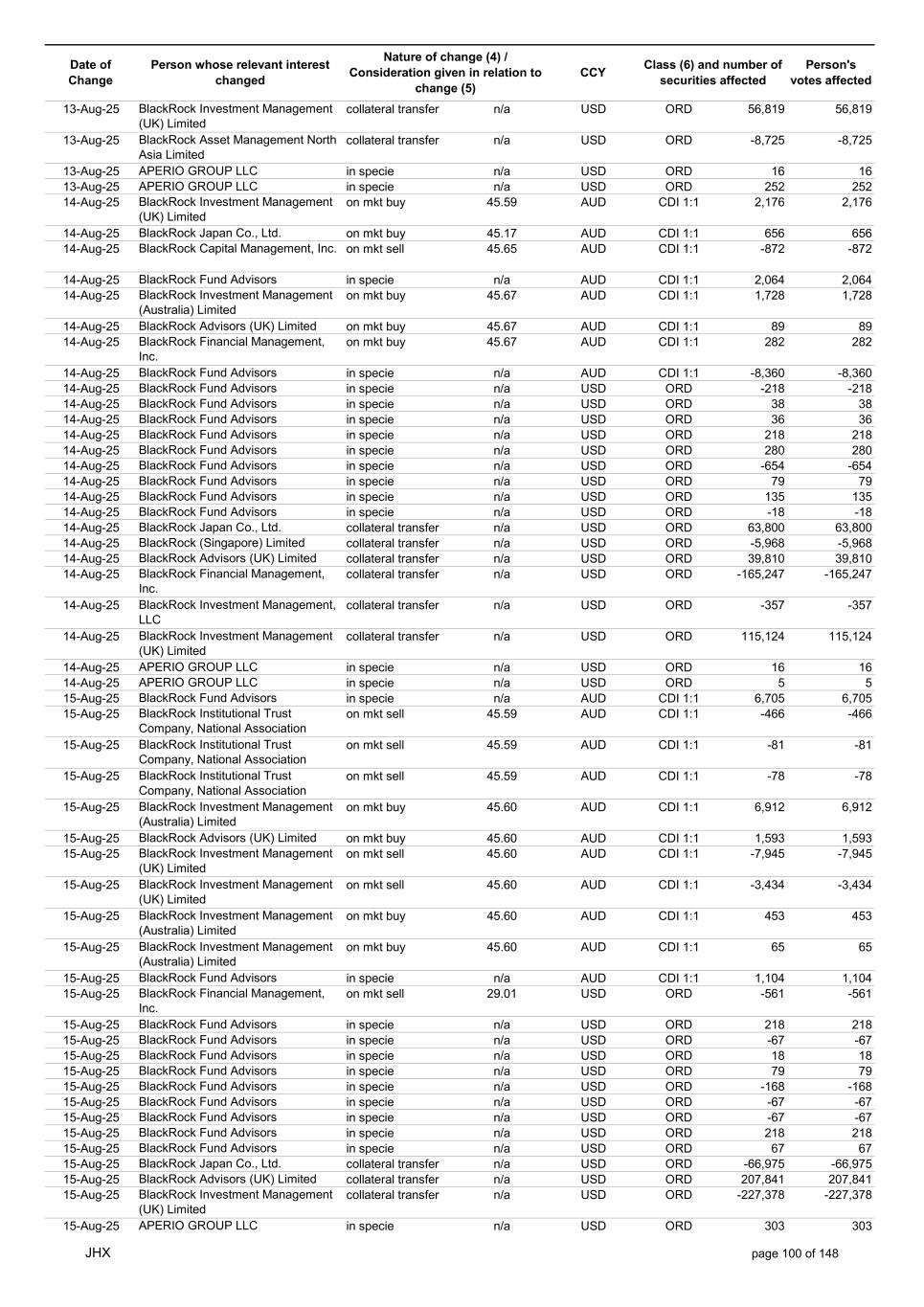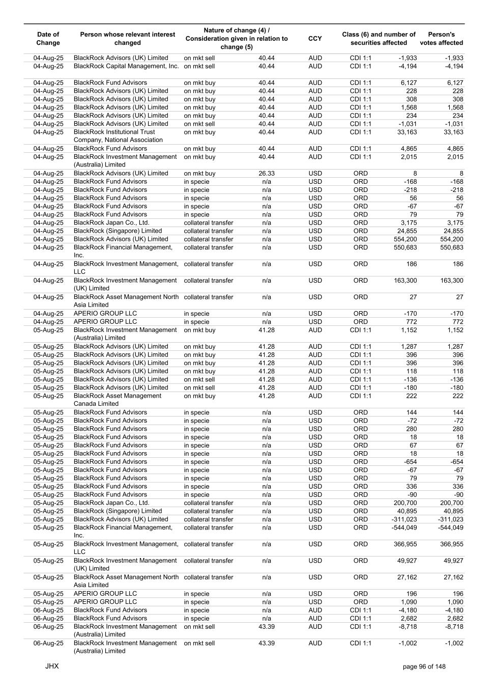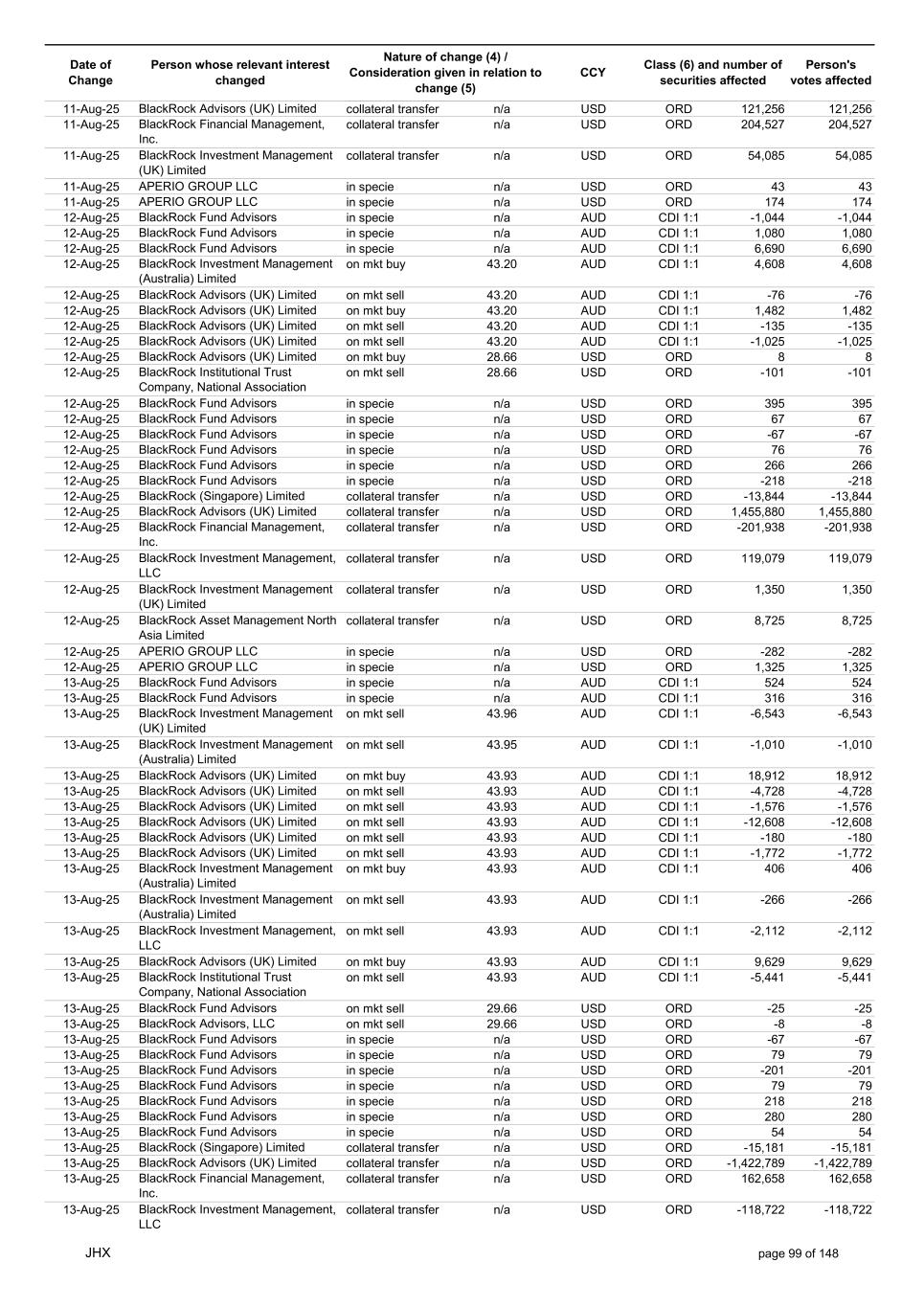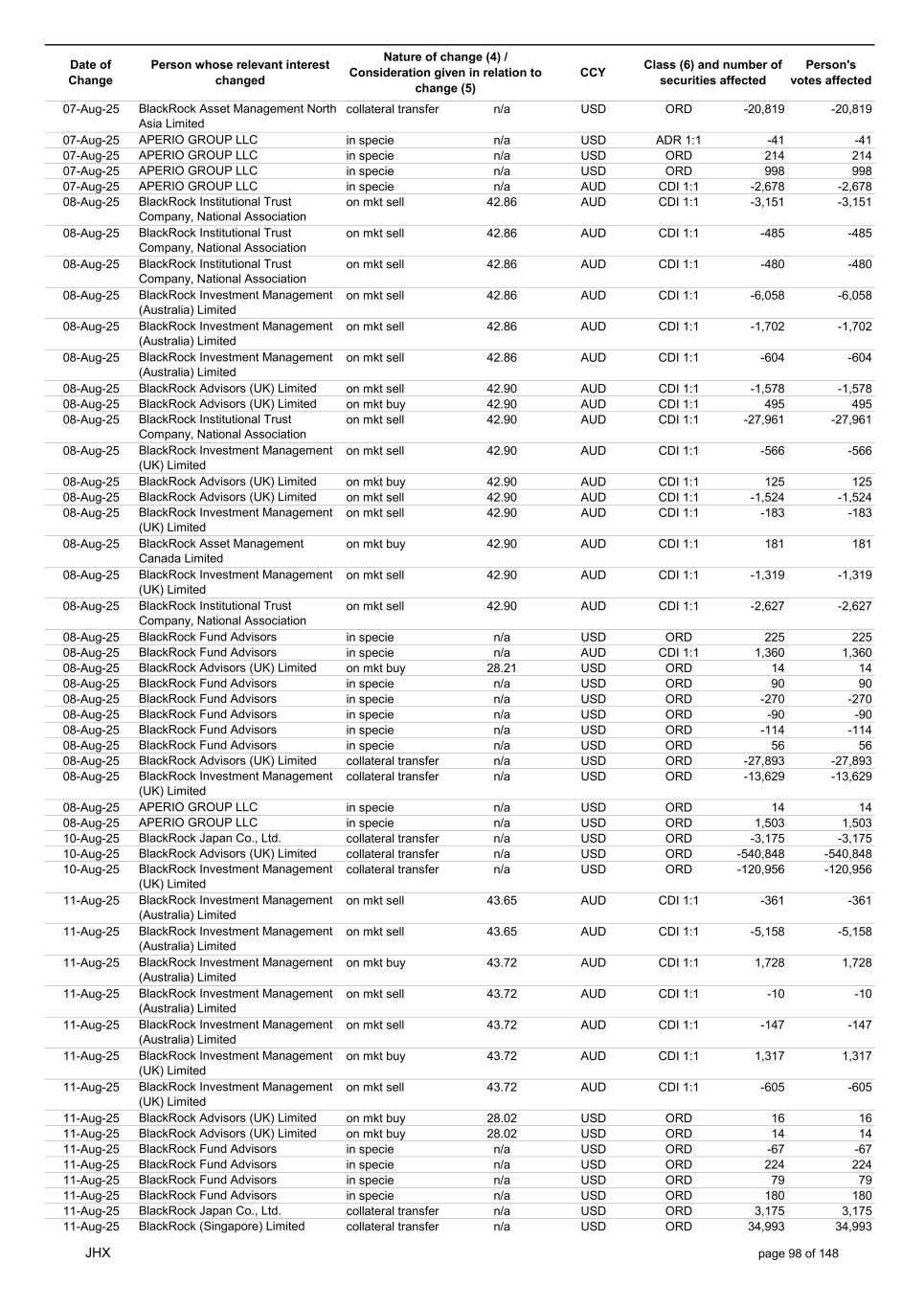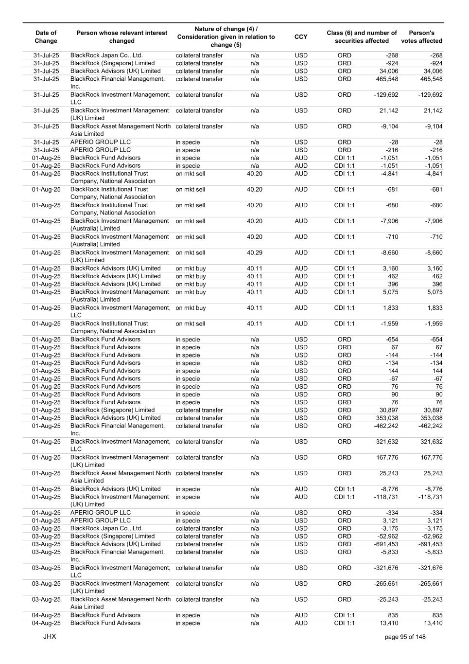 Date of Change Person whose relevant interest changed Nature of change (4) / Consideration given in relation to change (5) Class (6) and number of securities affected Person's votes affected CCY 13-Aug-25 BlackRock Investment Management (UK) Limited collateral transfer n/a USD ORD 56,819 56,819 13-Aug-25 BlackRock Asset Management North Asia Limited collateral transfer n/a USD ORD -8,725 -8,725 13-Aug-25 APERIO GROUP LLC in specie n/a USD ORD 16 16 13-Aug-25 APERIO GROUP LLC in specie n/a USD ORD 252 252 14-Aug-25 BlackRock Investment Management (UK) Limited on mkt buy 45.59 AUD CDI 1:1 2,176 2,176 14-Aug-25 BlackRock Japan Co., Ltd. on mkt buy 45.17 AUD CDI 1:1 656 656 14-Aug-25 BlackRock Capital Management, Inc. on mkt sell 45.65 AUD CDI 1:1 -872 -872 14-Aug-25 BlackRock Fund Advisors in specie n/a AUD CDI 1:1 2,064 2,064 14-Aug-25 BlackRock Investment Management (Australia) Limited on mkt buy 45.67 AUD CDI 1:1 1,728 1,728 14-Aug-25 BlackRock Advisors (UK) Limited on mkt buy 45.67 AUD CDI 1:1 89 89 14-Aug-25 BlackRock Financial Management, Inc. on mkt buy 45.67 AUD CDI 1:1 282 282 14-Aug-25 BlackRock Fund Advisors in specie n/a AUD CDI 1:1 -8,360 -8,360 14-Aug-25 BlackRock Fund Advisors in specie n/a USD ORD -218 -218 14-Aug-25 BlackRock Fund Advisors in specie n/a USD ORD 38 38 14-Aug-25 BlackRock Fund Advisors in specie n/a USD ORD 36 36 14-Aug-25 BlackRock Fund Advisors in specie n/a USD ORD 218 218 14-Aug-25 BlackRock Fund Advisors in specie n/a USD ORD 280 280 14-Aug-25 BlackRock Fund Advisors in specie n/a USD ORD -654 -654 14-Aug-25 BlackRock Fund Advisors in specie n/a USD ORD 79 79 14-Aug-25 BlackRock Fund Advisors in specie n/a USD ORD 135 135 14-Aug-25 BlackRock Fund Advisors in specie n/a USD ORD -18 -18 14-Aug-25 BlackRock Japan Co., Ltd. collateral transfer n/a USD ORD 63,800 63,800 14-Aug-25 BlackRock (Singapore) Limited collateral transfer n/a USD ORD -5,968 -5,968 14-Aug-25 BlackRock Advisors (UK) Limited collateral transfer n/a USD ORD 39,810 39,810 14-Aug-25 BlackRock Financial Management, Inc. collateral transfer n/a USD ORD -165,247 -165,247 14-Aug-25 BlackRock Investment Management, LLC collateral transfer n/a USD ORD -357 -357 14-Aug-25 BlackRock Investment Management (UK) Limited collateral transfer n/a USD ORD 115,124 115,124 14-Aug-25 APERIO GROUP LLC in specie n/a USD ORD 16 16 14-Aug-25 APERIO GROUP LLC in specie n/a USD ORD 5 5 15-Aug-25 BlackRock Fund Advisors in specie n/a AUD CDI 1:1 6,705 6,705 15-Aug-25 BlackRock Institutional Trust Company, National Association on mkt sell 45.59 AUD CDI 1:1 -466 -466 15-Aug-25 BlackRock Institutional Trust Company, National Association on mkt sell 45.59 AUD CDI 1:1 -81 -81 15-Aug-25 BlackRock Institutional Trust Company, National Association on mkt sell 45.59 AUD CDI 1:1 -78 -78 15-Aug-25 BlackRock Investment Management (Australia) Limited on mkt buy 45.60 AUD CDI 1:1 6,912 6,912 15-Aug-25 BlackRock Advisors (UK) Limited on mkt buy 45.60 AUD CDI 1:1 1,593 1,593 15-Aug-25 BlackRock Investment Management (UK) Limited on mkt sell 45.60 AUD CDI 1:1 -7,945 -7,945 15-Aug-25 BlackRock Investment Management (UK) Limited on mkt sell 45.60 AUD CDI 1:1 -3,434 -3,434 15-Aug-25 BlackRock Investment Management (Australia) Limited on mkt buy 45.60 AUD CDI 1:1 453 453 15-Aug-25 BlackRock Investment Management (Australia) Limited on mkt buy 45.60 AUD CDI 1:1 65 65 15-Aug-25 BlackRock Fund Advisors in specie n/a AUD CDI 1:1 1,104 1,104 15-Aug-25 BlackRock Financial Management, Inc. on mkt sell 29.01 USD ORD -561 -561 15-Aug-25 BlackRock Fund Advisors in specie n/a USD ORD 218 218 15-Aug-25 BlackRock Fund Advisors in specie n/a USD ORD -67 -67 15-Aug-25 BlackRock Fund Advisors in specie n/a USD ORD 18 18 15-Aug-25 BlackRock Fund Advisors in specie n/a USD ORD 79 79 15-Aug-25 BlackRock Fund Advisors in specie n/a USD ORD -168 -168 15-Aug-25 BlackRock Fund Advisors in specie n/a USD ORD -67 -67 15-Aug-25 BlackRock Fund Advisors in specie n/a USD ORD -67 -67 15-Aug-25 BlackRock Fund Advisors in specie n/a USD ORD 218 218 15-Aug-25 BlackRock Fund Advisors in specie n/a USD ORD 67 67 15-Aug-25 BlackRock Japan Co., Ltd. collateral transfer n/a USD ORD -66,975 -66,975 15-Aug-25 BlackRock Advisors (UK) Limited collateral transfer n/a USD ORD 207,841 207,841 15-Aug-25 BlackRock Investment Management (UK) Limited collateral transfer n/a USD ORD -227,378 -227,378 15-Aug-25 APERIO GROUP LLC in specie n/a USD ORD 303 303 JHX page 100 of 148