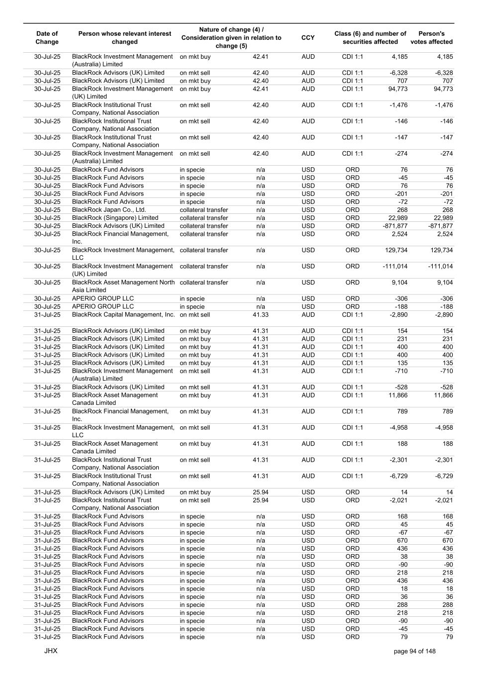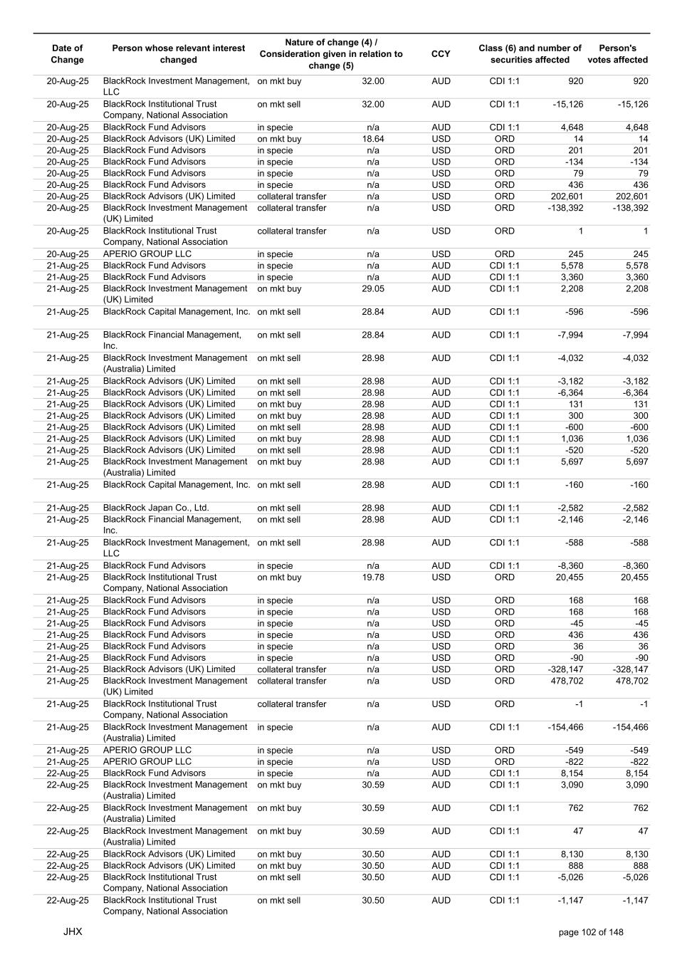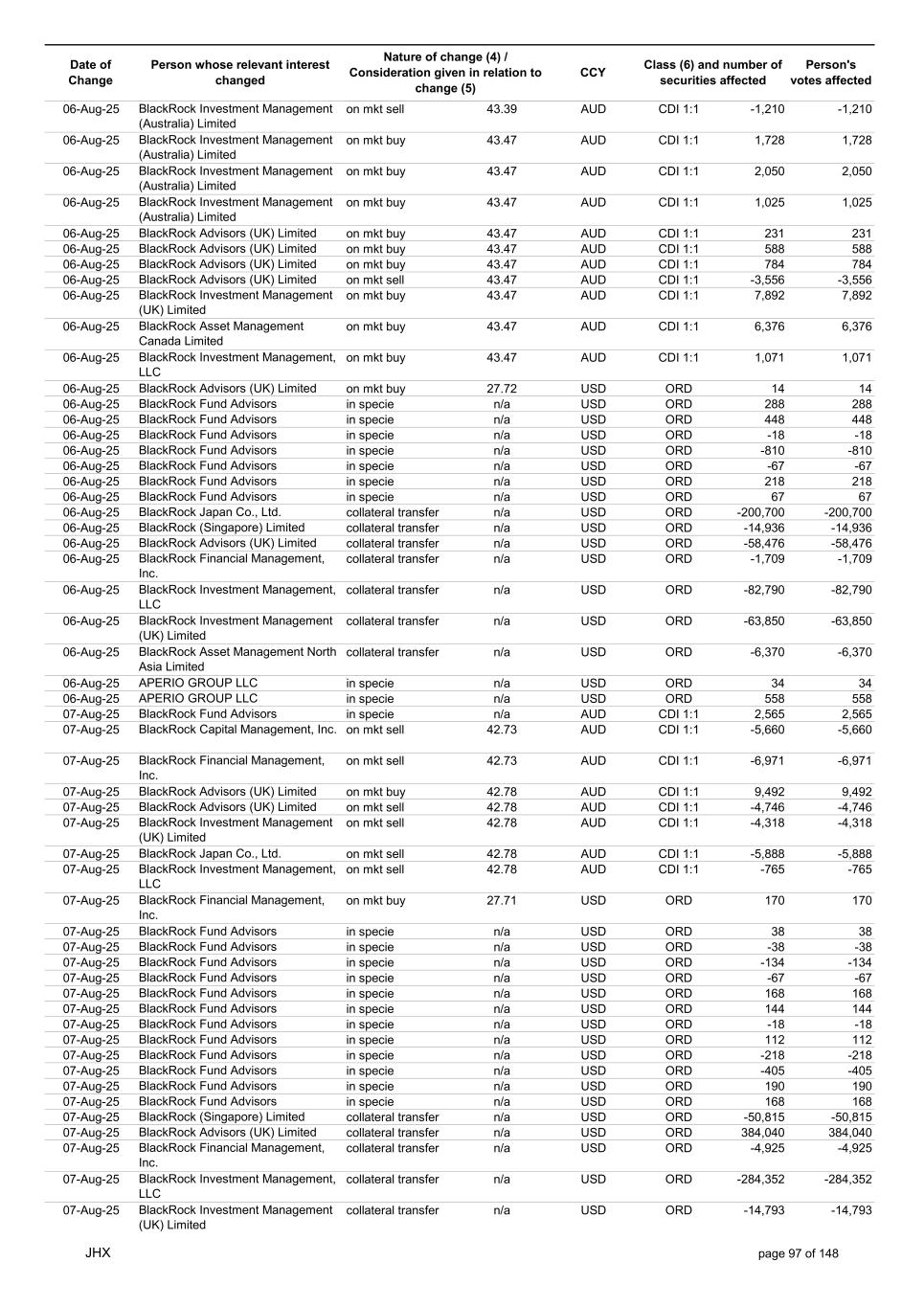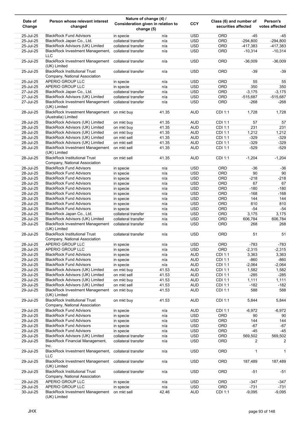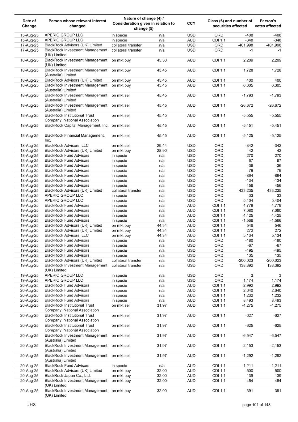 Date of Change Person whose relevant interest changed Nature of change (4) / Consideration given in relation to change (5) Class (6) and number of securities affected Person's votes affected CCY 13-Aug-25 BlackRock Investment Management (UK) Limited collateral transfer n/a USD ORD 56,819 56,819 13-Aug-25 BlackRock Asset Management North Asia Limited collateral transfer n/a USD ORD -8,725 -8,725 13-Aug-25 APERIO GROUP LLC in specie n/a USD ORD 16 16 13-Aug-25 APERIO GROUP LLC in specie n/a USD ORD 252 252 14-Aug-25 BlackRock Investment Management (UK) Limited on mkt buy 45.59 AUD CDI 1:1 2,176 2,176 14-Aug-25 BlackRock Japan Co., Ltd. on mkt buy 45.17 AUD CDI 1:1 656 656 14-Aug-25 BlackRock Capital Management, Inc. on mkt sell 45.65 AUD CDI 1:1 -872 -872 14-Aug-25 BlackRock Fund Advisors in specie n/a AUD CDI 1:1 2,064 2,064 14-Aug-25 BlackRock Investment Management (Australia) Limited on mkt buy 45.67 AUD CDI 1:1 1,728 1,728 14-Aug-25 BlackRock Advisors (UK) Limited on mkt buy 45.67 AUD CDI 1:1 89 89 14-Aug-25 BlackRock Financial Management, Inc. on mkt buy 45.67 AUD CDI 1:1 282 282 14-Aug-25 BlackRock Fund Advisors in specie n/a AUD CDI 1:1 -8,360 -8,360 14-Aug-25 BlackRock Fund Advisors in specie n/a USD ORD -218 -218 14-Aug-25 BlackRock Fund Advisors in specie n/a USD ORD 38 38 14-Aug-25 BlackRock Fund Advisors in specie n/a USD ORD 36 36 14-Aug-25 BlackRock Fund Advisors in specie n/a USD ORD 218 218 14-Aug-25 BlackRock Fund Advisors in specie n/a USD ORD 280 280 14-Aug-25 BlackRock Fund Advisors in specie n/a USD ORD -654 -654 14-Aug-25 BlackRock Fund Advisors in specie n/a USD ORD 79 79 14-Aug-25 BlackRock Fund Advisors in specie n/a USD ORD 135 135 14-Aug-25 BlackRock Fund Advisors in specie n/a USD ORD -18 -18 14-Aug-25 BlackRock Japan Co., Ltd. collateral transfer n/a USD ORD 63,800 63,800 14-Aug-25 BlackRock (Singapore) Limited collateral transfer n/a USD ORD -5,968 -5,968 14-Aug-25 BlackRock Advisors (UK) Limited collateral transfer n/a USD ORD 39,810 39,810 14-Aug-25 BlackRock Financial Management, Inc. collateral transfer n/a USD ORD -165,247 -165,247 14-Aug-25 BlackRock Investment Management, LLC collateral transfer n/a USD ORD -357 -357 14-Aug-25 BlackRock Investment Management (UK) Limited collateral transfer n/a USD ORD 115,124 115,124 14-Aug-25 APERIO GROUP LLC in specie n/a USD ORD 16 16 14-Aug-25 APERIO GROUP LLC in specie n/a USD ORD 5 5 15-Aug-25 BlackRock Fund Advisors in specie n/a AUD CDI 1:1 6,705 6,705 15-Aug-25 BlackRock Institutional Trust Company, National Association on mkt sell 45.59 AUD CDI 1:1 -466 -466 15-Aug-25 BlackRock Institutional Trust Company, National Association on mkt sell 45.59 AUD CDI 1:1 -81 -81 15-Aug-25 BlackRock Institutional Trust Company, National Association on mkt sell 45.59 AUD CDI 1:1 -78 -78 15-Aug-25 BlackRock Investment Management (Australia) Limited on mkt buy 45.60 AUD CDI 1:1 6,912 6,912 15-Aug-25 BlackRock Advisors (UK) Limited on mkt buy 45.60 AUD CDI 1:1 1,593 1,593 15-Aug-25 BlackRock Investment Management (UK) Limited on mkt sell 45.60 AUD CDI 1:1 -7,945 -7,945 15-Aug-25 BlackRock Investment Management (UK) Limited on mkt sell 45.60 AUD CDI 1:1 -3,434 -3,434 15-Aug-25 BlackRock Investment Management (Australia) Limited on mkt buy 45.60 AUD CDI 1:1 453 453 15-Aug-25 BlackRock Investment Management (Australia) Limited on mkt buy 45.60 AUD CDI 1:1 65 65 15-Aug-25 BlackRock Fund Advisors in specie n/a AUD CDI 1:1 1,104 1,104 15-Aug-25 BlackRock Financial Management, Inc. on mkt sell 29.01 USD ORD -561 -561 15-Aug-25 BlackRock Fund Advisors in specie n/a USD ORD 218 218 15-Aug-25 BlackRock Fund Advisors in specie n/a USD ORD -67 -67 15-Aug-25 BlackRock Fund Advisors in specie n/a USD ORD 18 18 15-Aug-25 BlackRock Fund Advisors in specie n/a USD ORD 79 79 15-Aug-25 BlackRock Fund Advisors in specie n/a USD ORD -168 -168 15-Aug-25 BlackRock Fund Advisors in specie n/a USD ORD -67 -67 15-Aug-25 BlackRock Fund Advisors in specie n/a USD ORD -67 -67 15-Aug-25 BlackRock Fund Advisors in specie n/a USD ORD 218 218 15-Aug-25 BlackRock Fund Advisors in specie n/a USD ORD 67 67 15-Aug-25 BlackRock Japan Co., Ltd. collateral transfer n/a USD ORD -66,975 -66,975 15-Aug-25 BlackRock Advisors (UK) Limited collateral transfer n/a USD ORD 207,841 207,841 15-Aug-25 BlackRock Investment Management (UK) Limited collateral transfer n/a USD ORD -227,378 -227,378 15-Aug-25 APERIO GROUP LLC in specie n/a USD ORD 303 303 JHX page 100 of 148
