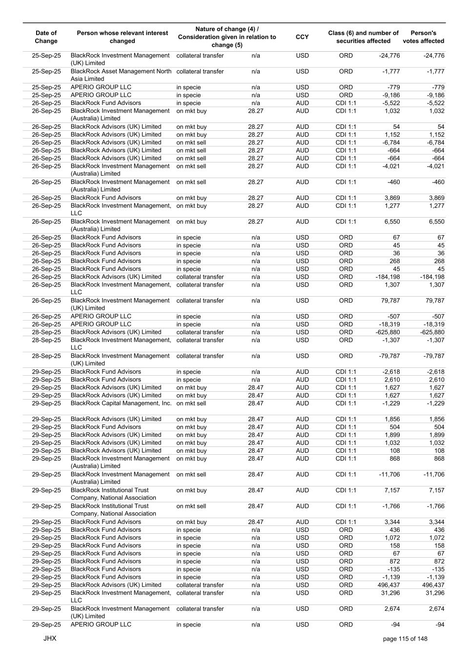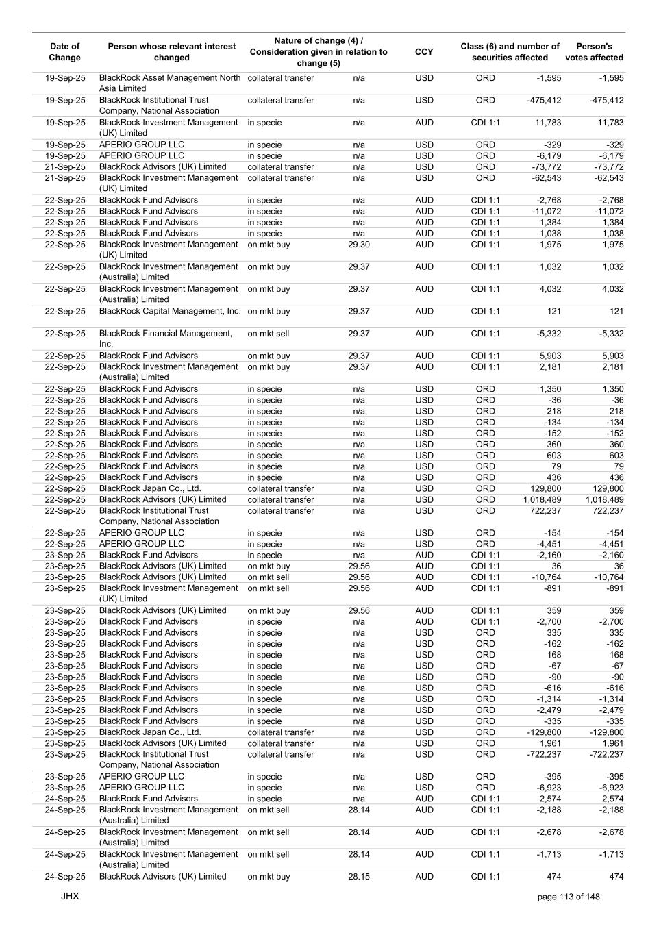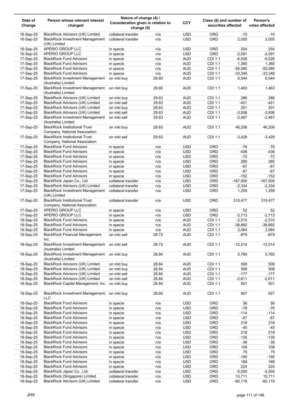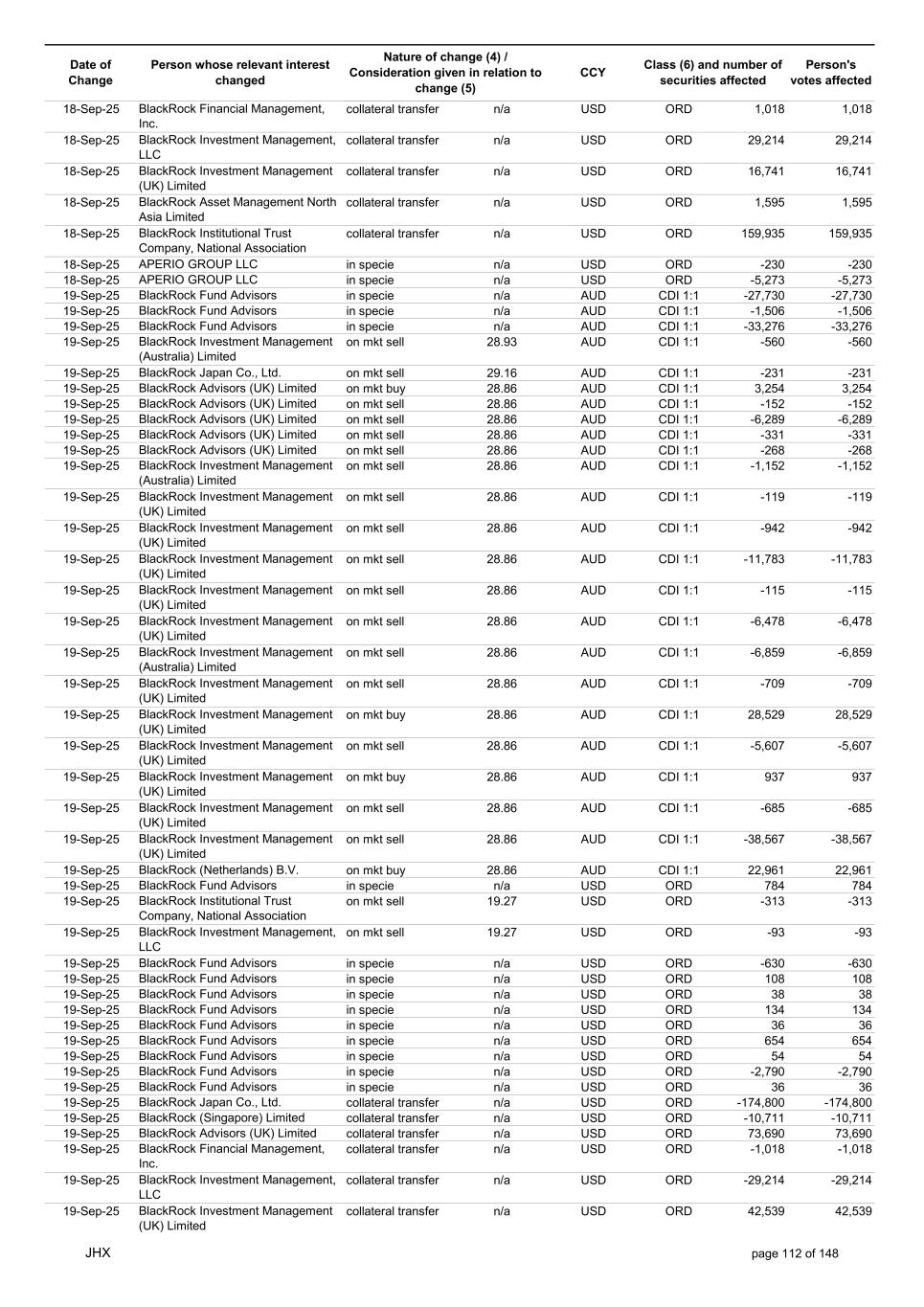 Date of Change Person whose relevant interest changed Nature of change (4) / Consideration given in relation to change (5) Class (6) and number of securities affected Person's votes affected CCY 05-Sep-25 BlackRock Investment Management, LLC collateral transfer n/a USD ORD -47,632 -47,632 05-Sep-25 BlackRock Investment Management (UK) Limited collateral transfer n/a USD ORD -141,955 -141,955 05-Sep-25 BlackRock Asset Management North Asia Limited collateral transfer n/a USD ORD -112 -112 05-Sep-25 APERIO GROUP LLC in specie n/a USD ORD -1,497 -1,497 05-Sep-25 APERIO GROUP LLC in specie n/a USD ORD -12,364 -12,364 07-Sep-25 BlackRock Advisors (UK) Limited collateral transfer n/a USD ORD -67,644 -67,644 08-Sep-25 BlackRock Capital Management, Inc. on mkt sell 30.94 AUD CDI 1:1 -293 -293 08-Sep-25 BlackRock Financial Management, Inc. on mkt sell 30.94 AUD CDI 1:1 -367 -367 08-Sep-25 BlackRock Investment Management (Australia) Limited on mkt buy 30.92 AUD CDI 1:1 6,336 6,336 08-Sep-25 BlackRock Investment Management (Australia) Limited on mkt buy 30.92 AUD CDI 1:1 2,064 2,064 08-Sep-25 BlackRock Advisors (UK) Limited on mkt buy 30.92 AUD CDI 1:1 1,505 1,505 08-Sep-25 BlackRock Advisors (UK) Limited on mkt sell 30.92 AUD CDI 1:1 -207 -207 08-Sep-25 BlackRock Investment Management (UK) Limited on mkt buy 30.92 AUD CDI 1:1 21,786 21,786 08-Sep-25 BlackRock Capital Management, Inc. on mkt sell 30.92 AUD CDI 1:1 -498 -498 08-Sep-25 BlackRock Financial Management, Inc. on mkt sell 30.92 AUD CDI 1:1 -629 -629 08-Sep-25 BlackRock Financial Management, Inc. in specie n/a AUD CDI 1:1 107,889 107,889 08-Sep-25 BlackRock Fund Advisors in specie n/a USD ORD -90 -90 08-Sep-25 BlackRock Fund Advisors in specie n/a USD ORD 67 67 08-Sep-25 BlackRock Fund Advisors in specie n/a USD ORD 180 180 08-Sep-25 BlackRock Advisors (UK) Limited in specie n/a AUD CDI 1:1 -7,079 -7,079 08-Sep-25 BlackRock Advisors (UK) Limited in specie n/a AUD CDI 1:1 -1,610 -1,610 08-Sep-25 BlackRock (Singapore) Limited collateral transfer n/a USD ORD 2,028 2,028 08-Sep-25 BlackRock Advisors (UK) Limited collateral transfer n/a USD ORD 38 38 08-Sep-25 BlackRock Financial Management, Inc. collateral transfer n/a USD ORD 53,796 53,796 08-Sep-25 BlackRock Investment Management (UK) Limited collateral transfer n/a USD ORD 14,044 14,044 08-Sep-25 APERIO GROUP LLC in specie n/a USD ORD -914 -914 08-Sep-25 APERIO GROUP LLC in specie n/a USD ORD -1,693 -1,693 09-Sep-25 BlackRock Fund Advisors in specie n/a AUD CDI 1:1 41,496 41,496 09-Sep-25 BlackRock Advisors (UK) Limited on mkt sell 30.20 AUD CDI 1:1 -1,627 -1,627 09-Sep-25 BlackRock Advisors (UK) Limited on mkt sell 30.20 AUD CDI 1:1 -3,014 -3,014 09-Sep-25 BlackRock Advisors (UK) Limited on mkt buy 30.20 AUD CDI 1:1 395 395 09-Sep-25 BlackRock Advisors (UK) Limited on mkt buy 30.20 AUD CDI 1:1 316 316 09-Sep-25 BlackRock Advisors (UK) Limited on mkt buy 30.20 AUD CDI 1:1 512 512 09-Sep-25 BlackRock Advisors (UK) Limited on mkt buy 30.20 AUD CDI 1:1 512 512 09-Sep-25 BlackRock Advisors (UK) Limited on mkt buy 30.20 AUD CDI 1:1 640 640 09-Sep-25 BlackRock Fund Advisors in specie n/a USD ORD -134 -134 09-Sep-25 BlackRock Fund Advisors in specie n/a USD ORD 395 395 09-Sep-25 BlackRock Fund Advisors in specie n/a USD ORD -450 -450 09-Sep-25 BlackRock Fund Advisors in specie n/a USD ORD 90 90 09-Sep-25 BlackRock Fund Advisors in specie n/a USD ORD 54 54 09-Sep-25 BlackRock Fund Advisors in specie n/a USD ORD 224 224 09-Sep-25 BlackRock Fund Advisors in specie n/a USD ORD 76 76 09-Sep-25 BlackRock Fund Advisors in specie n/a USD ORD 114 114 09-Sep-25 BlackRock Fund Advisors in specie n/a USD ORD 56 56 09-Sep-25 BlackRock Japan Co., Ltd. collateral transfer n/a USD ORD 46,700 46,700 09-Sep-25 BlackRock (Singapore) Limited collateral transfer n/a USD ORD 169 169 09-Sep-25 BlackRock Advisors (UK) Limited collateral transfer n/a USD ORD -17 -17 09-Sep-25 BlackRock Financial Management, Inc. collateral transfer n/a USD ORD -40 -40 09-Sep-25 BlackRock Investment Management, LLC collateral transfer n/a USD ORD 501 501 09-Sep-25 BlackRock Investment Management (UK) Limited collateral transfer n/a USD ORD -657 -657 09-Sep-25 BlackRock Asset Management North Asia Limited collateral transfer n/a USD ORD 26 26 09-Sep-25 BlackRock Institutional Trust Company, National Association collateral transfer n/a USD ORD 27,426 27,426 09-Sep-25 APERIO GROUP LLC in specie n/a USD ORD -740 -740 09-Sep-25 APERIO GROUP LLC in specie n/a USD ORD -7,768 -7,768 10-Sep-25 BlackRock Fund Advisors in specie n/a AUD CDI 1:1 4,540 4,540 JHX page 108 of 148