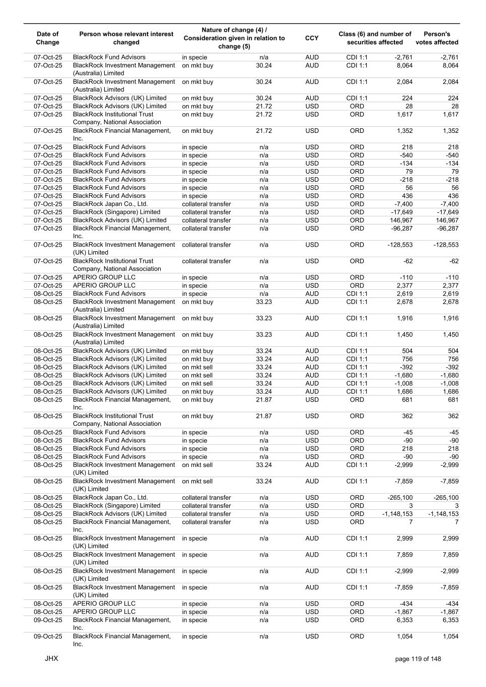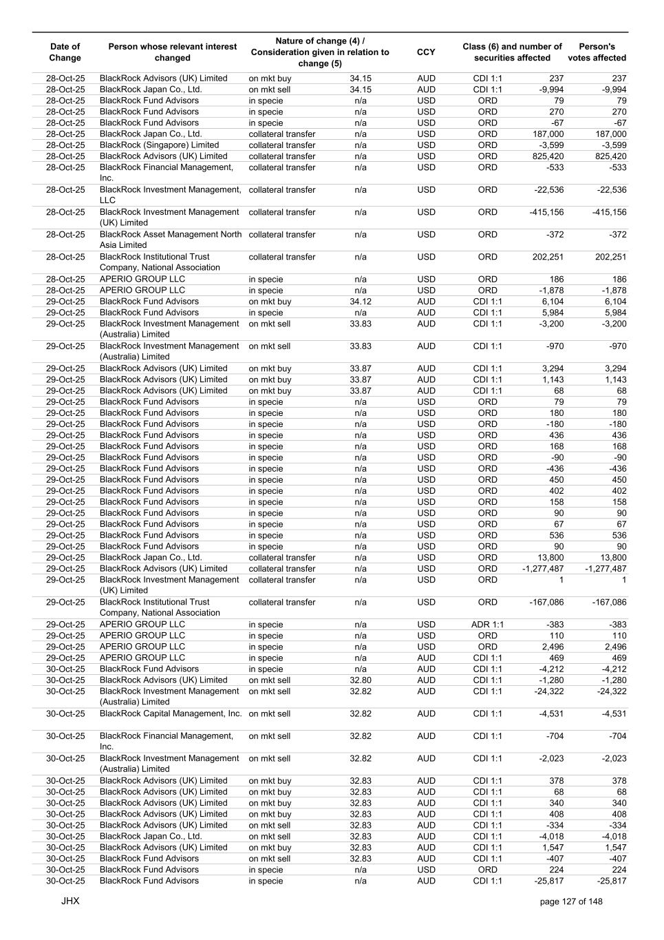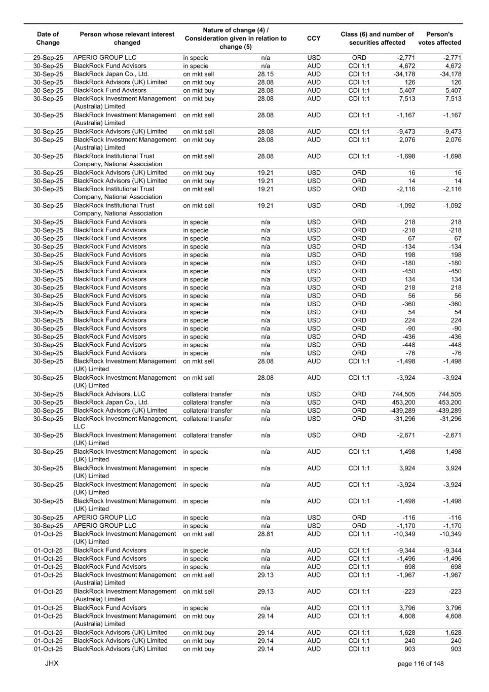 Date of Change Person whose relevant interest changed Nature of change (4) / Consideration given in relation to change (5) Class (6) and number of securities affected Person's votes affected CCY 22-Oct-25 APERIO GROUP LLC in specie n/a USD ORD -307 -307 22-Oct-25 APERIO GROUP LLC in specie n/a USD ORD -1,251 -1,251 23-Oct-25 BlackRock Institutional Trust Company, National Association in specie n/a AUD CDI 1:1 13,778 13,778 23-Oct-25 BlackRock Fund Advisors in specie n/a AUD CDI 1:1 1,580 1,580 23-Oct-25 BlackRock Capital Management, Inc. on mkt sell 33.37 AUD CDI 1:1 -1,502 -1,502 23-Oct-25 BlackRock Investment Management (Australia) Limited on mkt sell 33.37 AUD CDI 1:1 -408 -408 23-Oct-25 BlackRock Investment Management (Australia) Limited on mkt sell 33.37 AUD CDI 1:1 -7,879 -7,879 23-Oct-25 BlackRock Advisors (UK) Limited on mkt buy 33.41 AUD CDI 1:1 2,968 2,968 23-Oct-25 BlackRock Institutional Trust Company, National Association on mkt sell 33.41 AUD CDI 1:1 -30,356 -30,356 23-Oct-25 BlackRock Japan Co., Ltd. on mkt sell 33.41 AUD CDI 1:1 -6,483 -6,483 23-Oct-25 BlackRock Financial Management, Inc. on mkt sell 33.41 AUD CDI 1:1 -6,844 -6,844 23-Oct-25 BlackRock Financial Management, Inc. on mkt buy 33.41 AUD CDI 1:1 1,194 1,194 23-Oct-25 BlackRock Institutional Trust Company, National Association on mkt buy 33.41 AUD CDI 1:1 6,029 6,029 23-Oct-25 BlackRock Fund Advisors in specie n/a USD ORD -436 -436 23-Oct-25 BlackRock Fund Advisors in specie n/a USD ORD -134 -134 23-Oct-25 BlackRock Fund Advisors in specie n/a USD ORD -180 -180 23-Oct-25 BlackRock Fund Advisors in specie n/a USD ORD 135 135 23-Oct-25 BlackRock Fund Advisors in specie n/a USD ORD 79 79 23-Oct-25 BlackRock Fund Advisors in specie n/a USD ORD 112 112 23-Oct-25 BlackRock Fund Advisors in specie n/a USD ORD 18 18 23-Oct-25 BlackRock Fund Advisors in specie n/a USD ORD -2,616 -2,616 23-Oct-25 BlackRock Fund Advisors in specie n/a USD ORD 79 79 23-Oct-25 BlackRock Fund Advisors in specie n/a USD ORD -218 -218 23-Oct-25 BlackRock Fund Advisors in specie n/a USD ORD -342 -342 23-Oct-25 BlackRock Fund Advisors in specie n/a USD ORD 45 45 23-Oct-25 BlackRock Fund Advisors in specie n/a USD ORD 54 54 23-Oct-25 BlackRock Japan Co., Ltd. collateral transfer n/a USD ORD -474,700 -474,700 23-Oct-25 BlackRock Advisors (UK) Limited collateral transfer n/a USD ORD -641,916 -641,916 23-Oct-25 BlackRock Investment Management (UK) Limited collateral transfer n/a USD ORD 1,096,753 1,096,753 23-Oct-25 APERIO GROUP LLC in specie n/a USD ORD -110 -110 23-Oct-25 APERIO GROUP LLC in specie n/a USD ORD -3,637 -3,637 24-Oct-25 BlackRock Fund Advisors in specie n/a AUD CDI 1:1 1,056 1,056 24-Oct-25 BlackRock Investment Management (Australia) Limited on mkt sell 34.14 AUD CDI 1:1 -936 -936 24-Oct-25 BlackRock Investment Management (Australia) Limited on mkt sell 34.14 AUD CDI 1:1 -199 -199 24-Oct-25 BlackRock Investment Management (Australia) Limited on mkt buy 34.13 AUD CDI 1:1 1,144 1,144 24-Oct-25 BlackRock Investment Management (Australia) Limited on mkt buy 34.13 AUD CDI 1:1 5,720 5,720 24-Oct-25 BlackRock Advisors (UK) Limited on mkt buy 34.13 AUD CDI 1:1 1,484 1,484 24-Oct-25 BlackRock Advisors (UK) Limited on mkt buy 34.13 AUD CDI 1:1 1,008 1,008 24-Oct-25 BlackRock Advisors (UK) Limited on mkt buy 34.13 AUD CDI 1:1 378 378 24-Oct-25 BlackRock Advisors (UK) Limited on mkt sell 34.13 AUD CDI 1:1 -145 -145 24-Oct-25 BlackRock Advisors (UK) Limited on mkt sell 34.13 AUD CDI 1:1 -1,665 -1,665 24-Oct-25 BlackRock Advisors (UK) Limited on mkt sell 34.13 AUD CDI 1:1 -1,665 -1,665 24-Oct-25 BlackRock Advisors (UK) Limited on mkt sell 34.13 AUD CDI 1:1 -333 -333 24-Oct-25 BlackRock Investment Management (UK) Limited on mkt sell 34.13 AUD CDI 1:1 -1,863 -1,863 24-Oct-25 BlackRock Investment Management (Australia) Limited on mkt sell 34.13 AUD CDI 1:1 -11,789 -11,789 24-Oct-25 BlackRock Investment Management (Australia) Limited on mkt sell 34.13 AUD CDI 1:1 -2,506 -2,506 24-Oct-25 BlackRock Investment Management (UK) Limited on mkt sell 34.13 AUD CDI 1:1 -23,448 -23,448 24-Oct-25 BlackRock Fund Advisors in specie n/a AUD CDI 1:1 2,534 2,534 24-Oct-25 BlackRock Fund Advisors in specie n/a USD ORD 560 560 24-Oct-25 BlackRock Fund Advisors in specie n/a USD ORD -114 -114 24-Oct-25 BlackRock Fund Advisors in specie n/a USD ORD 36 36 24-Oct-25 BlackRock Fund Advisors in specie n/a USD ORD 1,323 1,323 24-Oct-25 BlackRock Fund Advisors in specie n/a USD ORD 45 45 24-Oct-25 BlackRock Fund Advisors in specie n/a USD ORD 336 336 24-Oct-25 BlackRock Japan Co., Ltd. collateral transfer n/a USD ORD 291,000 291,000 24-Oct-25 BlackRock (Singapore) Limited collateral transfer n/a USD ORD 3,535 3,535 JHX page 125 of 148