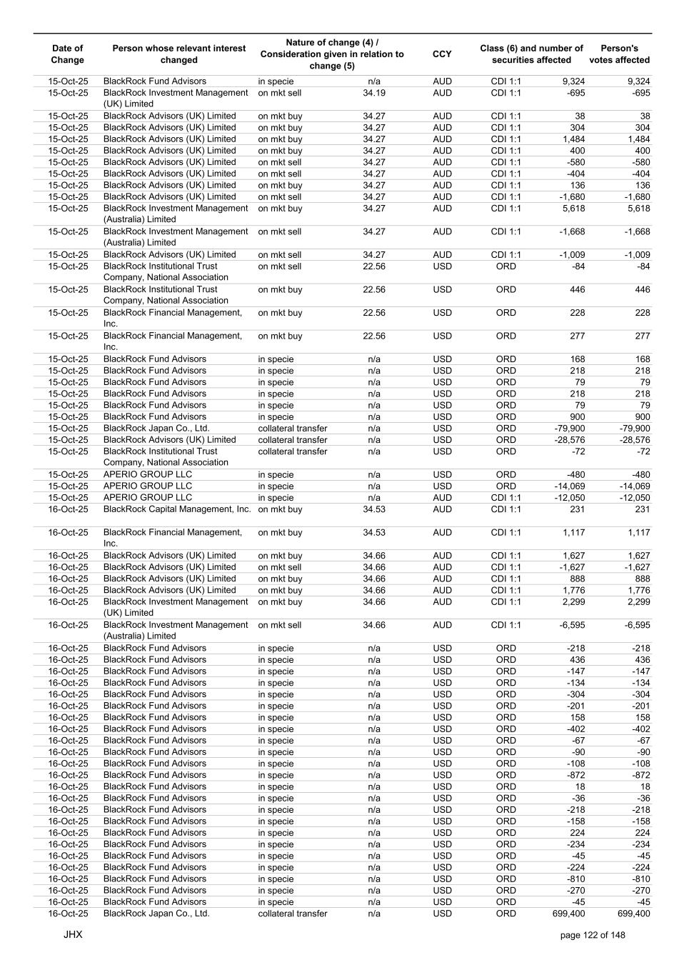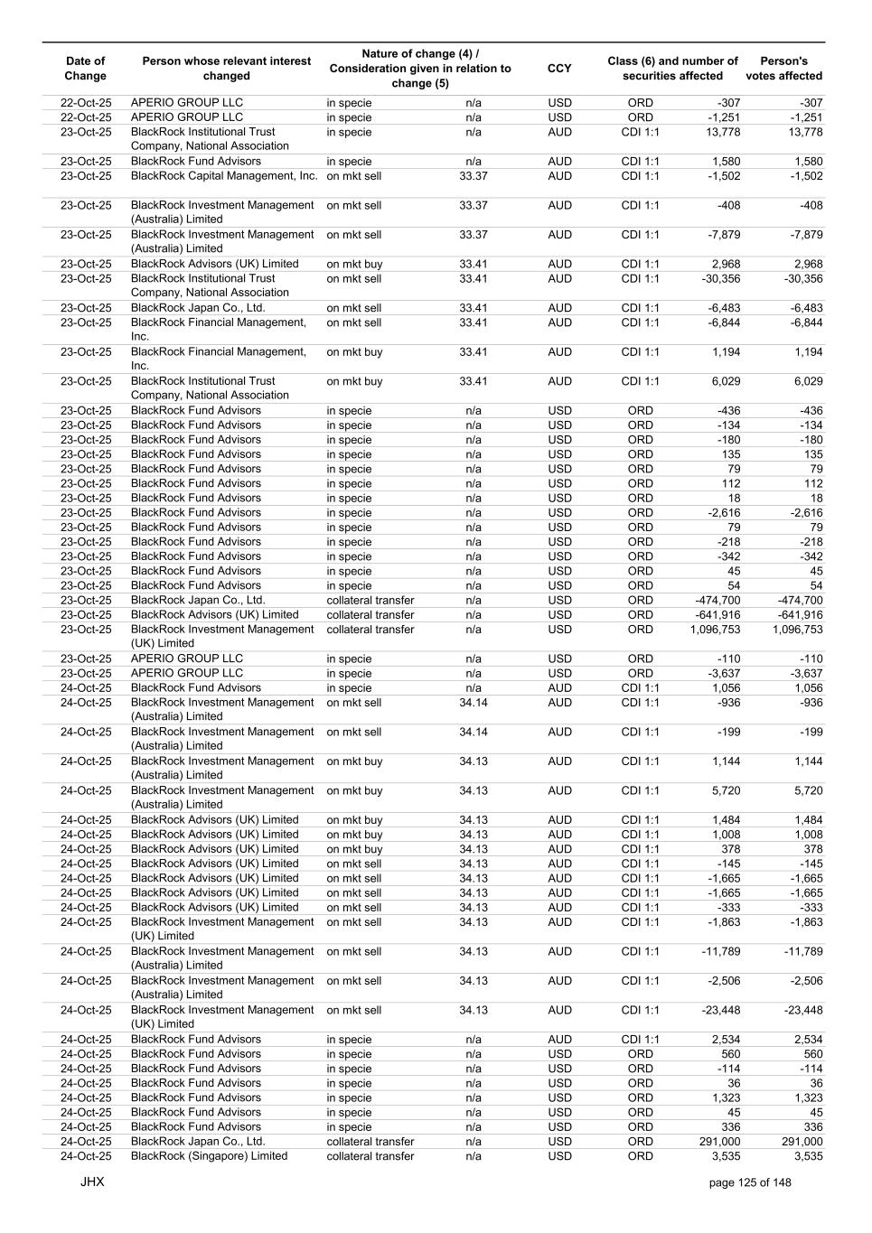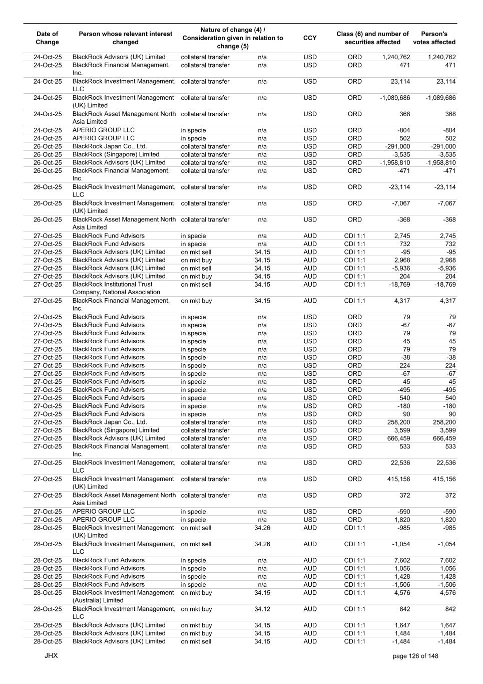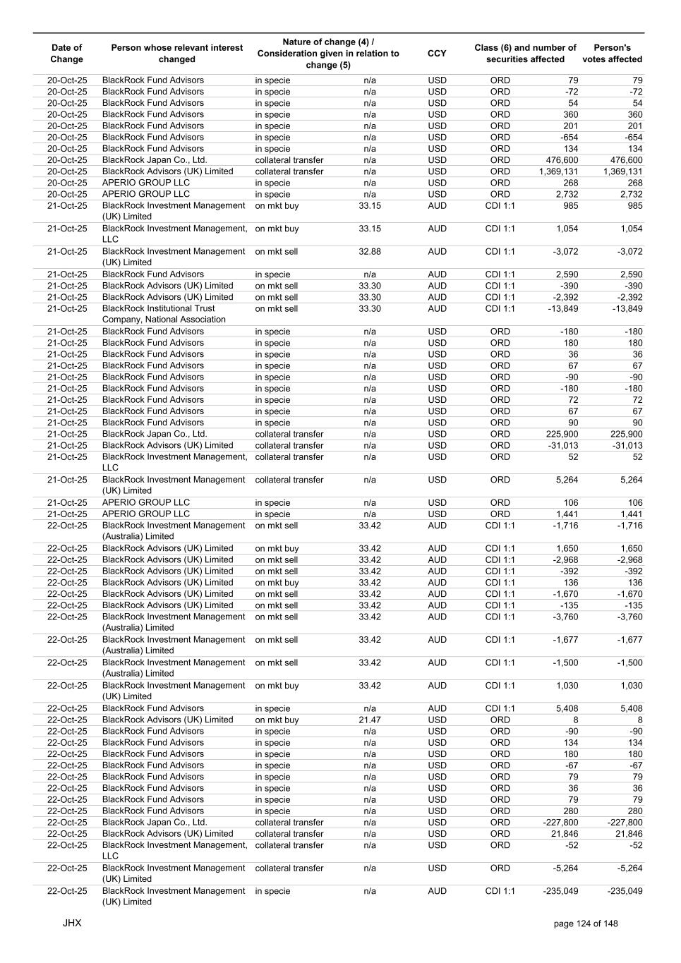 Date of Change Person whose relevant interest changed Nature of change (4) / Consideration given in relation to change (5) Class (6) and number of securities affected Person's votes affected CCY 22-Oct-25 APERIO GROUP LLC in specie n/a USD ORD -307 -307 22-Oct-25 APERIO GROUP LLC in specie n/a USD ORD -1,251 -1,251 23-Oct-25 BlackRock Institutional Trust Company, National Association in specie n/a AUD CDI 1:1 13,778 13,778 23-Oct-25 BlackRock Fund Advisors in specie n/a AUD CDI 1:1 1,580 1,580 23-Oct-25 BlackRock Capital Management, Inc. on mkt sell 33.37 AUD CDI 1:1 -1,502 -1,502 23-Oct-25 BlackRock Investment Management (Australia) Limited on mkt sell 33.37 AUD CDI 1:1 -408 -408 23-Oct-25 BlackRock Investment Management (Australia) Limited on mkt sell 33.37 AUD CDI 1:1 -7,879 -7,879 23-Oct-25 BlackRock Advisors (UK) Limited on mkt buy 33.41 AUD CDI 1:1 2,968 2,968 23-Oct-25 BlackRock Institutional Trust Company, National Association on mkt sell 33.41 AUD CDI 1:1 -30,356 -30,356 23-Oct-25 BlackRock Japan Co., Ltd. on mkt sell 33.41 AUD CDI 1:1 -6,483 -6,483 23-Oct-25 BlackRock Financial Management, Inc. on mkt sell 33.41 AUD CDI 1:1 -6,844 -6,844 23-Oct-25 BlackRock Financial Management, Inc. on mkt buy 33.41 AUD CDI 1:1 1,194 1,194 23-Oct-25 BlackRock Institutional Trust Company, National Association on mkt buy 33.41 AUD CDI 1:1 6,029 6,029 23-Oct-25 BlackRock Fund Advisors in specie n/a USD ORD -436 -436 23-Oct-25 BlackRock Fund Advisors in specie n/a USD ORD -134 -134 23-Oct-25 BlackRock Fund Advisors in specie n/a USD ORD -180 -180 23-Oct-25 BlackRock Fund Advisors in specie n/a USD ORD 135 135 23-Oct-25 BlackRock Fund Advisors in specie n/a USD ORD 79 79 23-Oct-25 BlackRock Fund Advisors in specie n/a USD ORD 112 112 23-Oct-25 BlackRock Fund Advisors in specie n/a USD ORD 18 18 23-Oct-25 BlackRock Fund Advisors in specie n/a USD ORD -2,616 -2,616 23-Oct-25 BlackRock Fund Advisors in specie n/a USD ORD 79 79 23-Oct-25 BlackRock Fund Advisors in specie n/a USD ORD -218 -218 23-Oct-25 BlackRock Fund Advisors in specie n/a USD ORD -342 -342 23-Oct-25 BlackRock Fund Advisors in specie n/a USD ORD 45 45 23-Oct-25 BlackRock Fund Advisors in specie n/a USD ORD 54 54 23-Oct-25 BlackRock Japan Co., Ltd. collateral transfer n/a USD ORD -474,700 -474,700 23-Oct-25 BlackRock Advisors (UK) Limited collateral transfer n/a USD ORD -641,916 -641,916 23-Oct-25 BlackRock Investment Management (UK) Limited collateral transfer n/a USD ORD 1,096,753 1,096,753 23-Oct-25 APERIO GROUP LLC in specie n/a USD ORD -110 -110 23-Oct-25 APERIO GROUP LLC in specie n/a USD ORD -3,637 -3,637 24-Oct-25 BlackRock Fund Advisors in specie n/a AUD CDI 1:1 1,056 1,056 24-Oct-25 BlackRock Investment Management (Australia) Limited on mkt sell 34.14 AUD CDI 1:1 -936 -936 24-Oct-25 BlackRock Investment Management (Australia) Limited on mkt sell 34.14 AUD CDI 1:1 -199 -199 24-Oct-25 BlackRock Investment Management (Australia) Limited on mkt buy 34.13 AUD CDI 1:1 1,144 1,144 24-Oct-25 BlackRock Investment Management (Australia) Limited on mkt buy 34.13 AUD CDI 1:1 5,720 5,720 24-Oct-25 BlackRock Advisors (UK) Limited on mkt buy 34.13 AUD CDI 1:1 1,484 1,484 24-Oct-25 BlackRock Advisors (UK) Limited on mkt buy 34.13 AUD CDI 1:1 1,008 1,008 24-Oct-25 BlackRock Advisors (UK) Limited on mkt buy 34.13 AUD CDI 1:1 378 378 24-Oct-25 BlackRock Advisors (UK) Limited on mkt sell 34.13 AUD CDI 1:1 -145 -145 24-Oct-25 BlackRock Advisors (UK) Limited on mkt sell 34.13 AUD CDI 1:1 -1,665 -1,665 24-Oct-25 BlackRock Advisors (UK) Limited on mkt sell 34.13 AUD CDI 1:1 -1,665 -1,665 24-Oct-25 BlackRock Advisors (UK) Limited on mkt sell 34.13 AUD CDI 1:1 -333 -333 24-Oct-25 BlackRock Investment Management (UK) Limited on mkt sell 34.13 AUD CDI 1:1 -1,863 -1,863 24-Oct-25 BlackRock Investment Management (Australia) Limited on mkt sell 34.13 AUD CDI 1:1 -11,789 -11,789 24-Oct-25 BlackRock Investment Management (Australia) Limited on mkt sell 34.13 AUD CDI 1:1 -2,506 -2,506 24-Oct-25 BlackRock Investment Management (UK) Limited on mkt sell 34.13 AUD CDI 1:1 -23,448 -23,448 24-Oct-25 BlackRock Fund Advisors in specie n/a AUD CDI 1:1 2,534 2,534 24-Oct-25 BlackRock Fund Advisors in specie n/a USD ORD 560 560 24-Oct-25 BlackRock Fund Advisors in specie n/a USD ORD -114 -114 24-Oct-25 BlackRock Fund Advisors in specie n/a USD ORD 36 36 24-Oct-25 BlackRock Fund Advisors in specie n/a USD ORD 1,323 1,323 24-Oct-25 BlackRock Fund Advisors in specie n/a USD ORD 45 45 24-Oct-25 BlackRock Fund Advisors in specie n/a USD ORD 336 336 24-Oct-25 BlackRock Japan Co., Ltd. collateral transfer n/a USD ORD 291,000 291,000 24-Oct-25 BlackRock (Singapore) Limited collateral transfer n/a USD ORD 3,535 3,535 JHX page 125 of 148