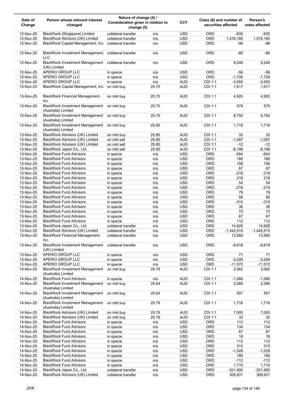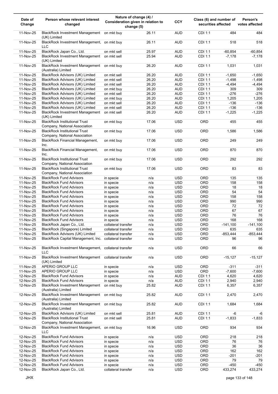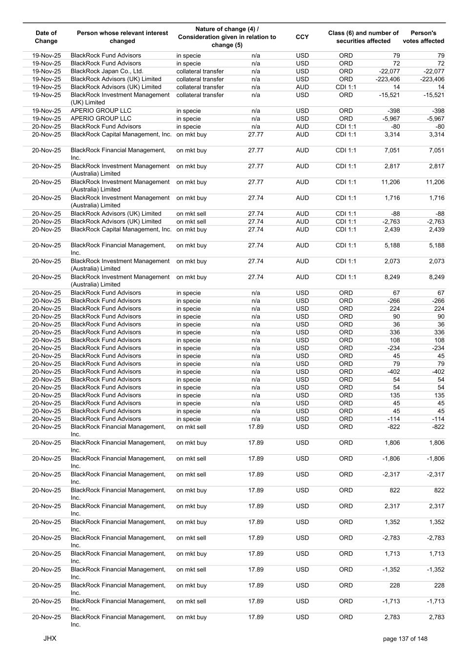 Date of Change Person whose relevant interest changed Nature of change (4) / Consideration given in relation to change (5) Class (6) and number of securities affected Person's votes affected CCY 05-Nov-25 BlackRock Investment Management (UK) Limited collateral transfer n/a USD ORD -56,454 -56,454 05-Nov-25 BlackRock Asset Management North Asia Limited collateral transfer n/a USD ORD 141,451 141,451 05-Nov-25 APERIO GROUP LLC in specie n/a USD ORD 421 421 05-Nov-25 APERIO GROUP LLC in specie n/a USD ORD 4,056 4,056 06-Nov-25 BlackRock Advisors (UK) Limited on mkt buy 25.75 AUD CDI 1:1 78 78 06-Nov-25 BlackRock Advisors (UK) Limited on mkt buy 25.75 AUD CDI 1:1 1,320 1,320 06-Nov-25 BlackRock Advisors (UK) Limited on mkt sell 25.75 AUD CDI 1:1 -668 -668 06-Nov-25 BlackRock Japan Co., Ltd. on mkt sell 25.75 AUD CDI 1:1 -1,164 -1,164 06-Nov-25 BlackRock Japan Co., Ltd. on mkt sell 25.75 AUD CDI 1:1 -2,813 -2,813 06-Nov-25 BlackRock Financial Management, Inc. on mkt buy 25.75 AUD CDI 1:1 733 733 06-Nov-25 BlackRock Financial Management, Inc. on mkt buy 25.75 AUD CDI 1:1 447 447 06-Nov-25 BlackRock Investment Management (UK) Limited on mkt buy 25.75 AUD CDI 1:1 738 738 06-Nov-25 BlackRock Investment Management (Australia) Limited on mkt buy 25.75 AUD CDI 1:1 1,406 1,406 06-Nov-25 BlackRock Investment Management (Australia) Limited on mkt buy 25.75 AUD CDI 1:1 3,733 3,733 06-Nov-25 BlackRock Investment Management (Australia) Limited on mkt buy 25.75 AUD CDI 1:1 6,132 6,132 06-Nov-25 BlackRock Advisors, LLC on mkt sell 17.34 USD ORD -10 -10 06-Nov-25 BlackRock Institutional Trust Company, National Association on mkt buy 17.34 USD ORD 1,653 1,653 06-Nov-25 BlackRock Financial Management, Inc. on mkt buy 17.34 USD ORD 969 969 06-Nov-25 BlackRock Financial Management, Inc. on mkt buy 17.34 USD ORD 921 921 06-Nov-25 BlackRock Fund Advisors in specie n/a USD ORD 54 54 06-Nov-25 BlackRock Fund Advisors in specie n/a USD ORD -67 -67 06-Nov-25 BlackRock Fund Advisors in specie n/a USD ORD -218 -218 06-Nov-25 BlackRock Fund Advisors in specie n/a USD ORD 36 36 06-Nov-25 BlackRock Fund Advisors in specie n/a USD ORD 79 79 06-Nov-25 BlackRock Fund Advisors in specie n/a USD ORD 54 54 06-Nov-25 BlackRock Fund Advisors in specie n/a USD ORD -76 -76 06-Nov-25 BlackRock Fund Advisors in specie n/a USD ORD 79 79 06-Nov-25 BlackRock Japan Co., Ltd. collateral transfer n/a USD ORD -429,400 -429,400 06-Nov-25 BlackRock (Singapore) Limited collateral transfer n/a USD ORD -107,727 -107,727 06-Nov-25 BlackRock Advisors (UK) Limited collateral transfer n/a USD ORD 1,160,015 1,160,015 06-Nov-25 BlackRock Financial Management, Inc. collateral transfer n/a USD ORD -14,126 -14,126 06-Nov-25 BlackRock Investment Management, LLC collateral transfer n/a USD ORD -457,167 -457,167 06-Nov-25 BlackRock Investment Management (UK) Limited collateral transfer n/a USD ORD -721,345 -721,345 06-Nov-25 BlackRock Asset Management North Asia Limited collateral transfer n/a USD ORD -145,536 -145,536 06-Nov-25 BlackRock Institutional Trust Company, National Association collateral transfer n/a USD ORD 70,767 70,767 06-Nov-25 APERIO GROUP LLC in specie n/a USD ORD -106 -106 06-Nov-25 APERIO GROUP LLC in specie n/a USD ORD -1,565 -1,565 07-Nov-25 BlackRock Fund Advisors in specie n/a AUD CDI 1:1 8,100 8,100 07-Nov-25 BlackRock Investment Management (Australia) Limited on mkt buy 26.11 AUD CDI 1:1 10,321 10,321 07-Nov-25 BlackRock Investment Management (Australia) Limited on mkt buy 26.11 AUD CDI 1:1 6,345 6,345 07-Nov-25 BlackRock Investment Management (Australia) Limited on mkt buy 26.11 AUD CDI 1:1 1,805 1,805 07-Nov-25 BlackRock Advisors (UK) Limited on mkt buy 26.12 AUD CDI 1:1 2,984 2,984 07-Nov-25 BlackRock Advisors (UK) Limited on mkt buy 26.12 AUD CDI 1:1 1,566 1,566 07-Nov-25 BlackRock Advisors (UK) Limited on mkt buy 26.12 AUD CDI 1:1 910 910 07-Nov-25 BlackRock Advisors (UK) Limited on mkt sell 26.12 AUD CDI 1:1 -639 -639 07-Nov-25 BlackRock Advisors (UK) Limited on mkt sell 26.12 AUD CDI 1:1 -1,675 -1,675 07-Nov-25 BlackRock Advisors (UK) Limited on mkt sell 26.12 AUD CDI 1:1 -1,005 -1,005 07-Nov-25 BlackRock Advisors (UK) Limited on mkt sell 26.12 AUD CDI 1:1 -327 -327 07-Nov-25 BlackRock Investment Management (Australia) Limited on mkt buy 26.12 AUD CDI 1:1 814 814 07-Nov-25 BlackRock Investment Management (Australia) Limited on mkt buy 26.12 AUD CDI 1:1 499 499 07-Nov-25 BlackRock Investment Management (Australia) Limited on mkt buy 26.12 AUD CDI 1:1 142 142 JHX page 131 of 148