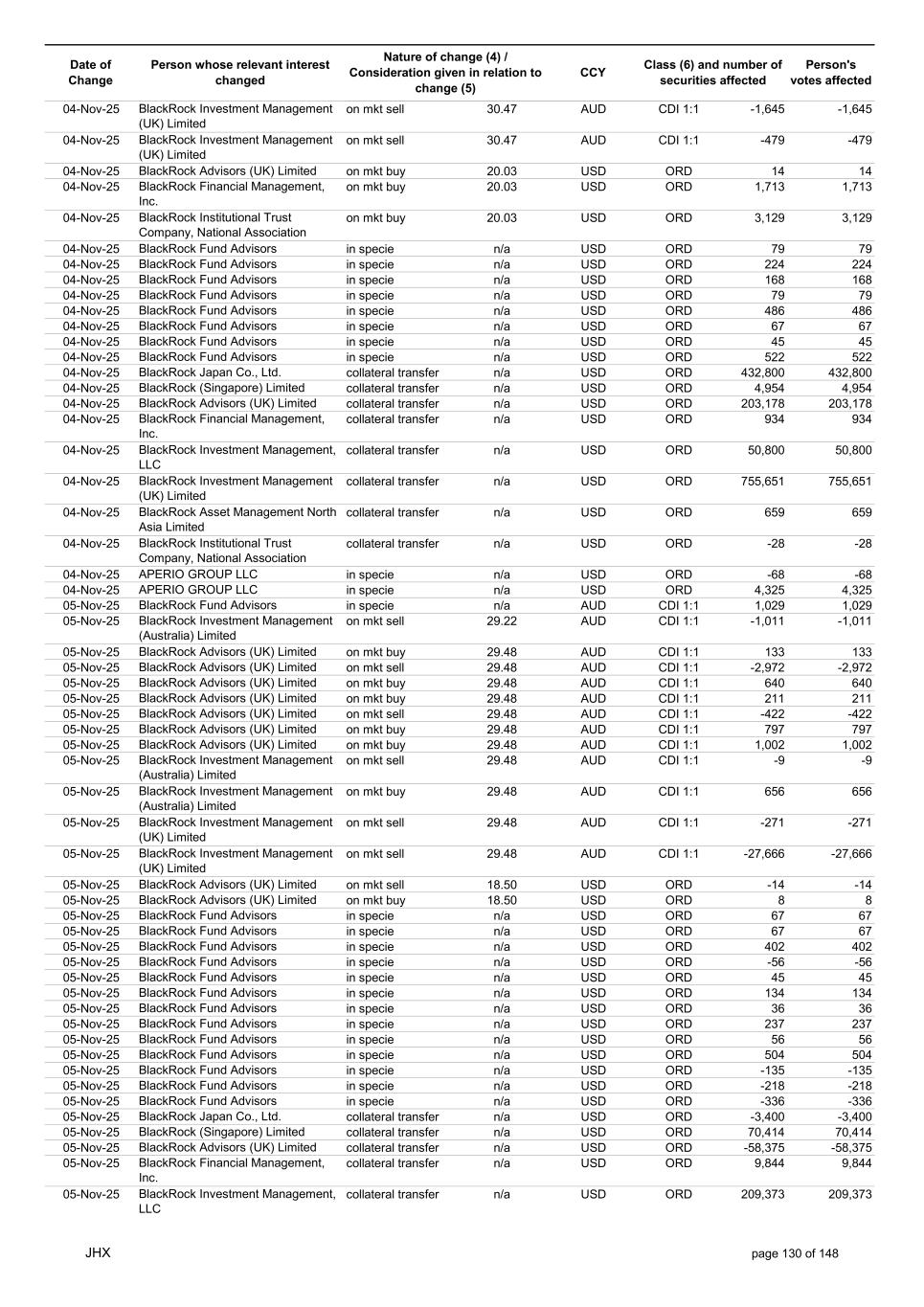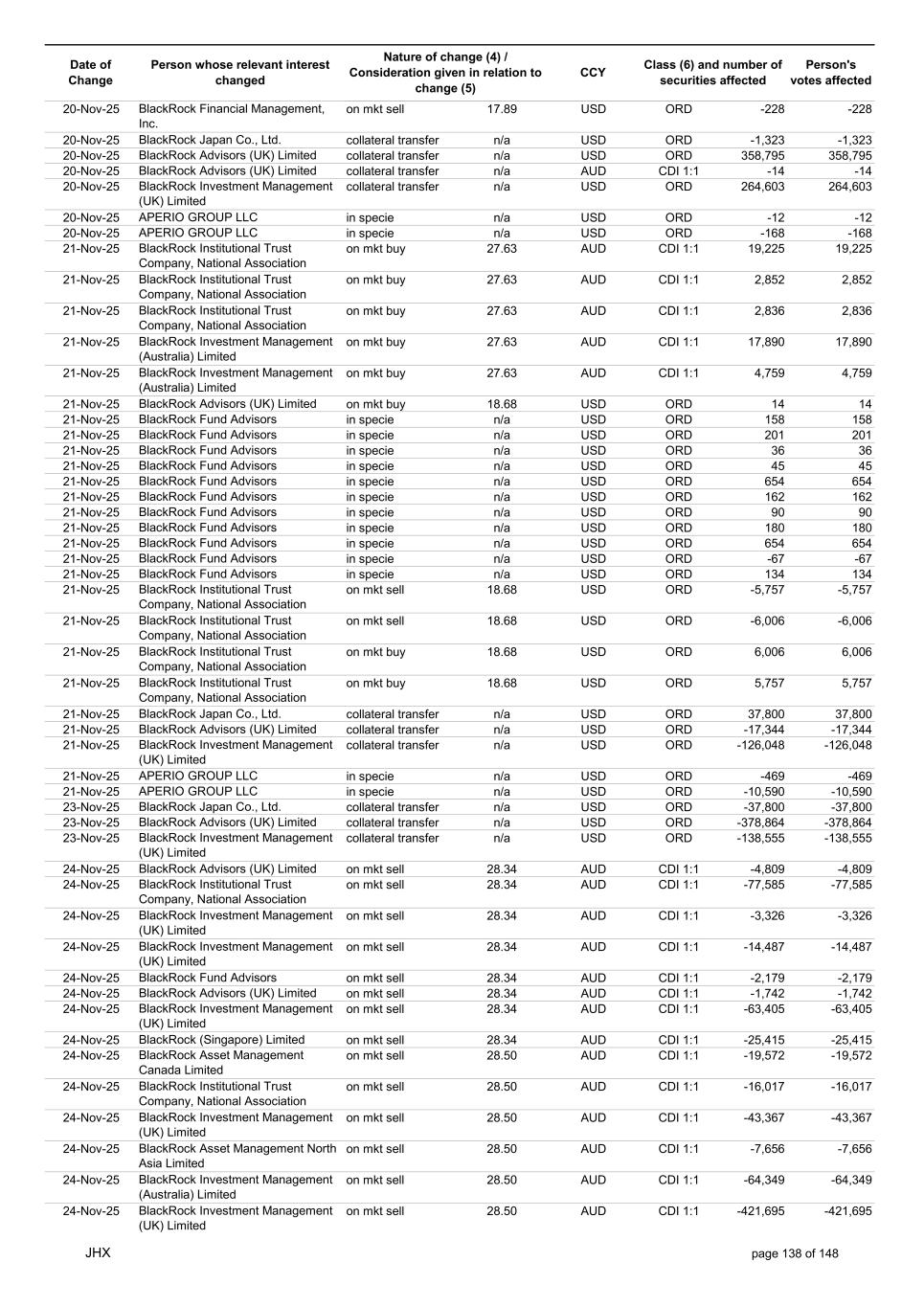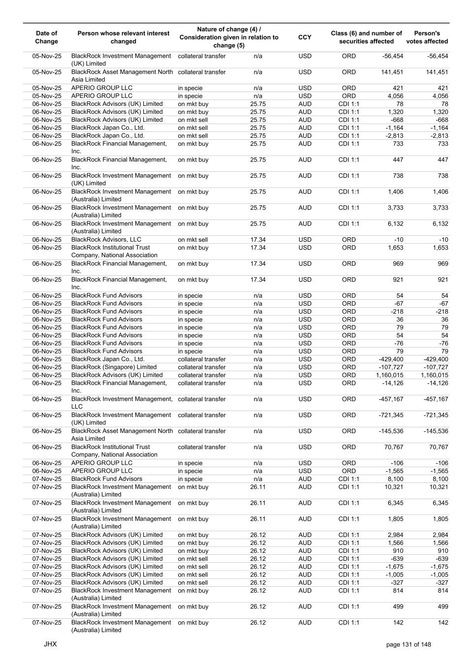 Date of Change Person whose relevant interest changed Nature of change (4) / Consideration given in relation to change (5) Class (6) and number of securities affected Person's votes affected CCY 05-Nov-25 BlackRock Investment Management (UK) Limited collateral transfer n/a USD ORD -56,454 -56,454 05-Nov-25 BlackRock Asset Management North Asia Limited collateral transfer n/a USD ORD 141,451 141,451 05-Nov-25 APERIO GROUP LLC in specie n/a USD ORD 421 421 05-Nov-25 APERIO GROUP LLC in specie n/a USD ORD 4,056 4,056 06-Nov-25 BlackRock Advisors (UK) Limited on mkt buy 25.75 AUD CDI 1:1 78 78 06-Nov-25 BlackRock Advisors (UK) Limited on mkt buy 25.75 AUD CDI 1:1 1,320 1,320 06-Nov-25 BlackRock Advisors (UK) Limited on mkt sell 25.75 AUD CDI 1:1 -668 -668 06-Nov-25 BlackRock Japan Co., Ltd. on mkt sell 25.75 AUD CDI 1:1 -1,164 -1,164 06-Nov-25 BlackRock Japan Co., Ltd. on mkt sell 25.75 AUD CDI 1:1 -2,813 -2,813 06-Nov-25 BlackRock Financial Management, Inc. on mkt buy 25.75 AUD CDI 1:1 733 733 06-Nov-25 BlackRock Financial Management, Inc. on mkt buy 25.75 AUD CDI 1:1 447 447 06-Nov-25 BlackRock Investment Management (UK) Limited on mkt buy 25.75 AUD CDI 1:1 738 738 06-Nov-25 BlackRock Investment Management (Australia) Limited on mkt buy 25.75 AUD CDI 1:1 1,406 1,406 06-Nov-25 BlackRock Investment Management (Australia) Limited on mkt buy 25.75 AUD CDI 1:1 3,733 3,733 06-Nov-25 BlackRock Investment Management (Australia) Limited on mkt buy 25.75 AUD CDI 1:1 6,132 6,132 06-Nov-25 BlackRock Advisors, LLC on mkt sell 17.34 USD ORD -10 -10 06-Nov-25 BlackRock Institutional Trust Company, National Association on mkt buy 17.34 USD ORD 1,653 1,653 06-Nov-25 BlackRock Financial Management, Inc. on mkt buy 17.34 USD ORD 969 969 06-Nov-25 BlackRock Financial Management, Inc. on mkt buy 17.34 USD ORD 921 921 06-Nov-25 BlackRock Fund Advisors in specie n/a USD ORD 54 54 06-Nov-25 BlackRock Fund Advisors in specie n/a USD ORD -67 -67 06-Nov-25 BlackRock Fund Advisors in specie n/a USD ORD -218 -218 06-Nov-25 BlackRock Fund Advisors in specie n/a USD ORD 36 36 06-Nov-25 BlackRock Fund Advisors in specie n/a USD ORD 79 79 06-Nov-25 BlackRock Fund Advisors in specie n/a USD ORD 54 54 06-Nov-25 BlackRock Fund Advisors in specie n/a USD ORD -76 -76 06-Nov-25 BlackRock Fund Advisors in specie n/a USD ORD 79 79 06-Nov-25 BlackRock Japan Co., Ltd. collateral transfer n/a USD ORD -429,400 -429,400 06-Nov-25 BlackRock (Singapore) Limited collateral transfer n/a USD ORD -107,727 -107,727 06-Nov-25 BlackRock Advisors (UK) Limited collateral transfer n/a USD ORD 1,160,015 1,160,015 06-Nov-25 BlackRock Financial Management, Inc. collateral transfer n/a USD ORD -14,126 -14,126 06-Nov-25 BlackRock Investment Management, LLC collateral transfer n/a USD ORD -457,167 -457,167 06-Nov-25 BlackRock Investment Management (UK) Limited collateral transfer n/a USD ORD -721,345 -721,345 06-Nov-25 BlackRock Asset Management North Asia Limited collateral transfer n/a USD ORD -145,536 -145,536 06-Nov-25 BlackRock Institutional Trust Company, National Association collateral transfer n/a USD ORD 70,767 70,767 06-Nov-25 APERIO GROUP LLC in specie n/a USD ORD -106 -106 06-Nov-25 APERIO GROUP LLC in specie n/a USD ORD -1,565 -1,565 07-Nov-25 BlackRock Fund Advisors in specie n/a AUD CDI 1:1 8,100 8,100 07-Nov-25 BlackRock Investment Management (Australia) Limited on mkt buy 26.11 AUD CDI 1:1 10,321 10,321 07-Nov-25 BlackRock Investment Management (Australia) Limited on mkt buy 26.11 AUD CDI 1:1 6,345 6,345 07-Nov-25 BlackRock Investment Management (Australia) Limited on mkt buy 26.11 AUD CDI 1:1 1,805 1,805 07-Nov-25 BlackRock Advisors (UK) Limited on mkt buy 26.12 AUD CDI 1:1 2,984 2,984 07-Nov-25 BlackRock Advisors (UK) Limited on mkt buy 26.12 AUD CDI 1:1 1,566 1,566 07-Nov-25 BlackRock Advisors (UK) Limited on mkt buy 26.12 AUD CDI 1:1 910 910 07-Nov-25 BlackRock Advisors (UK) Limited on mkt sell 26.12 AUD CDI 1:1 -639 -639 07-Nov-25 BlackRock Advisors (UK) Limited on mkt sell 26.12 AUD CDI 1:1 -1,675 -1,675 07-Nov-25 BlackRock Advisors (UK) Limited on mkt sell 26.12 AUD CDI 1:1 -1,005 -1,005 07-Nov-25 BlackRock Advisors (UK) Limited on mkt sell 26.12 AUD CDI 1:1 -327 -327 07-Nov-25 BlackRock Investment Management (Australia) Limited on mkt buy 26.12 AUD CDI 1:1 814 814 07-Nov-25 BlackRock Investment Management (Australia) Limited on mkt buy 26.12 AUD CDI 1:1 499 499 07-Nov-25 BlackRock Investment Management (Australia) Limited on mkt buy 26.12 AUD CDI 1:1 142 142 JHX page 131 of 148