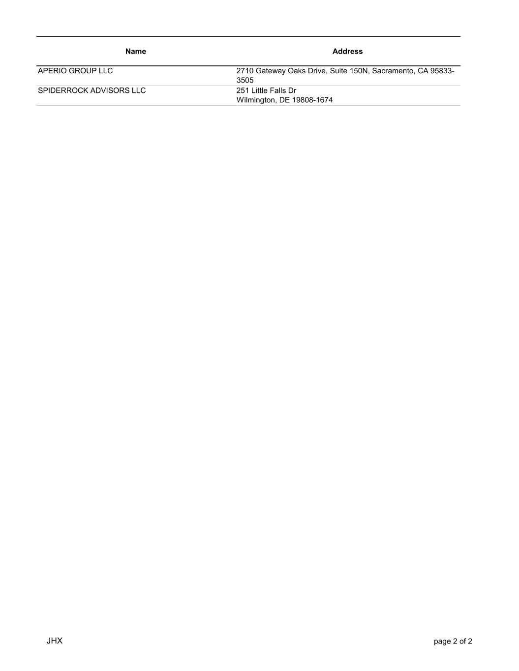 Name Address APERIO GROUP LLC 2710 Gateway Oaks Drive, Suite 150N, Sacramento, CA 95833- 3505 SPIDERROCK ADVISORS LLC 251 Little Falls Dr Wilmington, DE 19808-1674 JHX page 2 of 2