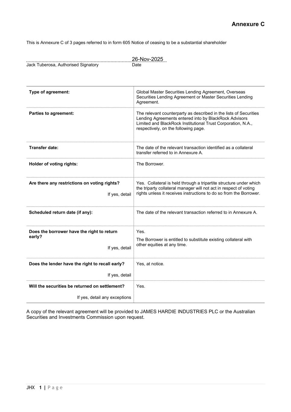 JHX 1 | P a g e Annexure C This is Annexure C of 3 pages referred to in form 605 Notice of ceasing to be a substantial shareholder 26-Nov-2025 Jack Tuberosa, Authorised Signatory Date Type of agreement: Global Master Securities Lending Agreement, Overseas Securities Lending Agreement or Master Securities Lending Agreement. Parties to agreement: The relevant counterparty as described in the lists of Securities Lending Agreements entered into by BlackRock Advisors Limited and BlackRock Institutional Trust Corporation, N.A., respectively, on the following page. Transfer date: The date of the relevant transaction identified as a collateral transfer referred to in Annexure A. Holder of voting rights: The Borrower. Are there any restrictions on voting rights? Yes. Collateral is held through a tripartite structure under which the triparty collateral manager will not act in respect of voting rights unless it receives instructions to do so from the Borrower. If yes, detail Scheduled return date (if any): The date of the relevant transaction referred to in Annexure A. Does the borrower have the right to return early? Yes. The Borrower is entitled to substitute existing collateral with other equities at any time. If yes, detail Does the lender have the right to recall early? Yes, at notice. If yes, detail Will the securities be returned on settlement? Yes. If yes, detail any exceptions A copy of the relevant agreement will be provided to JAMES HARDIE INDUSTRIES PLC or the Australian Securities and Investments Commission upon request.