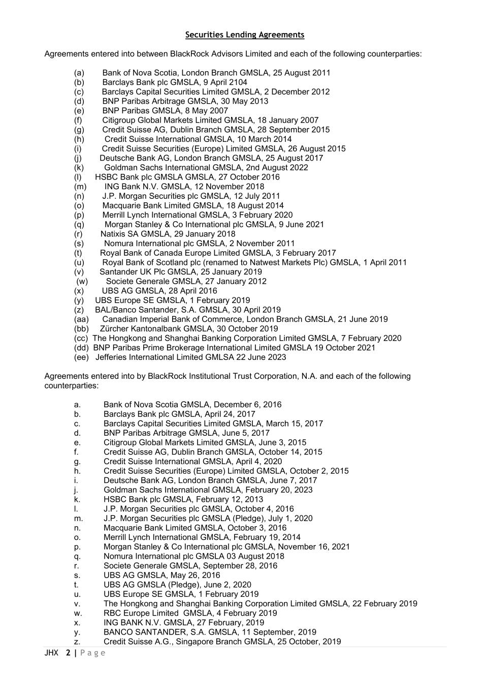 JHX 2 | P a g e Securities Lending Agreements Agreements entered into between BlackRock Advisors Limited and each of the following counterparties: (a) Bank of Nova Scotia, London Branch GMSLA, 25 August 2011 (b) Barclays Bank plc GMSLA, 9 April 2104 (c) Barclays Capital Securities Limited GMSLA, 2 December 2012 (d) BNP Paribas Arbitrage GMSLA, 30 May 2013 (e) BNP Paribas GMSLA, 8 May 2007 (f) Citigroup Global Markets Limited GMSLA, 18 January 2007 (g) Credit Suisse AG, Dublin Branch GMSLA, 28 September 2015 (h) Credit Suisse International GMSLA, 10 March 2014 (i) Credit Suisse Securities (Europe) Limited GMSLA, 26 August 2015 (j) Deutsche Bank AG, London Branch GMSLA, 25 August 2017 (k) Goldman Sachs International GMSLA, 2nd August 2022 (l) HSBC Bank plc GMSLA GMSLA, 27 October 2016 (m) ING Bank N.V. GMSLA, 12 November 2018 (n) J.P. Morgan Securities plc GMSLA, 12 July 2011 (o) Macquarie Bank Limited GMSLA, 18 August 2014 (p) Merrill Lynch International GMSLA, 3 February 2020 (q) Morgan Stanley & Co International plc GMSLA, 9 June 2021 (r) Natixis SA GMSLA, 29 January 2018 (s) Nomura International plc GMSLA, 2 November 2011 (t) Royal Bank of Canada Europe Limited GMSLA, 3 February 2017 (u) Royal Bank of Scotland plc (renamed to Natwest Markets Plc) GMSLA, 1 April 2011 (v) Santander UK Plc GMSLA, 25 January 2019 (w) Societe Generale GMSLA, 27 January 2012 (x) UBS AG GMSLA, 28 April 2016 (y) UBS Europe SE GMSLA, 1 February 2019 (z) BAL/Banco Santander, S.A. GMSLA, 30 April 2019 (aa) Canadian Imperial Bank of Commerce, London Branch GMSLA, 21 June 2019 (bb) Zürcher Kantonalbank GMSLA, 30 October 2019 (cc) The Hongkong and Shanghai Banking Corporation Limited GMSLA, 7 February 2020 (dd) BNP Paribas Prime Brokerage International Limited GMSLA 19 October 2021 (ee) Jefferies International Limited GMLSA 22 June 2023 Agreements entered into by BlackRock Institutional Trust Corporation, N.A. and each of the following counterparties: a. Bank of Nova Scotia GMSLA, December 6, 2016 b. Barclays Bank plc GMSLA, April 24, 2017 c. Barclays Capital Securities Limited GMSLA, March 15, 2017 d. BNP Paribas Arbitrage GMSLA, June 5, 2017 e. Citigroup Global Markets Limited GMSLA, June 3, 2015 f. Credit Suisse AG, Dublin Branch GMSLA, October 14, 2015 g. Credit Suisse International GMSLA, April 4, 2020 h. Credit Suisse Securities (Europe) Limited GMSLA, October 2, 2015 i. Deutsche Bank AG, London Branch GMSLA, June 7, 2017 j. Goldman Sachs International GMSLA, February 20, 2023 k. HSBC Bank plc GMSLA, February 12, 2013 l. J.P. Morgan Securities plc GMSLA, October 4, 2016 m. J.P. Morgan Securities plc GMSLA (Pledge), July 1, 2020 n. Macquarie Bank Limited GMSLA, October 3, 2016 o. Merrill Lynch International GMSLA, February 19, 2014 p. Morgan Stanley & Co International plc GMSLA, November 16, 2021 q. Nomura International plc GMSLA 03 August 2018 r. Societe Generale GMSLA, September 28, 2016 s. UBS AG GMSLA, May 26, 2016 t. UBS AG GMSLA (Pledge), June 2, 2020 u. UBS Europe SE GMSLA, 1 February 2019 v. The Hongkong and Shanghai Banking Corporation Limited GMSLA, 22 February 2019 w. RBC Europe Limited GMSLA, 4 February 2019 x. ING BANK N.V. GMSLA, 27 February, 2019 y. BANCO SANTANDER, S.A. GMSLA, 11 September, 2019 z. Credit Suisse A.G., Singapore Branch GMSLA, 25 October, 2019