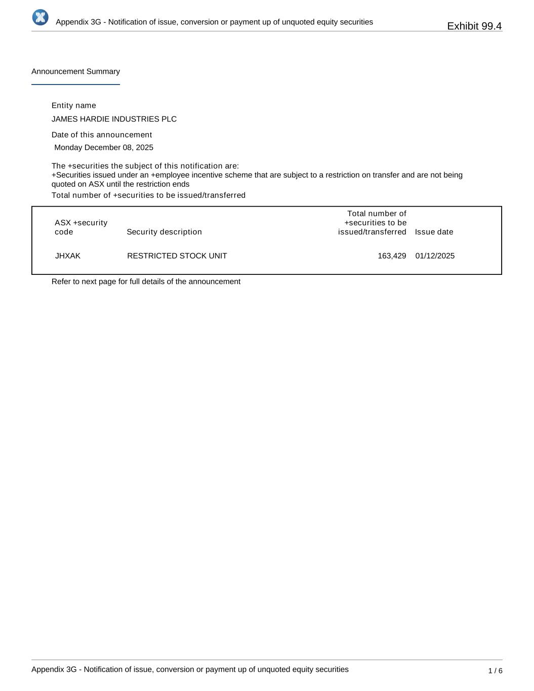 Appendix 3G - Notification of issue, conversion or payment up of unquoted equity securities Appendix 3G - Notification of issue, conversion or payment up of unquoted equity securities 1 / 6 Announcement Summary Entity name JAMES HARDIE INDUSTRIES PLC Date of this announcement Monday December 08, 2025 The +securities the subject of this notification are: Total number of +securities to be issued/transferred ASX +security code Security description Total number of +securities to be issued/transferred Issue date JHXAK RESTRICTED STOCK UNIT 163,429 01/12/2025 Refer to next page for full details of the announcement +Securities issued under an +employee incentive scheme that are subject to a restriction on transfer and are not being quoted on ASX until the restriction ends