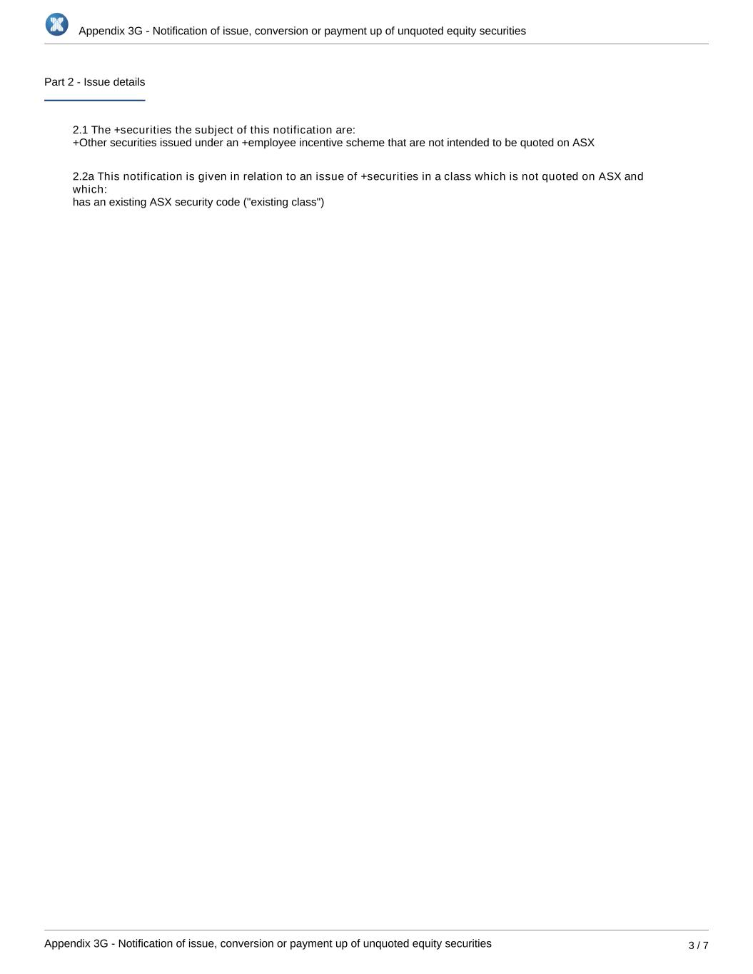 Appendix 3G - Notification of issue, conversion or payment up of unquoted equity securities Appendix 3G - Notification of issue, conversion or payment up of unquoted equity securities 3 / 7 Part 2 - Issue details 2.1 The +securities the subject of this notification are: 2.2a This notification is given in relation to an issue of +securities in a class which is not quoted on ASX and which: has an existing ASX security code ("existing class") +Other securities issued under an +employee incentive scheme that are not intended to be quoted on ASX