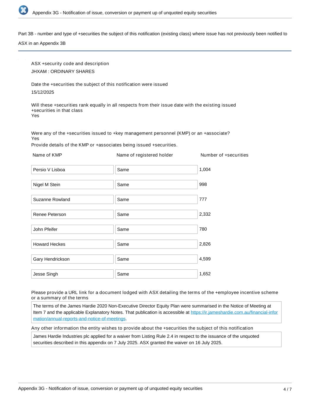 Appendix 3G - Notification of issue, conversion or payment up of unquoted equity securities Appendix 3G - Notification of issue, conversion or payment up of unquoted equity securities 4 / 7 Part 3B - number and type of +securities the subject of this notification (existing class) where issue has not previously been notified to ASX in an Appendix 3B ASX +security code and description JHXAM : ORDINARY SHARES Date the +securities the subject of this notification were issued 15/12/2025 Will these +securities rank equally in all respects from their issue date with the existing issued +securities in that class Were any of the +securities issued to +key management personnel (KMP) or an +associate? Provide details of the KMP or +associates being issued +securities. Name of KMP Name of registered holder Number of +securities Persio V Lisboa Same 1,004 Nigel M Stein Same 998 Suzanne Rowland Same 777 Renee Peterson Same 2,332 John Pfeifer Same 780 Howard Heckes Same 2,826 Gary Hendrickson Same 4,599 Jesse Singh Same 1,652 Please provide a URL link for a document lodged with ASX detailing the terms of the +employee incentive scheme or a summary of the terms The terms of the James Hardie 2020 Non-Executive Director Equity Plan were summarised in the Notice of Meeting at Item 7 and the applicable Explanatory Notes. That publication is accessible at https://ir.jameshardie.com.au/financial-infor . mation/annual-reports-and-notice-of-meetings Any other information the entity wishes to provide about the +securities the subject of this notification James Hardie Industries plc applied for a waiver from Listing Rule 2.4 in respect to the issuance of the unquoted securities described in this appendix on 7 July 2025. ASX granted the waiver on 16 July 2025. Yes Yes