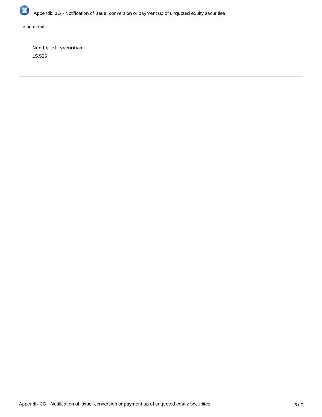 Appendix 3G - Notification of issue, conversion or payment up of unquoted equity securities Appendix 3G - Notification of issue, conversion or payment up of unquoted equity securities 5 / 7 Issue details Number of +securities 15,525