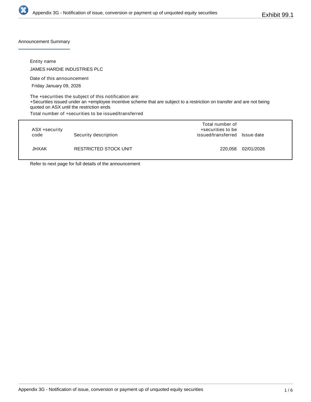 Appendix 3G - Notification of issue, conversion or payment up of unquoted equity securities Appendix 3G - Notification of issue, conversion or payment up of unquoted equity securities 1 / 6 Announcement Summary Entity name JAMES HARDIE INDUSTRIES PLC Date of this announcement Friday January 09, 2026 The +securities the subject of this notification are: Total number of +securities to be issued/transferred ASX +security code Security description Total number of +securities to be issued/transferred Issue date JHXAK RESTRICTED STOCK UNIT 220,058 02/01/2026 Refer to next page for full details of the announcement +Securities issued under an +employee incentive scheme that are subject to a restriction on transfer and are not being quoted on ASX until the restriction ends